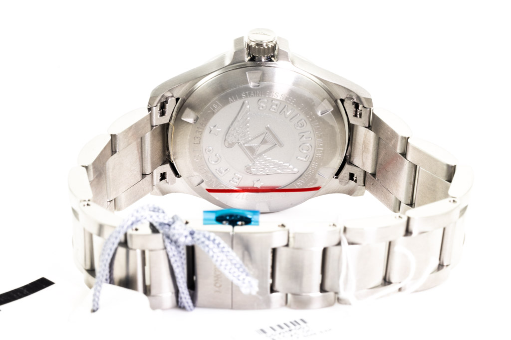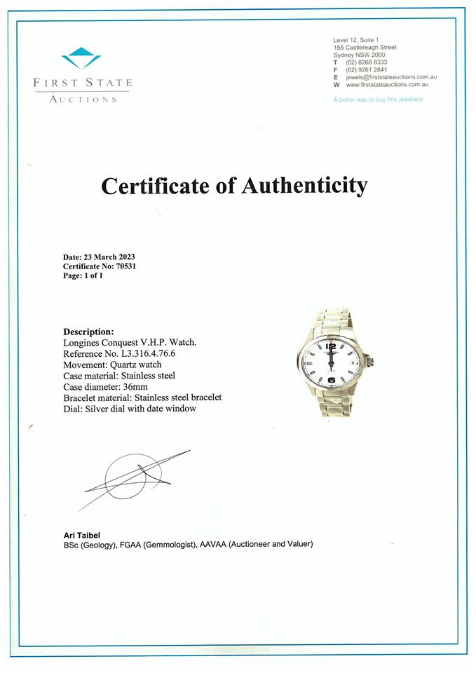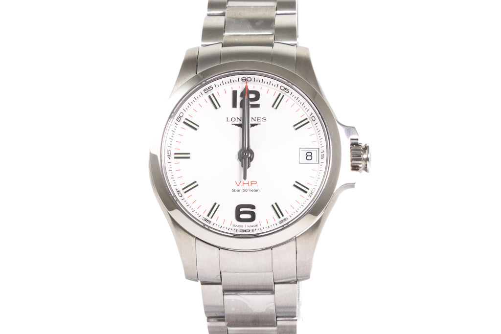 Longines Conquest V.H.P. stainless steel quartz watch. Silver dial, date, case diameter 36mm, wrist size: 16.5cm, Swiss made. Ref# L3.316.4.76.6. With Longines stainless steel bracelet and clasp. With FSA Certificate of Authenticity and Longines box. 3 month FSA warranty. (As New, Note: minor scratches on case and bracelet due to being display stock)