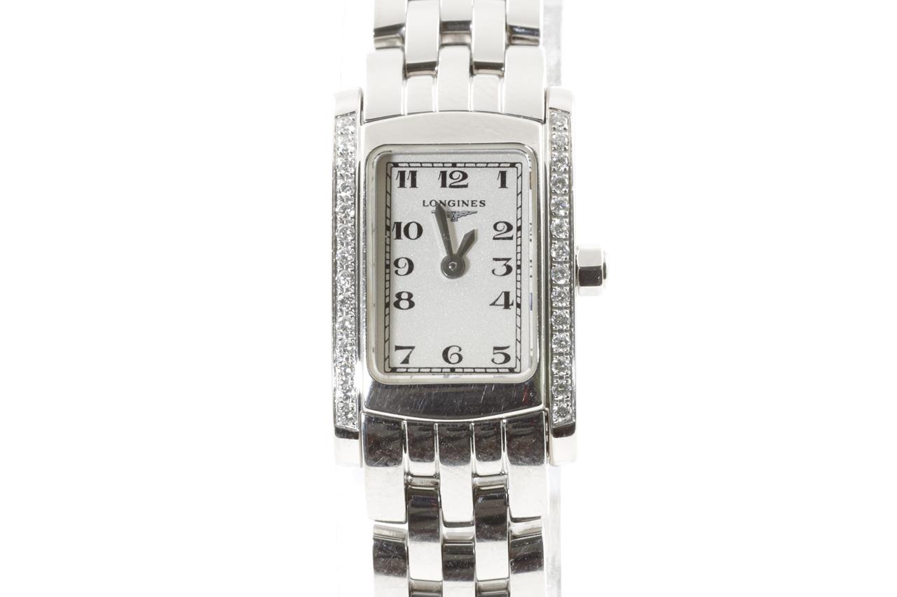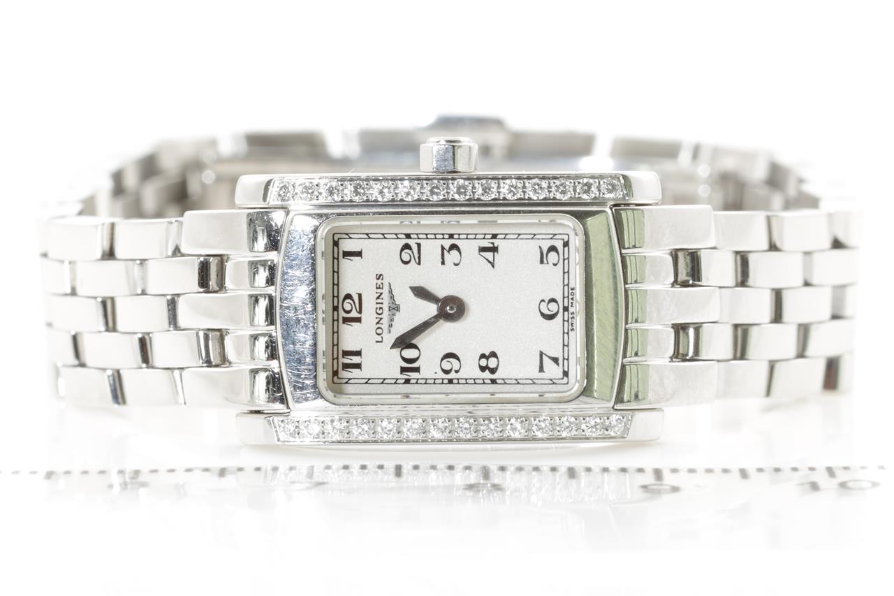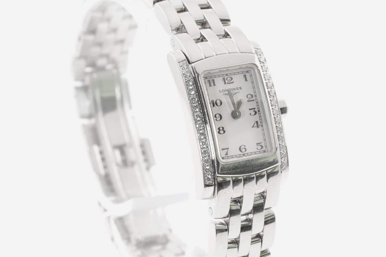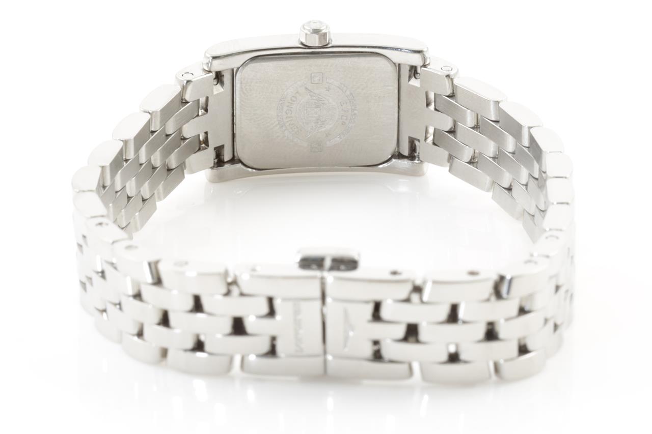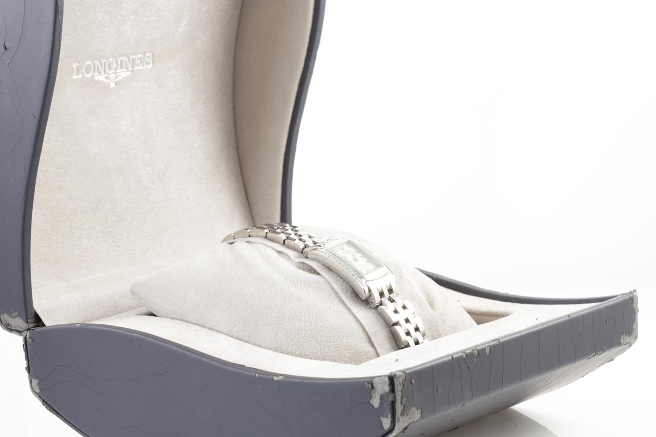 Longines Dolce Vita stainless steel quartz ladies watch. White dial, diamond bezel, case diameter: 20mm x 16mm, wrist size: 15.5cm, Swiss made. Ref# L5.158.0. With Longines stainless steel bracelet and clasp. With certificate of authenticity and Longines box. 3 month FSA warranty. (Pre-owned)
