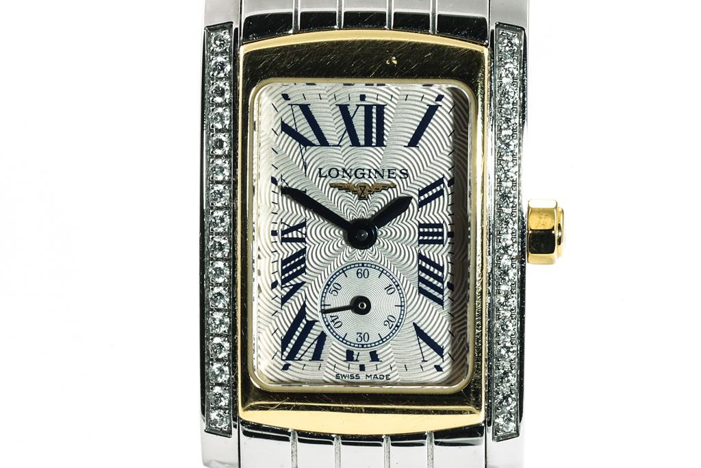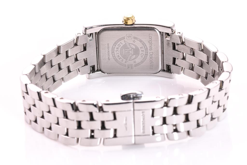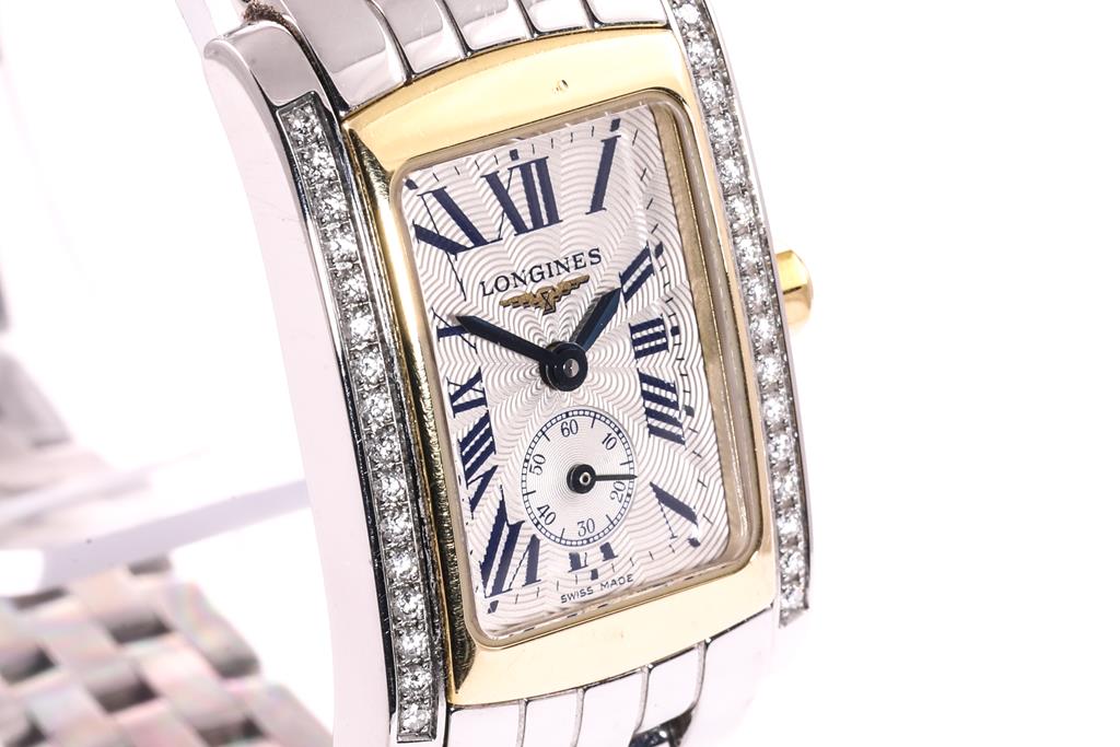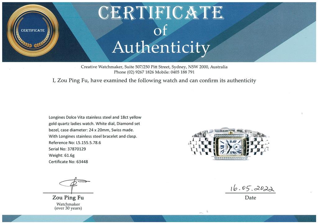 1840/ 188: Longines Dolce Vita stainless steel and 18ct yellow gold quartz ladies watch. White dial, Diamond set bezel, case diameter: 24 x 20mm, wrist size: 16.5cm, Swiss made. Ref# L5.155.5.78.6. With Longines stainless steel bracelet and clasp. With Certificate of Authenticity, Longines International Warranty card dated 02/09/2015, Longines Diamond Cerfificate and Longines box. 3 month FSA warranty. (Pre-owned)
