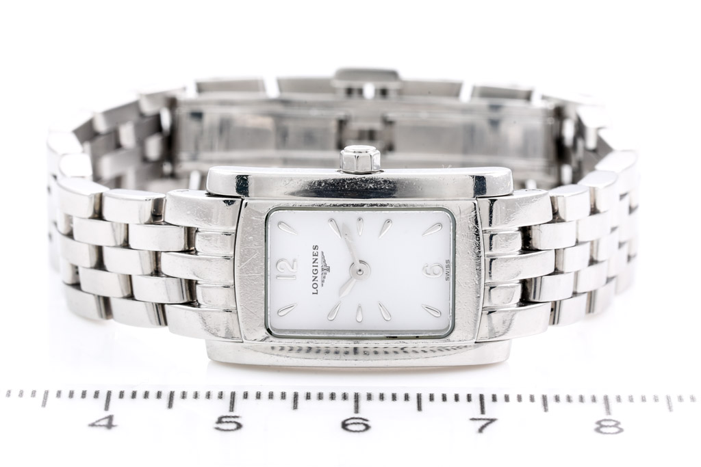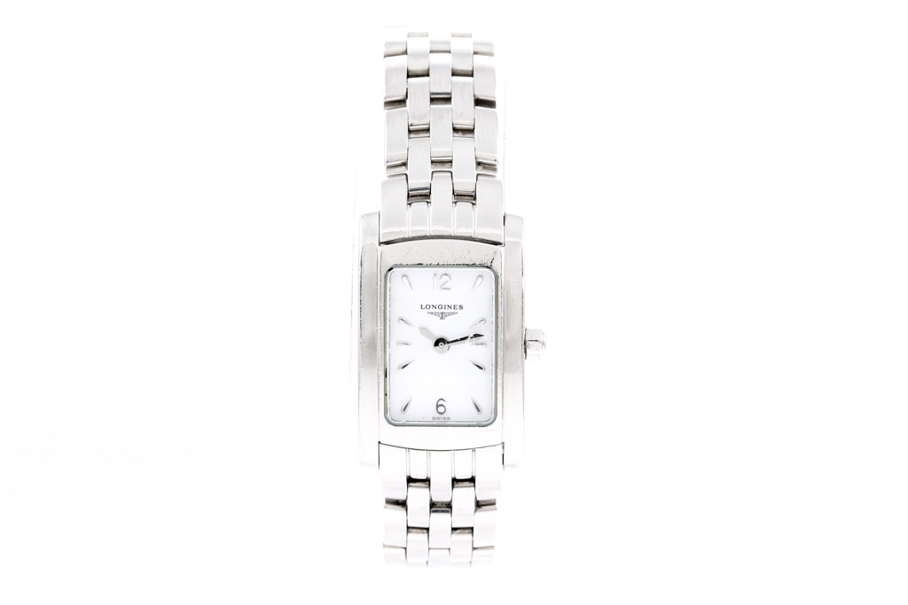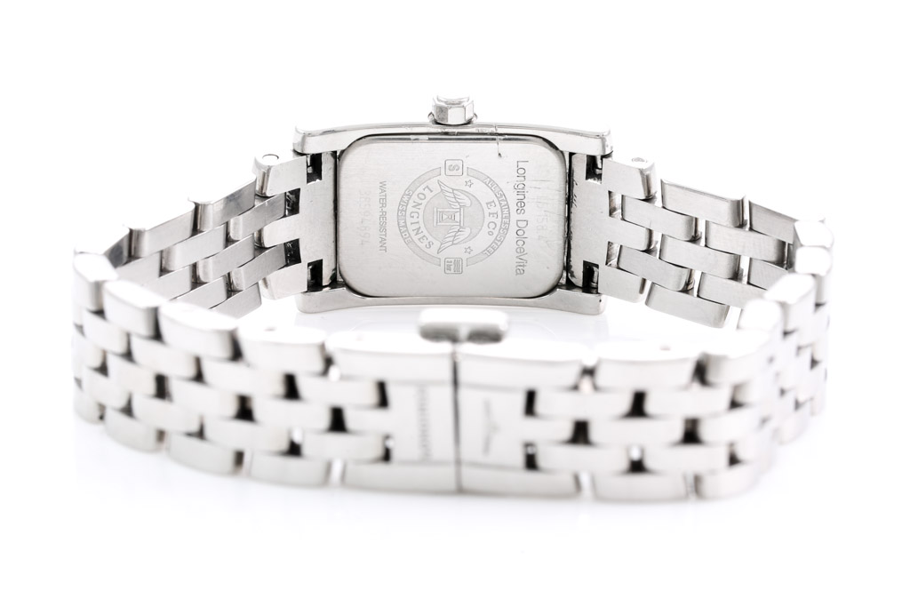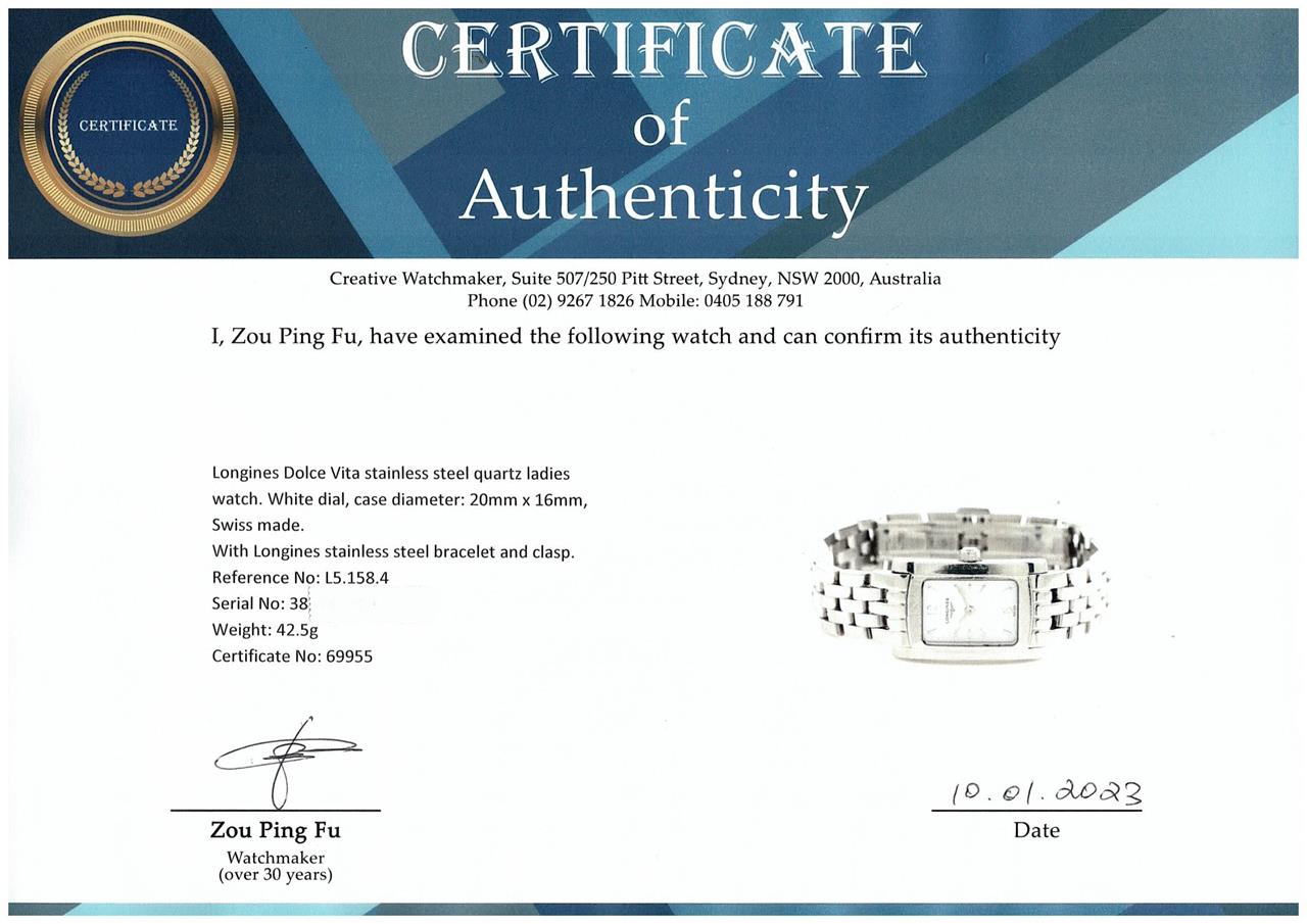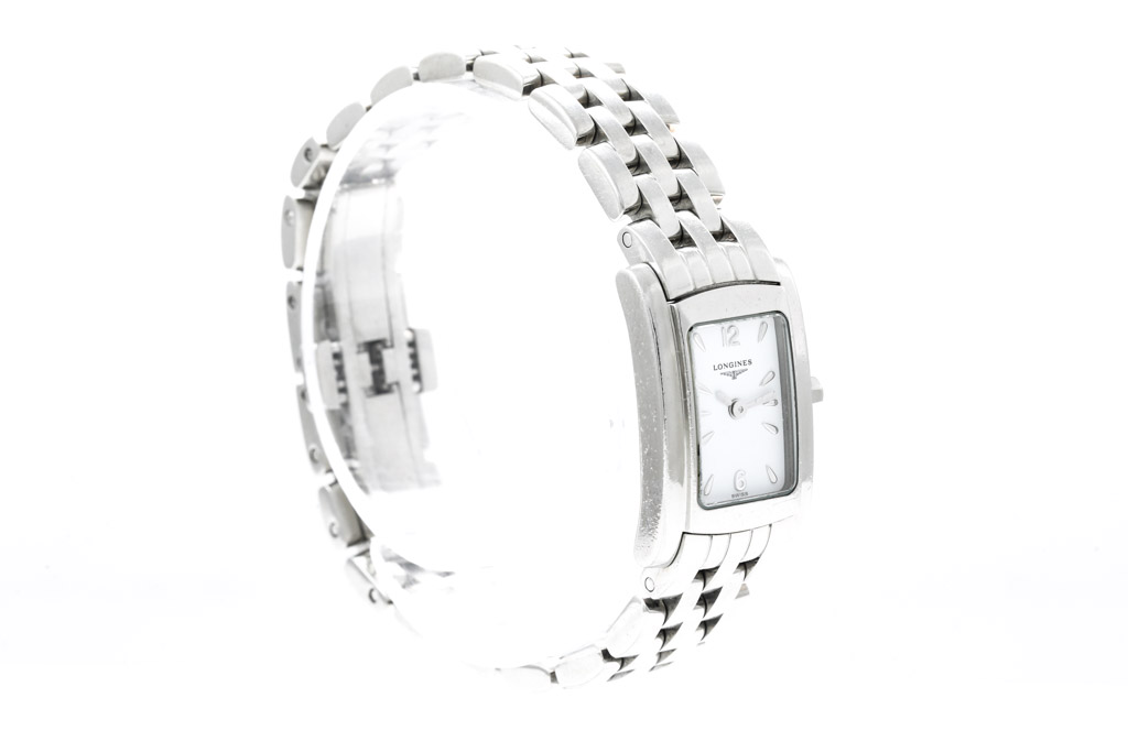 Longines Dolce Vita stainless steel quartz ladies watch. White dial, case diameter: 20mm x 16mm, wrist size: 14.5cm, Swiss made. Ref# L5.158.4. With Longines stainless steel bracelet and clasp. With Certificate of Authenticity. 3 month FSA warranty (Pre-owned).