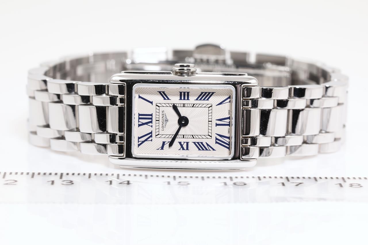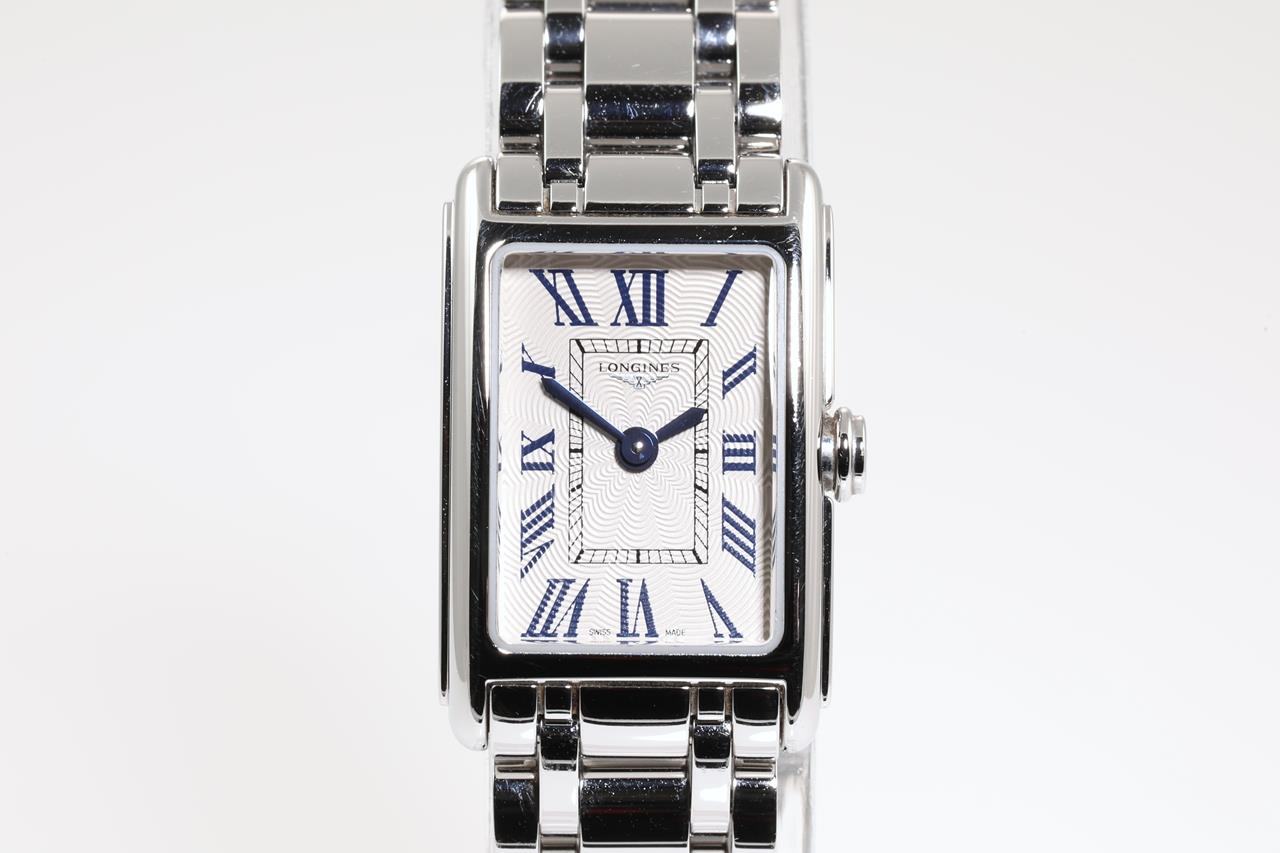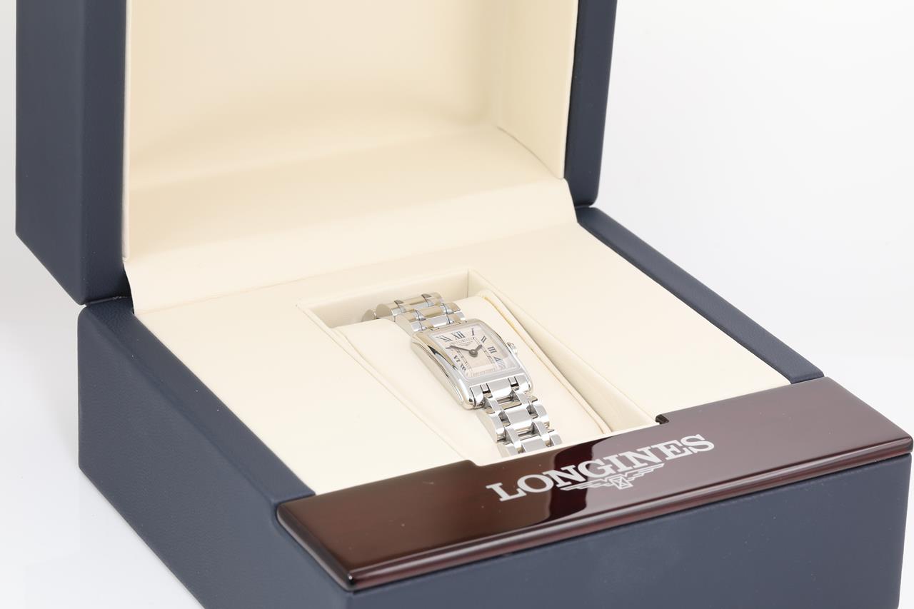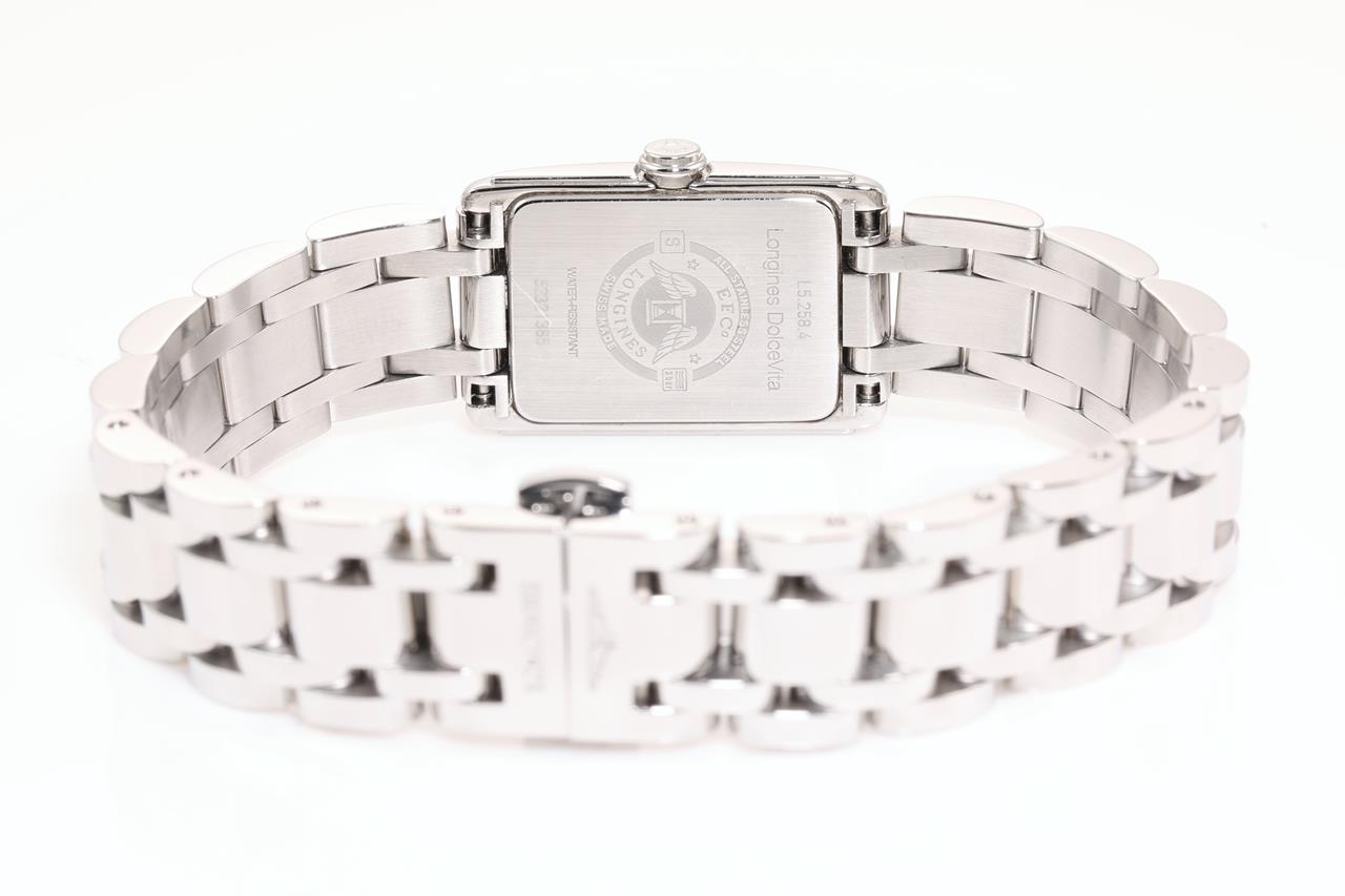 Longines DolceVita stainless steel quartz ladies watch. Silver flinque dial, case diameter: 27mm x 17.7mm, wrist size: 17cm, Swiss made. Ref# L5.258.4. With Longines stainless steel bracelet and clasp. With certificate of authenticity and Longines Box. 3 month FSA warranty. (Pre-owned)