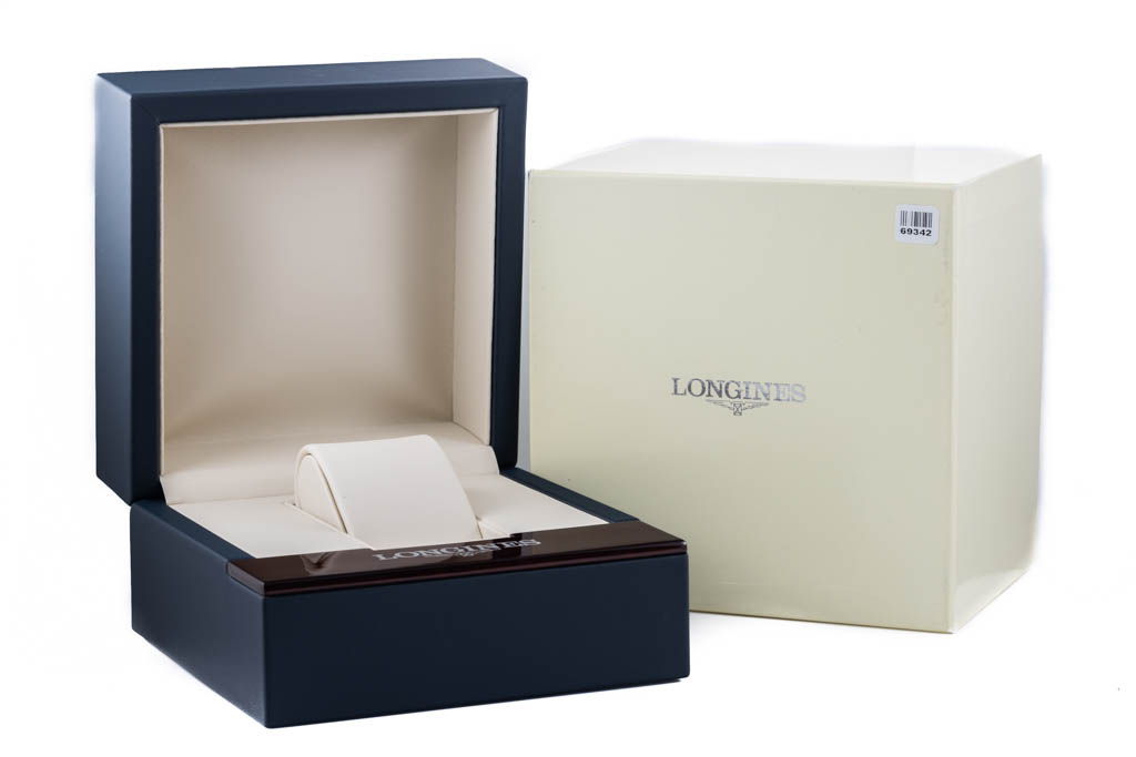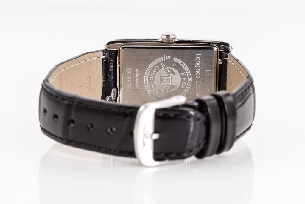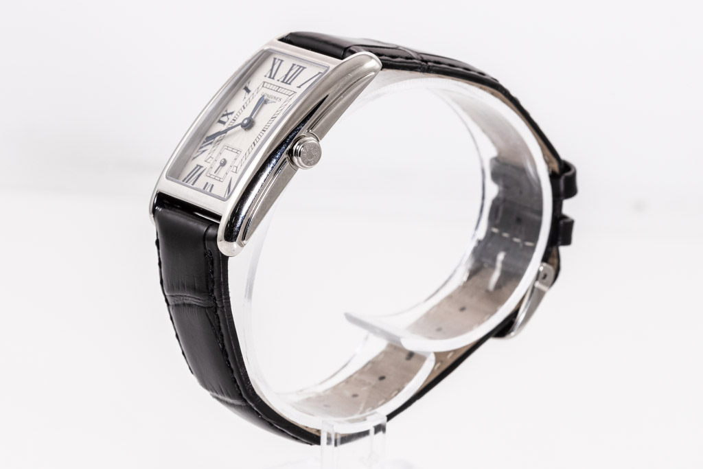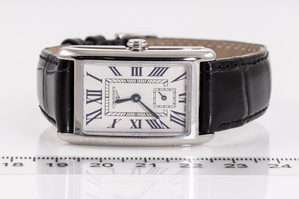 Longines DolceVita stainless steel quartz ladies watch. Silver dial, small second, case diameter: 37mm x 23.3mm, strap length: 18.5cm, Swiss made. Ref# L55124710. With Longines black leather strap and buckle. With Longines International Warranty card - to be registered online and details will be provided. With Longines box. (As new, Note: minor scratches on case and light wear on strap due to being display stock)