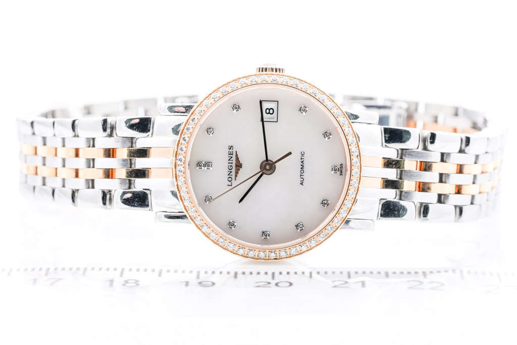 Longines Elegant Collection 18ct rose gold and stainless steel automatic ladies watch. Mother of Pearl dial, date, Diamond indicators, Diamond set bezel, case diameter: 25.5mm, wrist size: 18cm. Swiss made. Ref# L43095887. With Longines two tone bracelet and clasp. No warranty card provided - warranty applies to be registered online, details will be provided. (As New, Note: minor scratches on case and bracelet due to display stock)