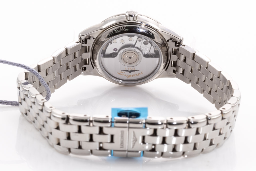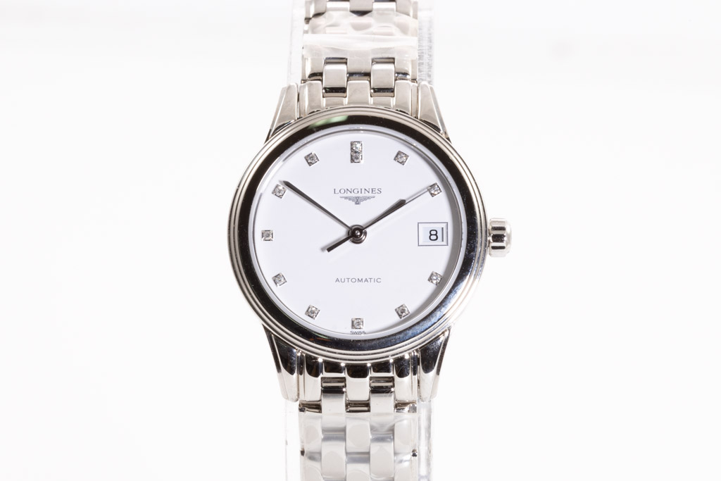 Longines Flagship stainless steel automatic ladies watch. White dial, date, Diamond indicators, case diameter: 26mm, wrist size: 17.5cm, Swiss made. Ref# L42744276. With Longines stainless steel bracelet and clasp. With Longines International Warranty card and Longines box. Longines 2 year warranty applies. (As New, Note: minor scratches on case and bracelet due to being display stock)