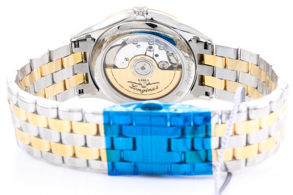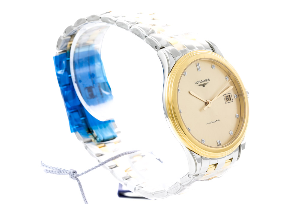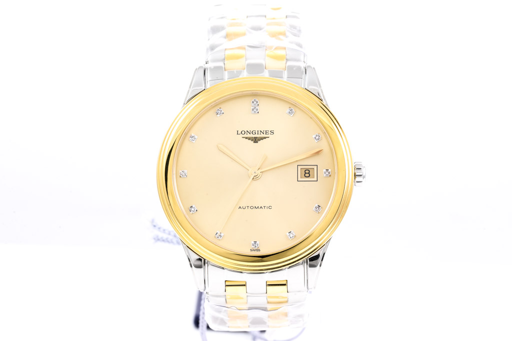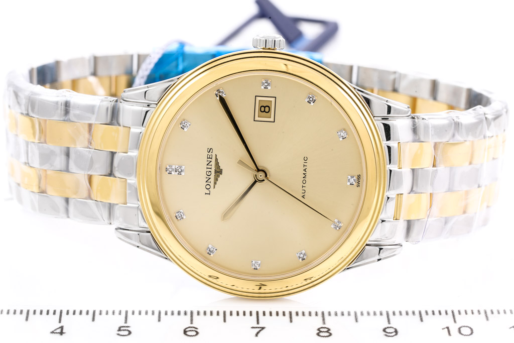 Longines Flagship stainless steel and yellow PVD coating automatic mens watch. Gold dial, Diamond indicators, date, case diameter: 38.5mm, wrist size: 19.5cm, Swiss made. Ref# L49743377. With Longines two tone bracelet and clasp. With Longines International Warranty card - to be registered online and details will be provided. With Longines box. (As New, Note: minor scratches on case due to being display stock and bracelet in original wrapping)