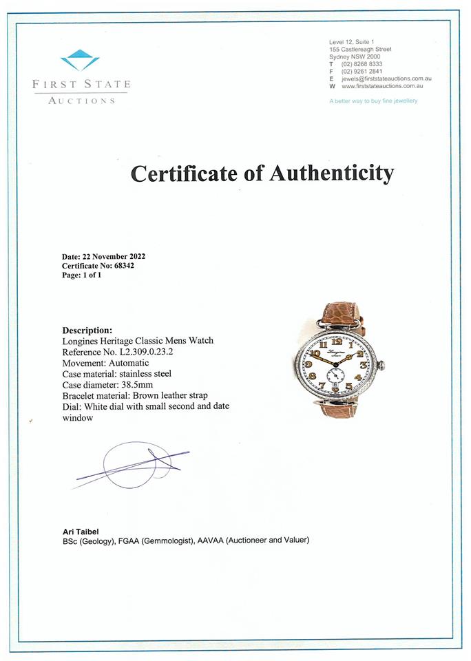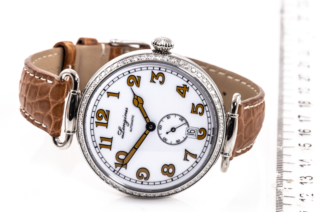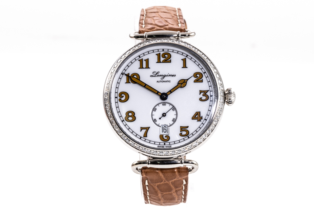 Longines Heritage Classic stainless steel automatic mens watch. White dial, Diamond set bezel, date, small second, case diameter: 38.5mm, strap length: 20.5cm, Swiss made. Ref# L2.309.0.23.2. With Longines brown leather strap and clasp. With FSA Certificate of Authenticity, Longines Instructions booklet and Longines box. 3 month FSA warranty. (As New, Note: light wear on bracelet and minor scratches on case due to being display stock)