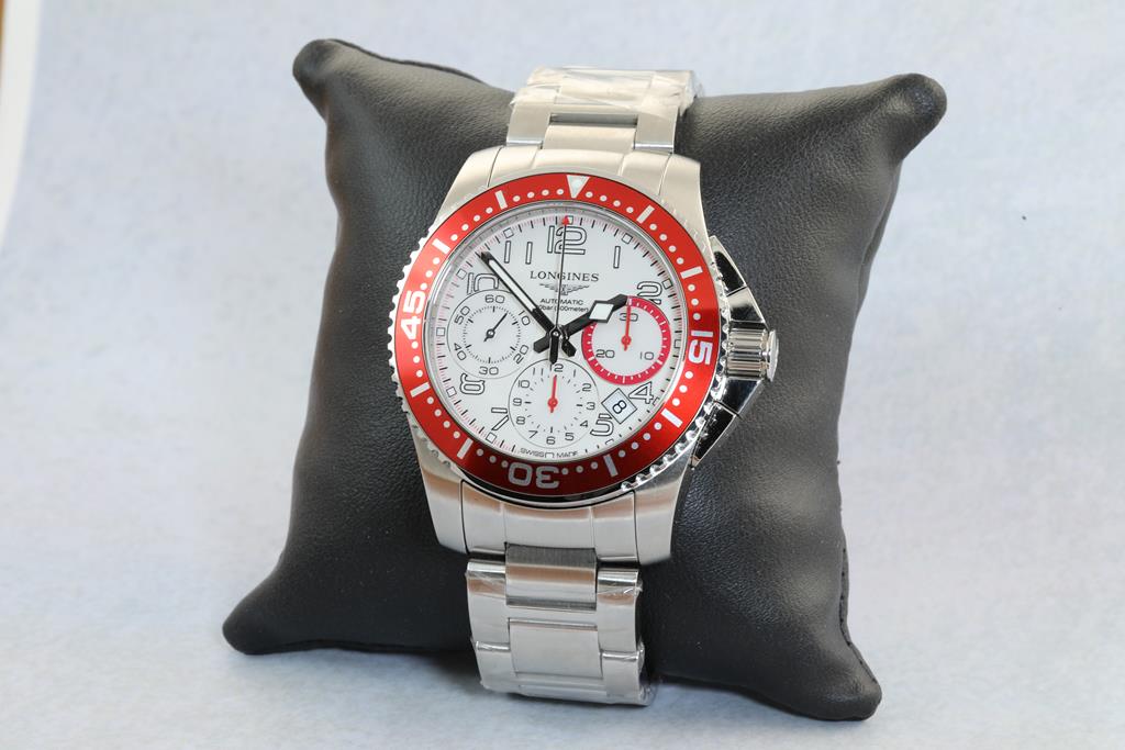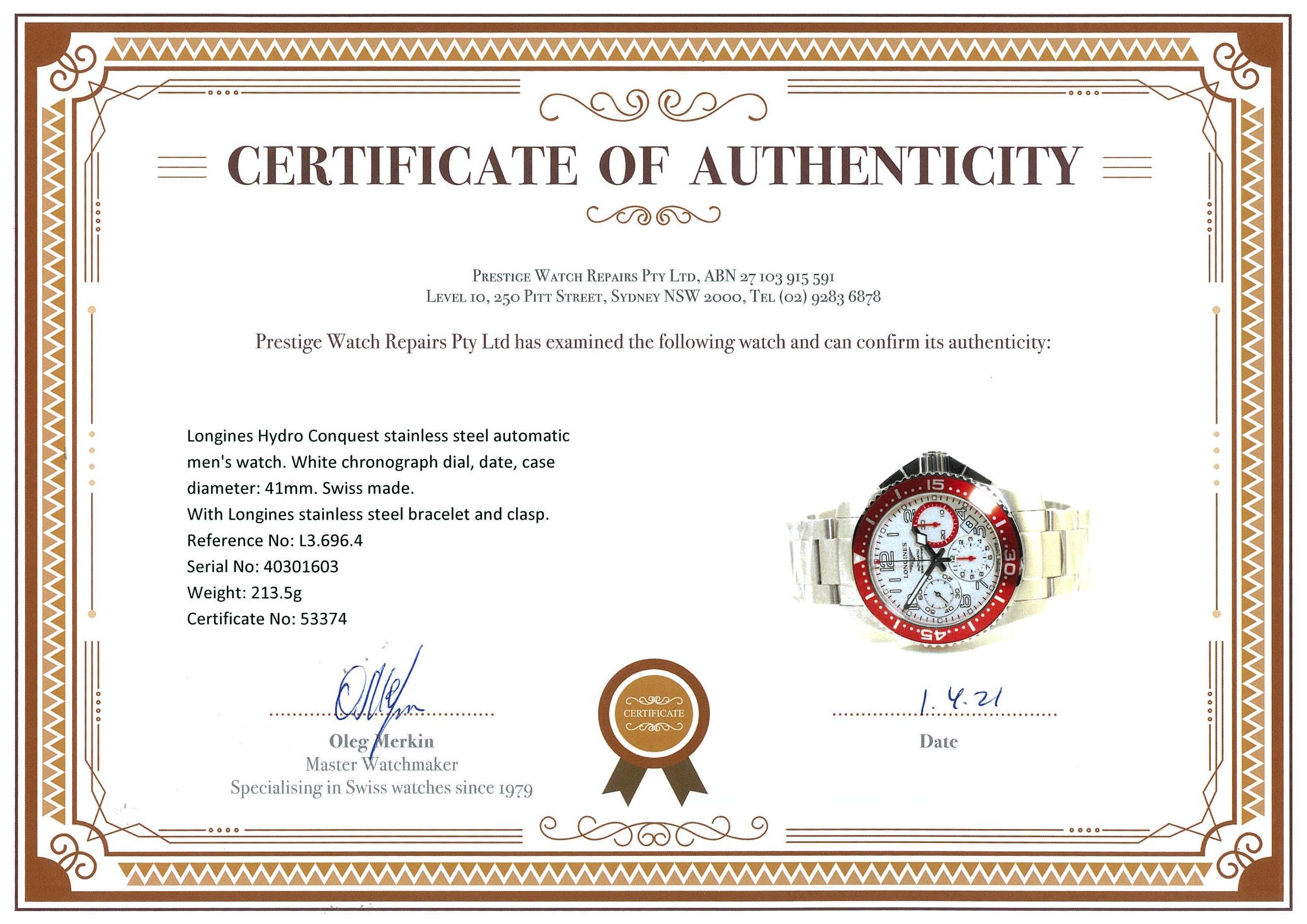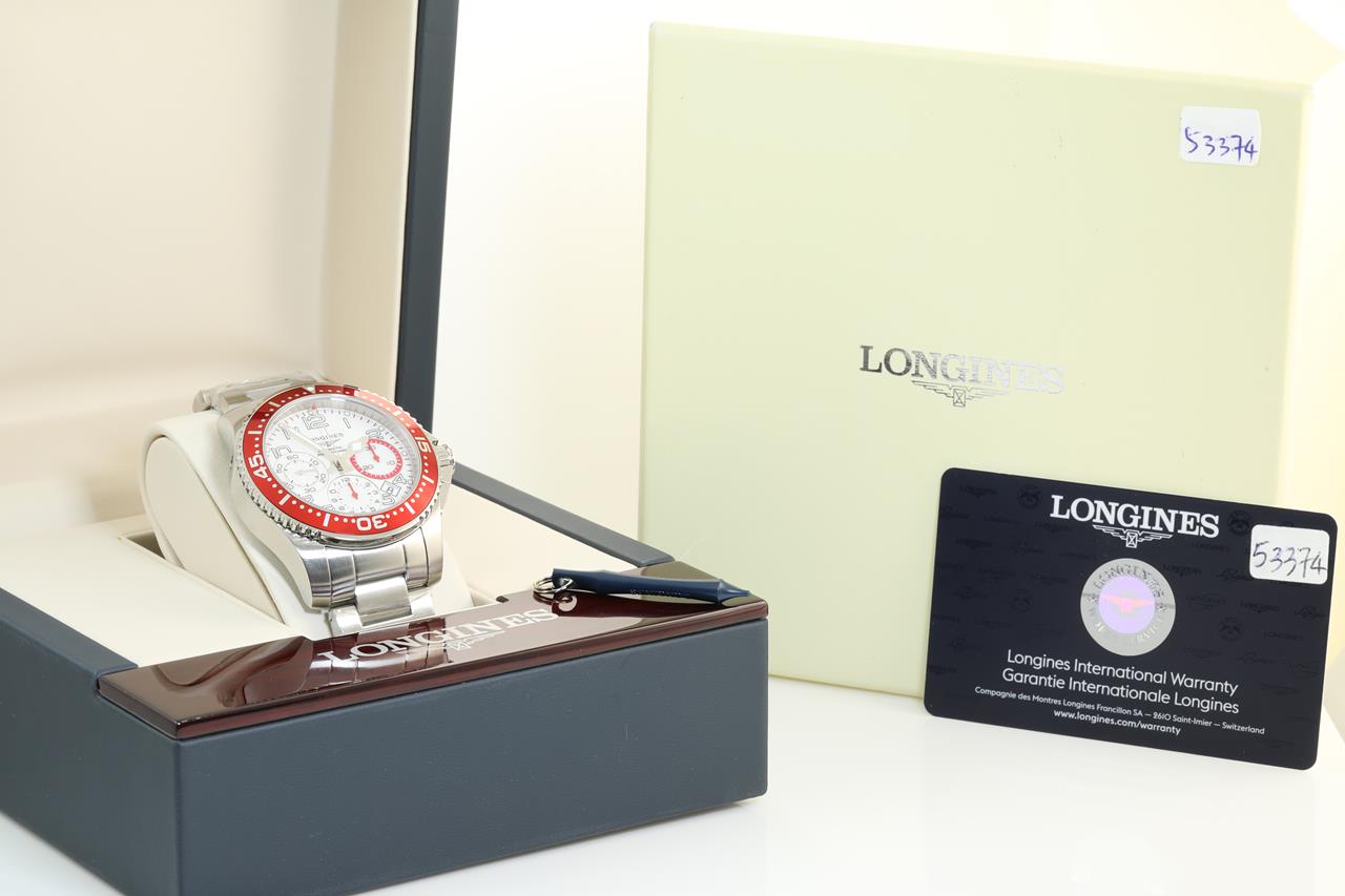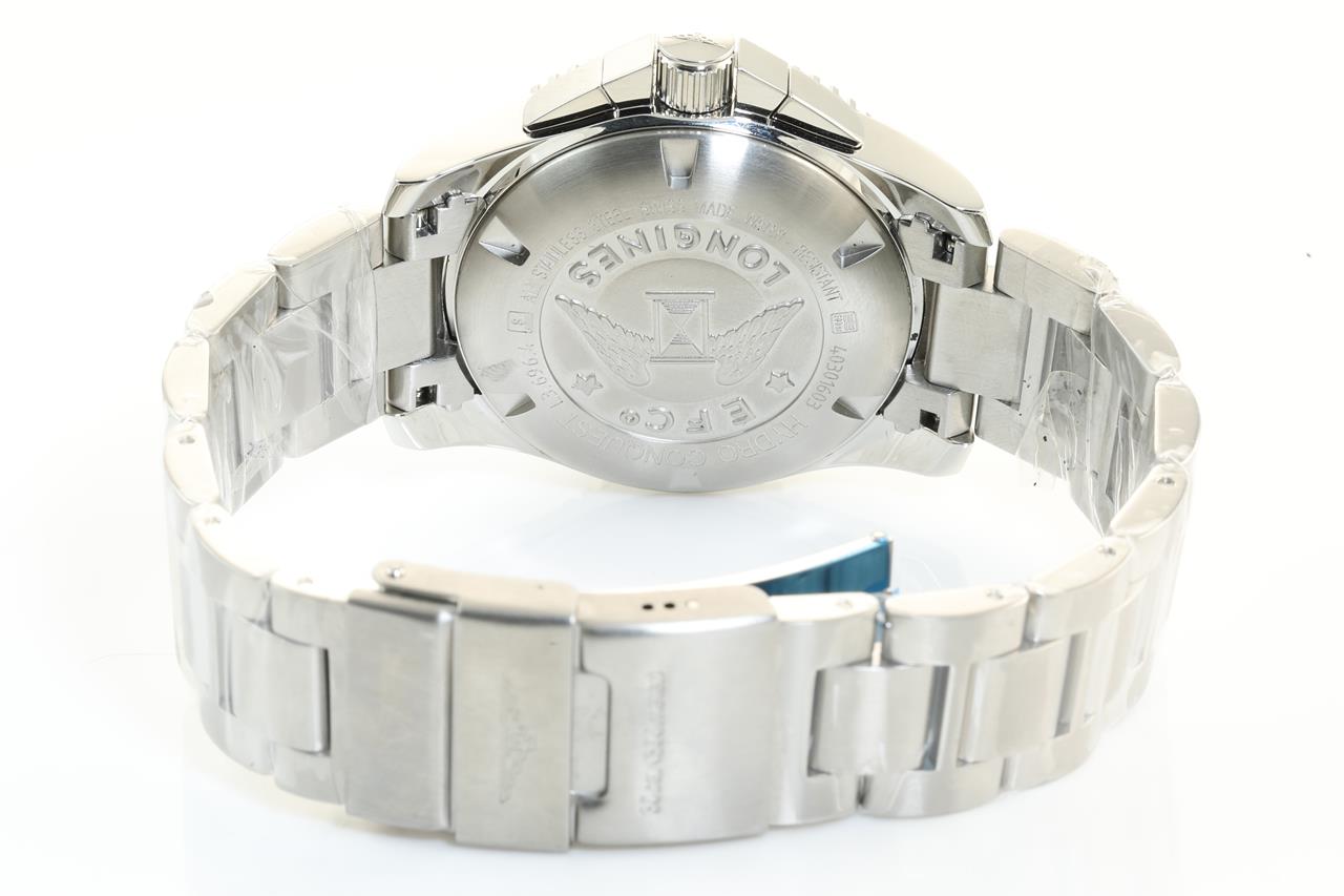 Longines Hydro Conquest stainless steel automatic mens watch. White chronograph dial, date, case diameter: 41mm. wrist size. 20.7cm, Swiss made. Ref# L3.696.4. With Longines stainless steel bracelet and clasp. With Certificate of Authenticity and Longines international warranty card dated 14/02/2021 inside Longines box. 3 month FSA warranty. (Pre-owned)