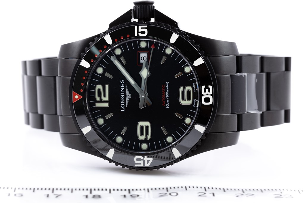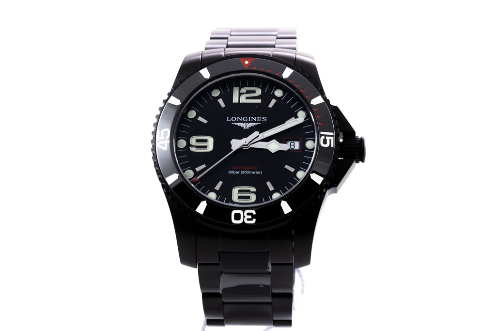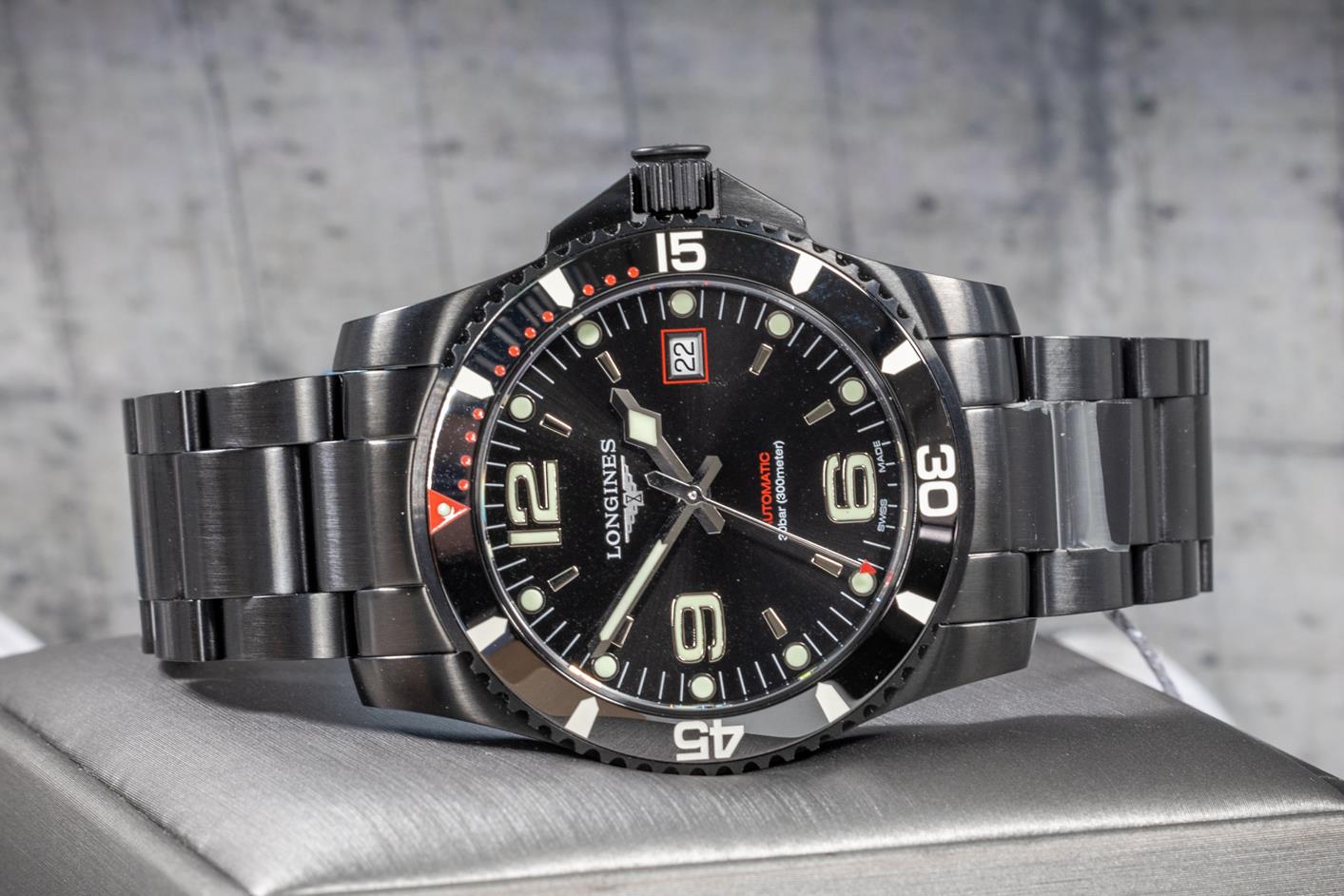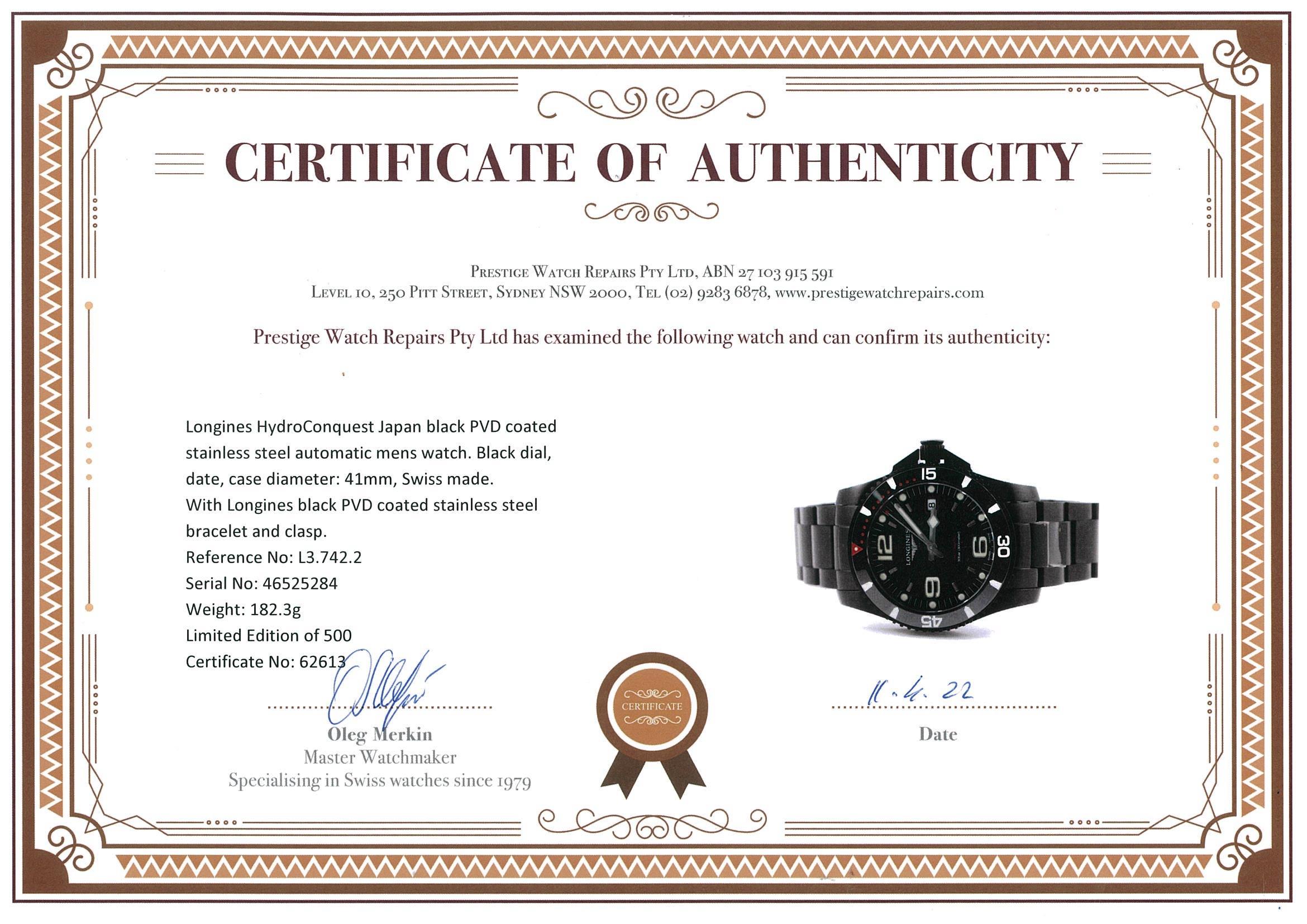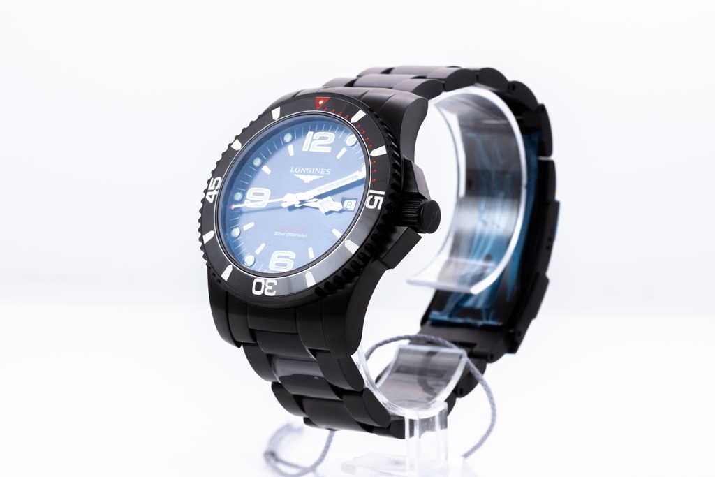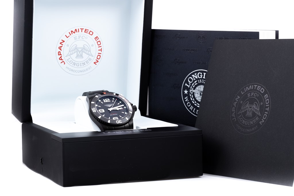 Longines HydroConquest Japan black PVD coated stainless steel automatic mens watch. Black dial, date, case diameter: 41mm, wrist size: 19cm, Swiss made. Ref# L3.742.2. Limited Edition of 500. With Longines black PVD coated stainless steel bracelet and clasp. With Certificate of Authenticity, Longines International Warranty Card and Longines box. 3 month FSA warranty. (Pre-owned)
