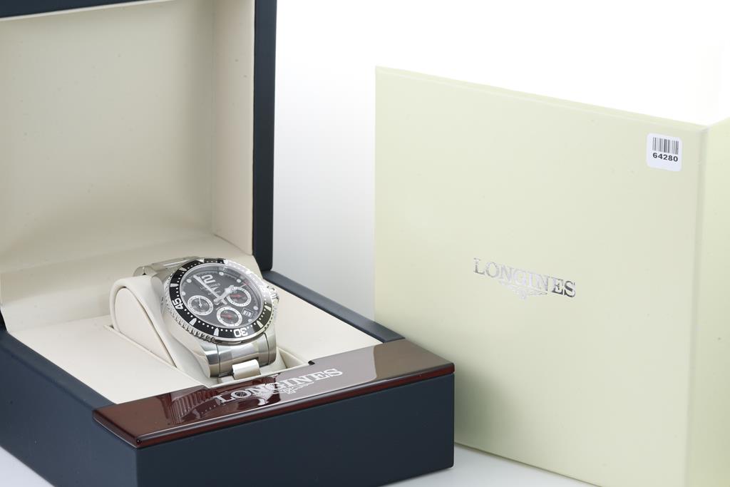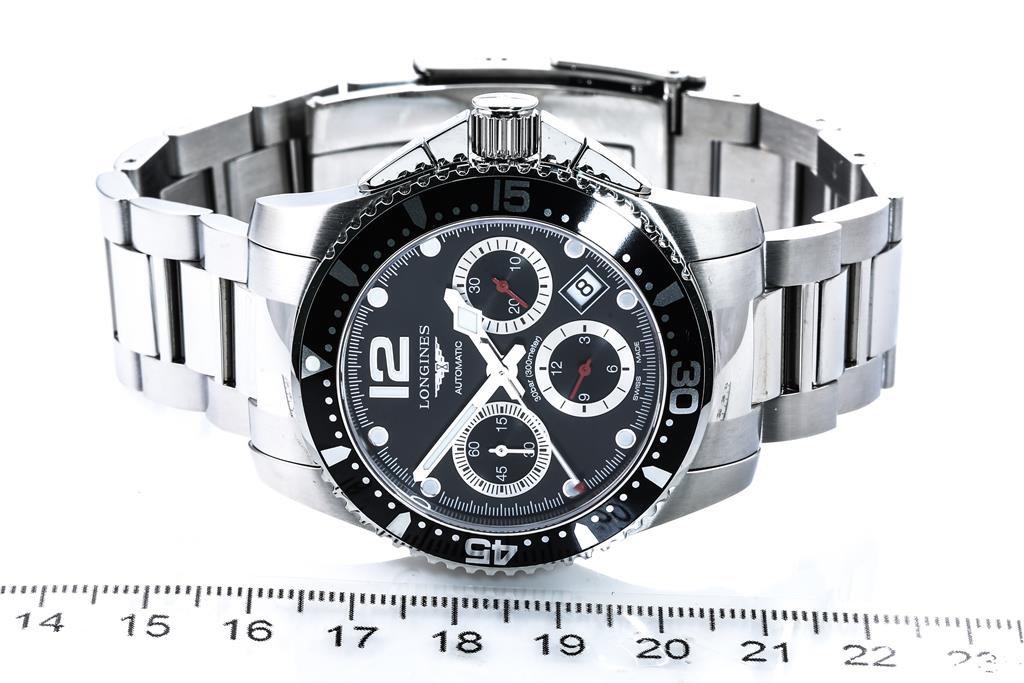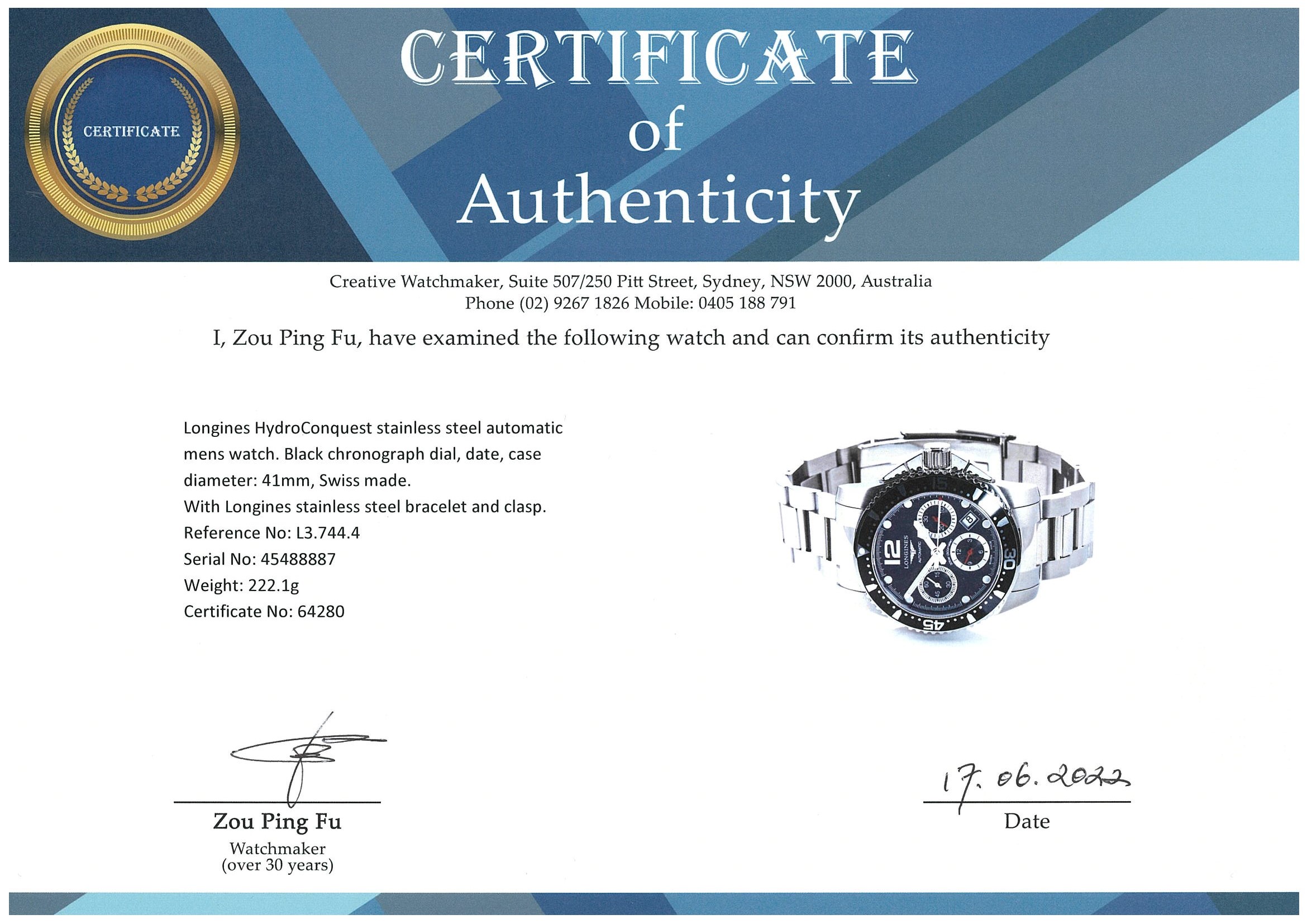 Longines HydroConquest stainless steel automatic mens watch. Black chronograph dial, date, case diameter: 41mm, wrist size: 21cm, Swiss made. Ref# L3.744.4. With Longines stainless steel bracelet and clasp. With Certificate of Authenticity, Longines International Warranty and Longines box. 3 month FSA warranty. (Pre-owned)