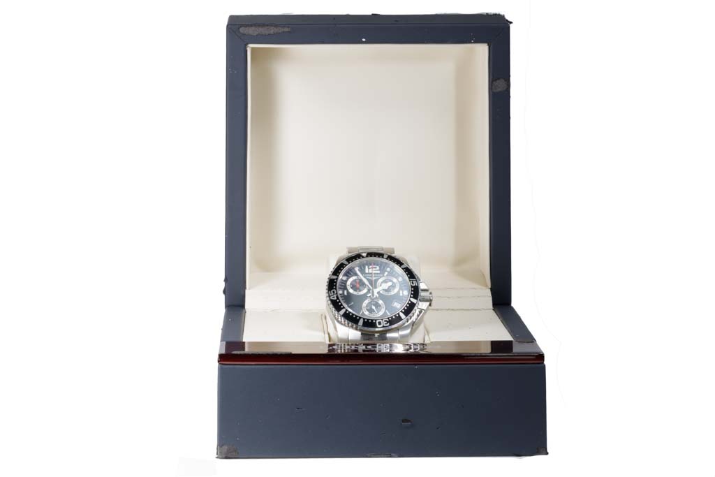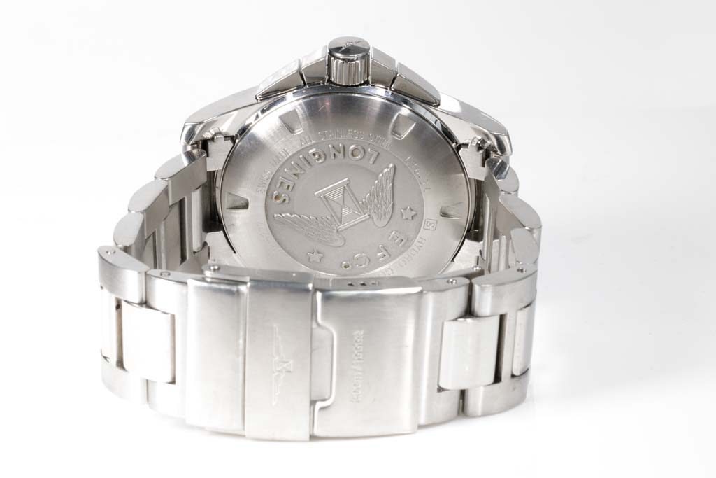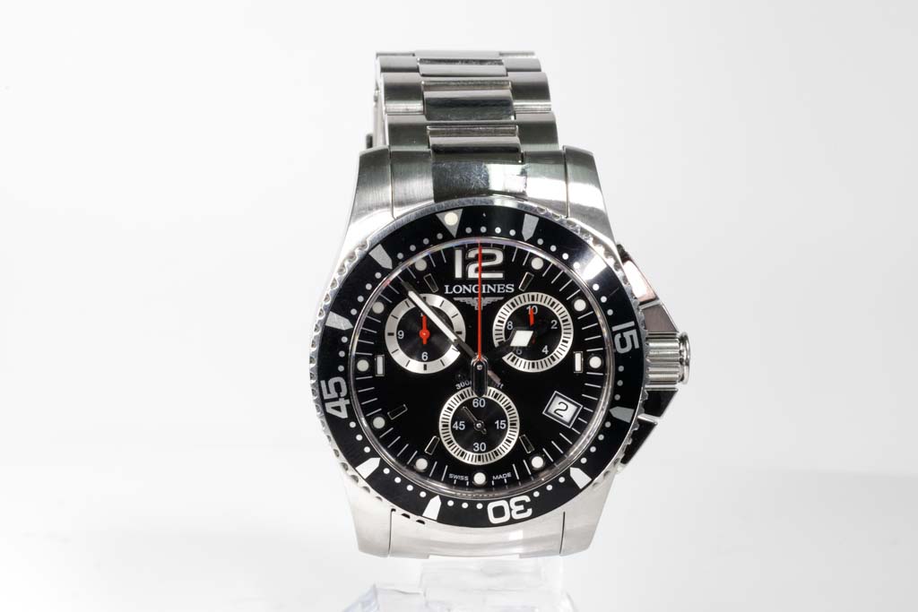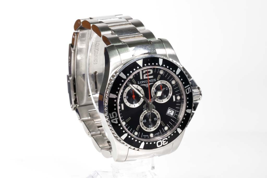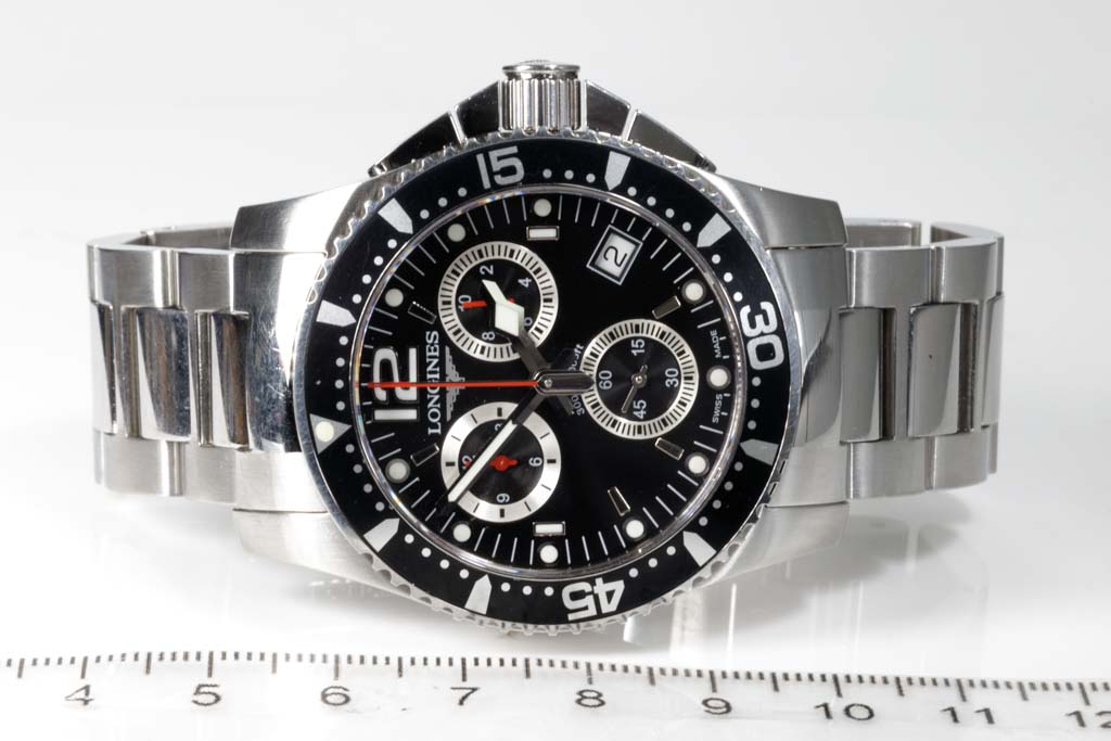 Longines HydroConquest stainless steel quartz mens watch. Black chronograph dial, date, case diameter: 41mm, wrist size: 17cm, Swiss made. Ref# L3.643.4. With Longines stainless steel bracelet and clasp. With Certificate of Authenticity, Longines International Warranty Card and Longines box. 3 month FSA warranty. (Pre-owned)