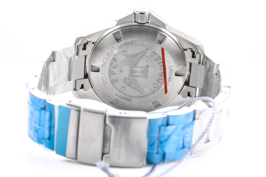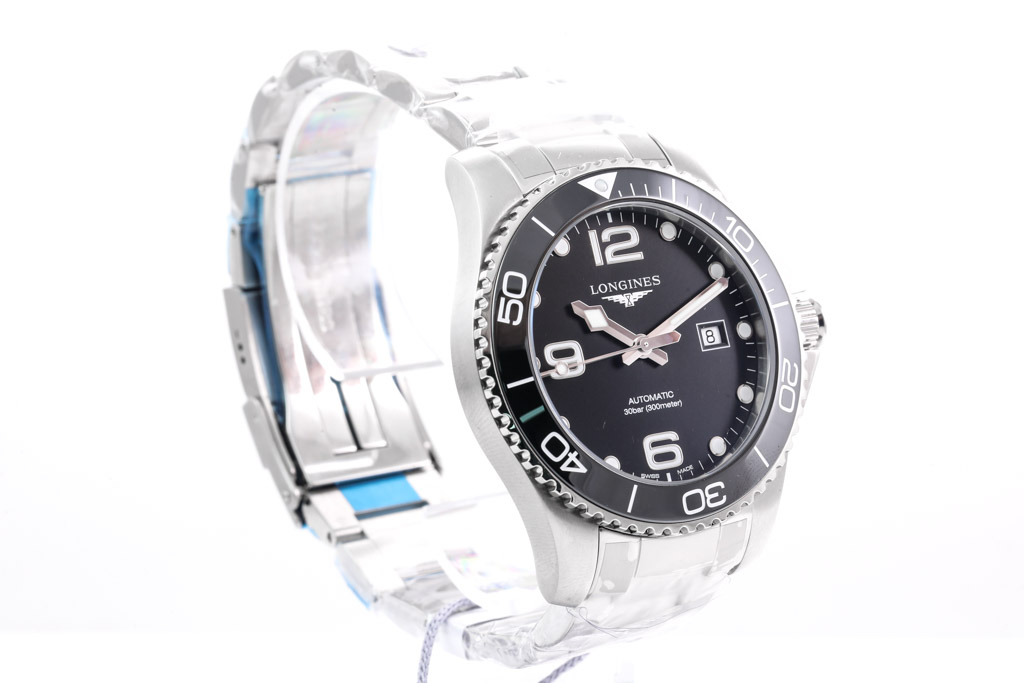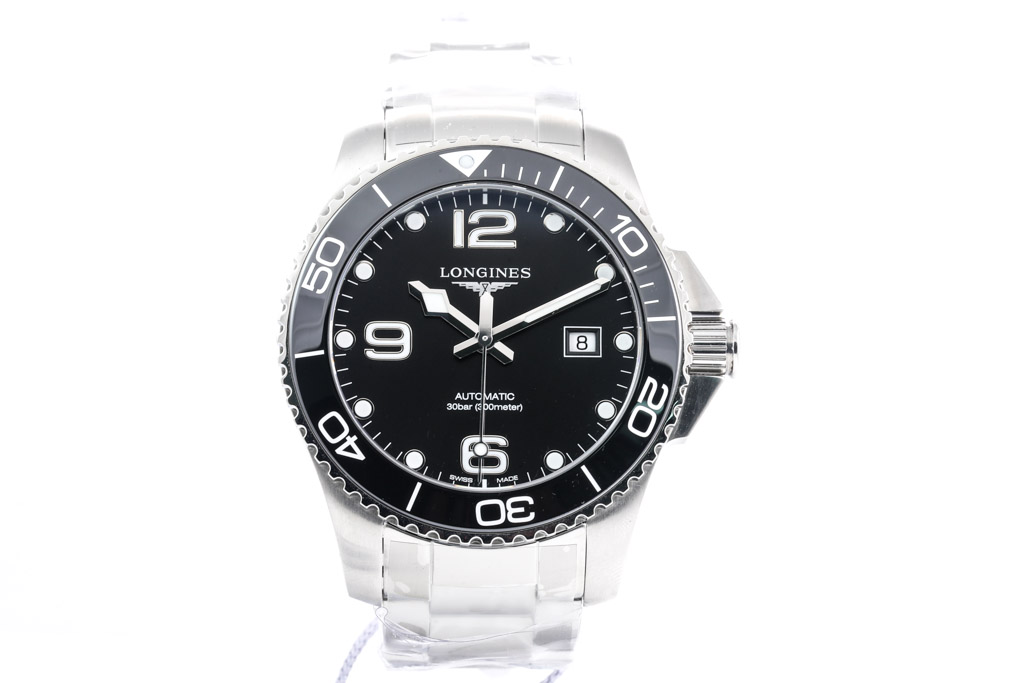 Longines HydroConquest stainless steel automatic men's watch. Black dial, date, case diameter: 43mm, wrist size: 21cm, Swiss made. Ref# L37824566. With Longines stainless steel bracelet and clasp. With Longines International Warranty card and Longines box. Longines 2 year warranty applies. (As New, Note: minor scratches on case due to being display stock and bracelet in original wrapping)