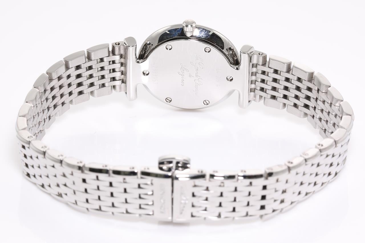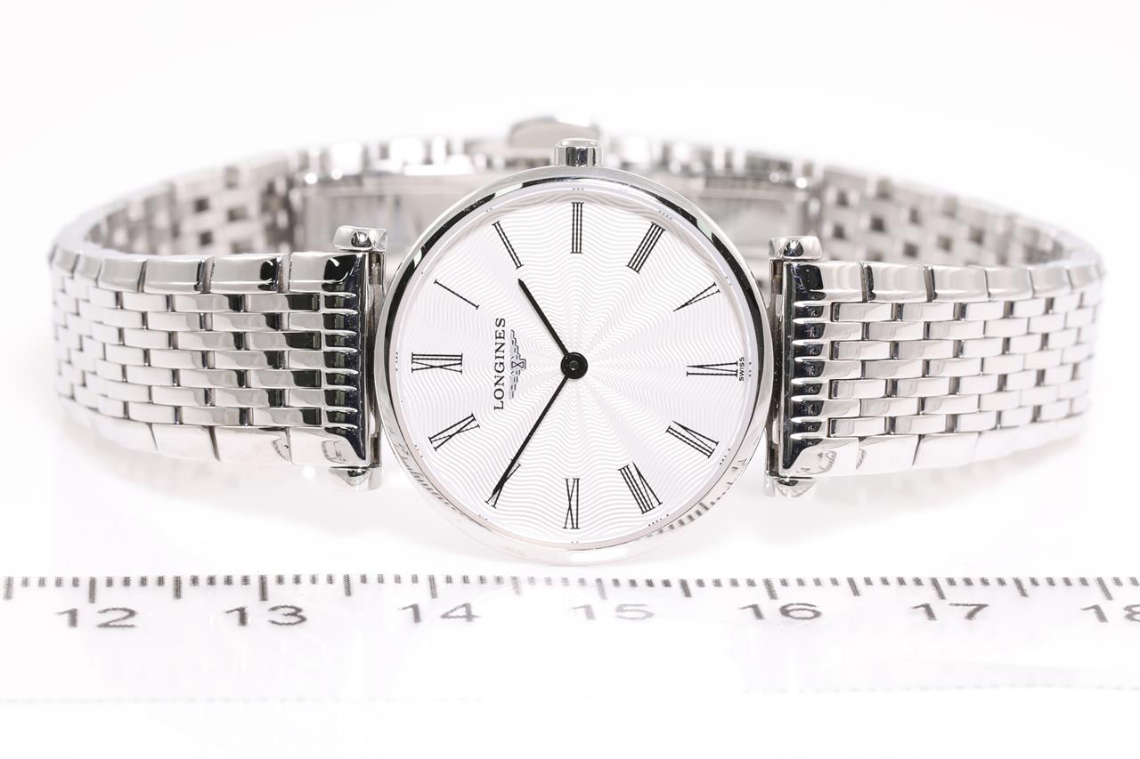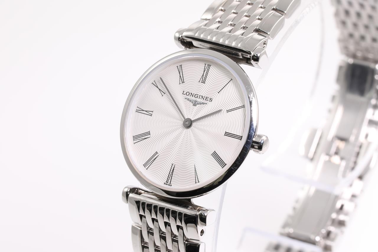 Longines La Grande Classique stainless steel quartz ladies watch. Silver colour dial, case diameter: 24mm, wrist size: 17.5cm, Swiss made. Ref# L4.209.4. With Longines stainless steel bracelet and clasp. With Certificate of Authenticity, Longines warranty card dated 24/03/2016 and instruction booklet. 3 month FSA warranty. (Pre-owned)