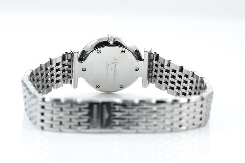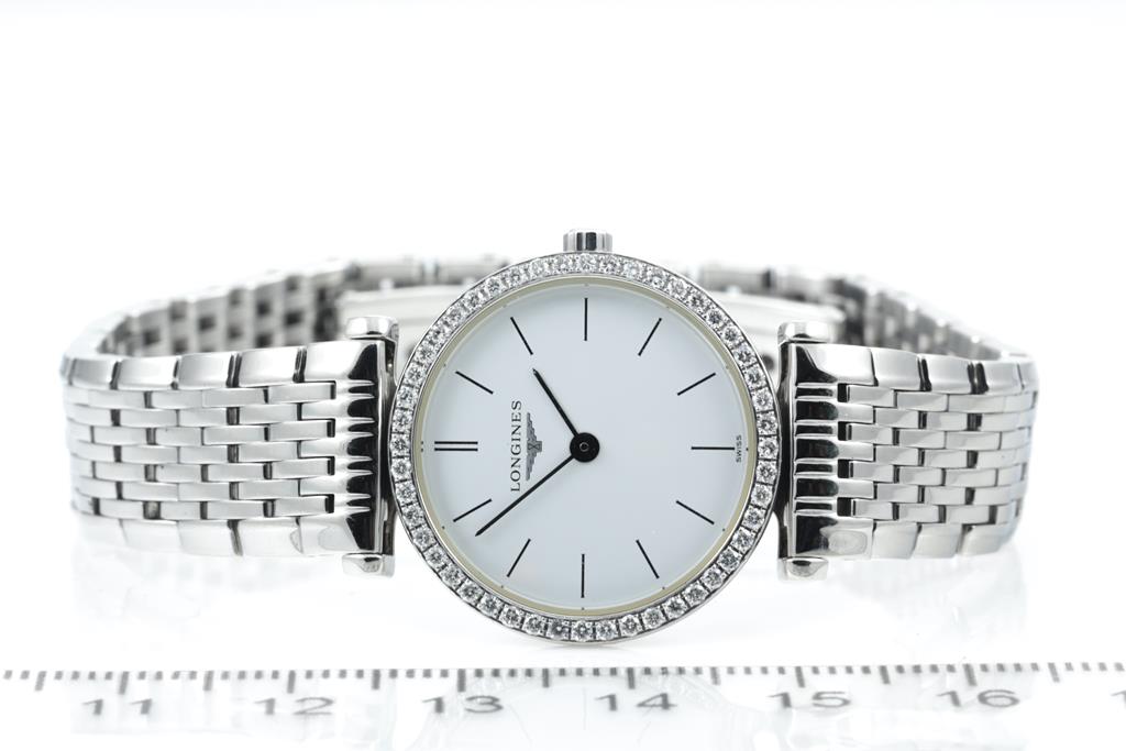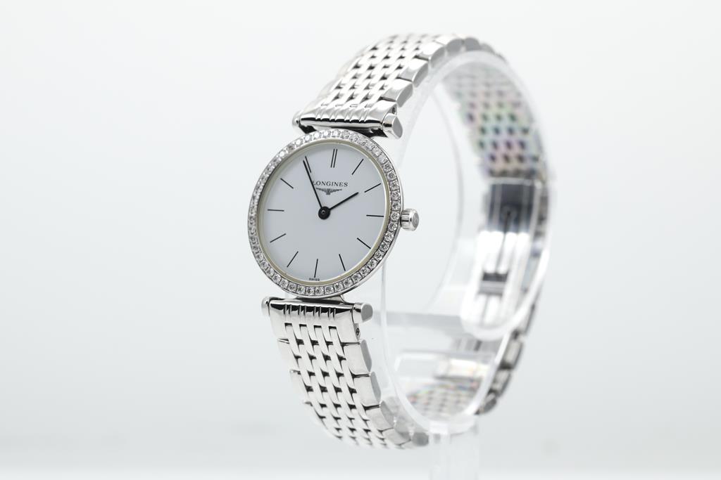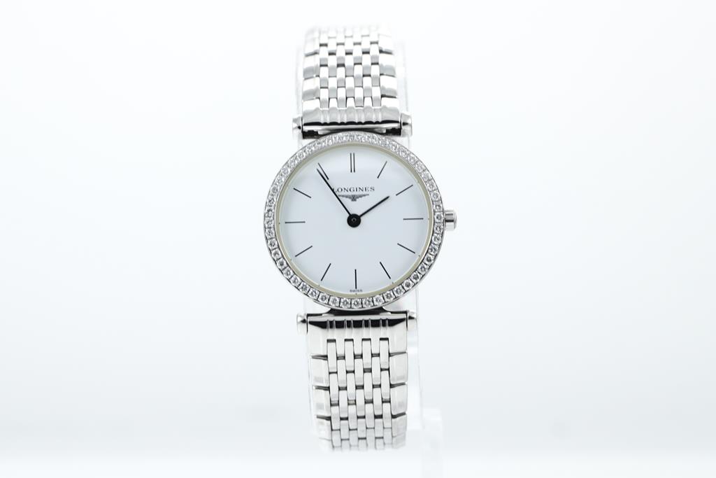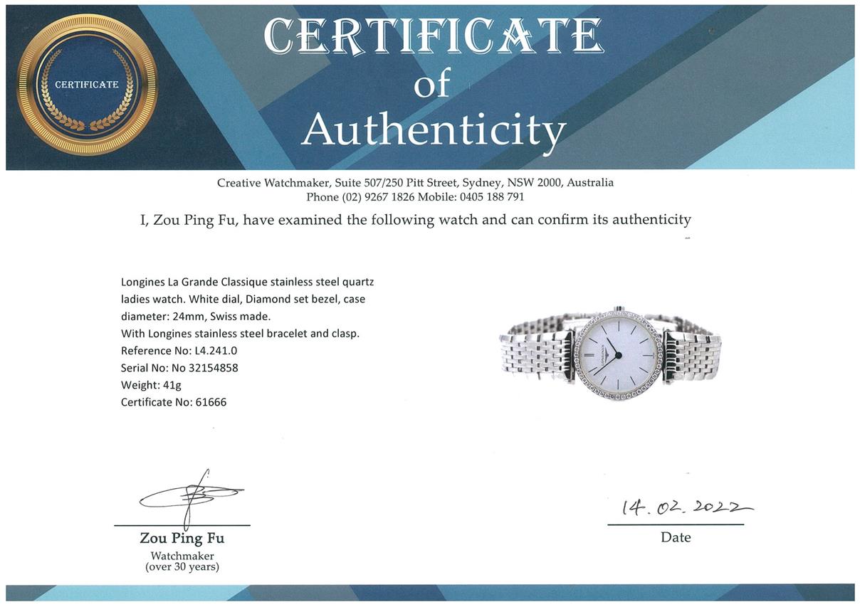 Longines La Grande Classique stainless steel quartz ladies watch. White dial, Diamond set bezel, case diameter: 24mm, wrist size: 16cm, Swiss made. Ref# L4.241.0. With Longines stainless steel bracelet and clasp. With Certificate of Authenticity. 3 month FSA warranty. (Pre-owned)