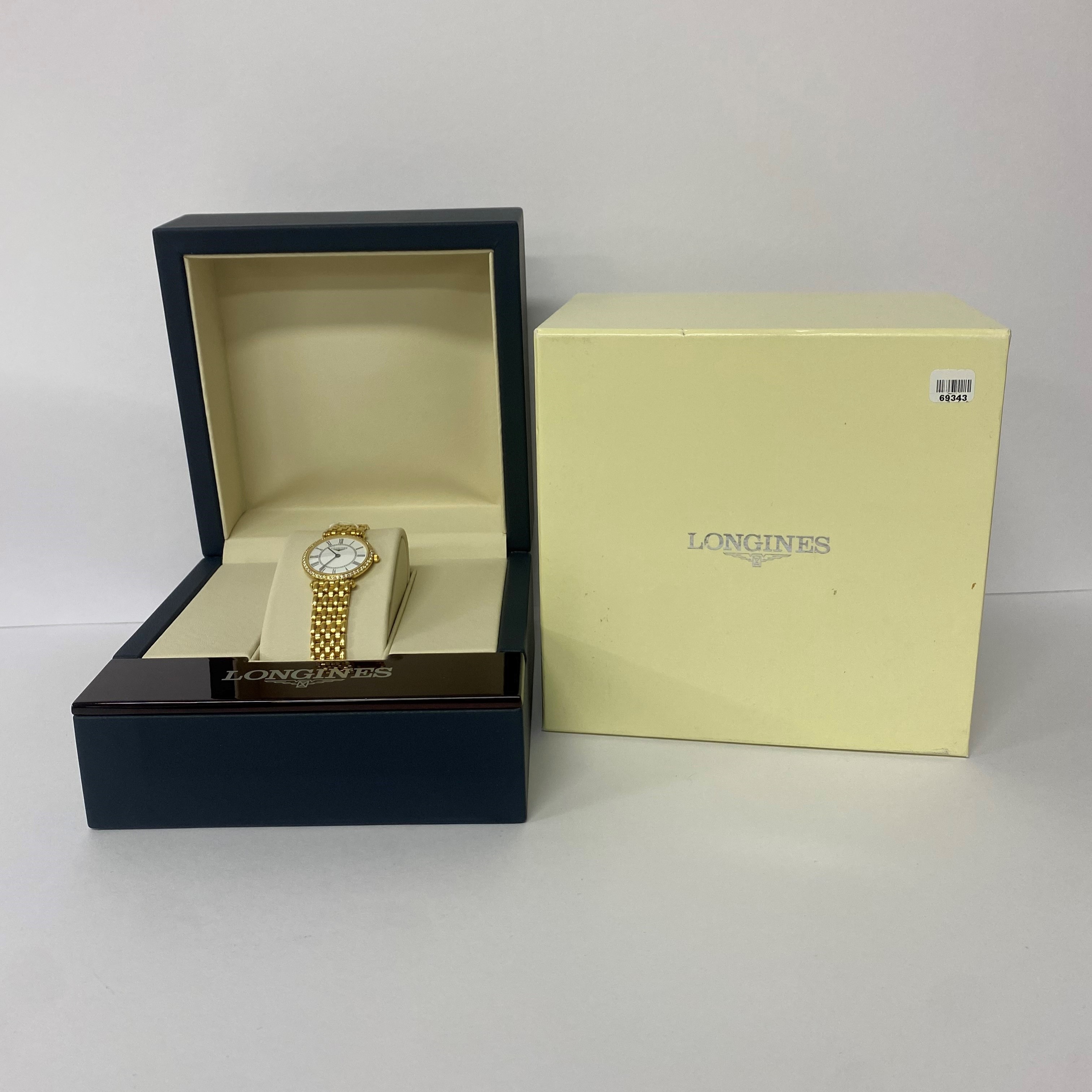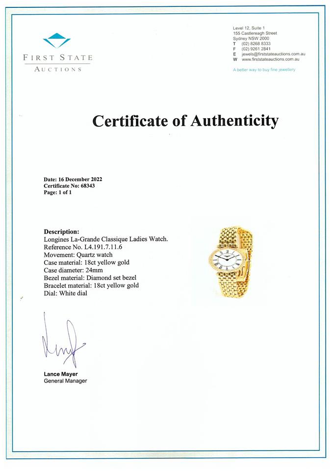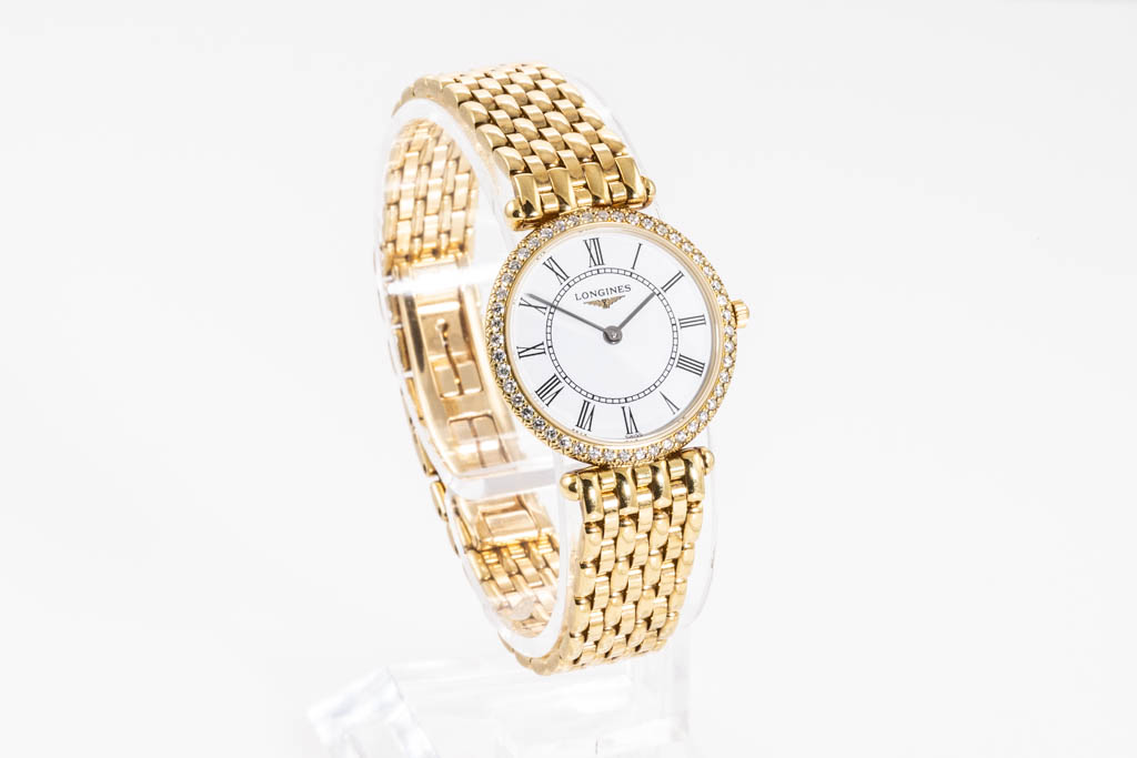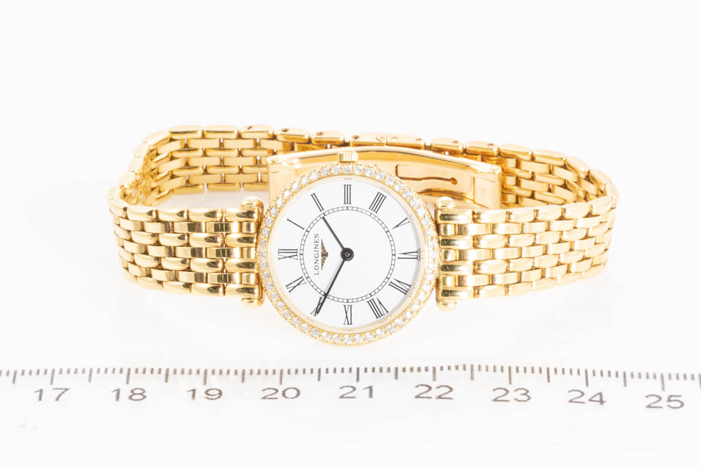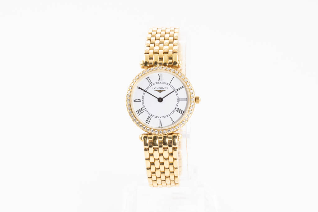 Longines La-Grande Classique 18ct yellow gold quartz ladies watch. White dial, Diamond set bezel, case diameter: 24mm, wrist size: 16cm, Swiss made. Ref# L4.191.7.11.6. With Longines 18ct yellow gold bracelet and clasp. With FSA Certificate of Authenticity and Longines box. 3 month FSA warranty. (As New, Note: minor scratches on case and bracelet)
