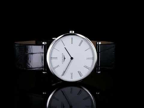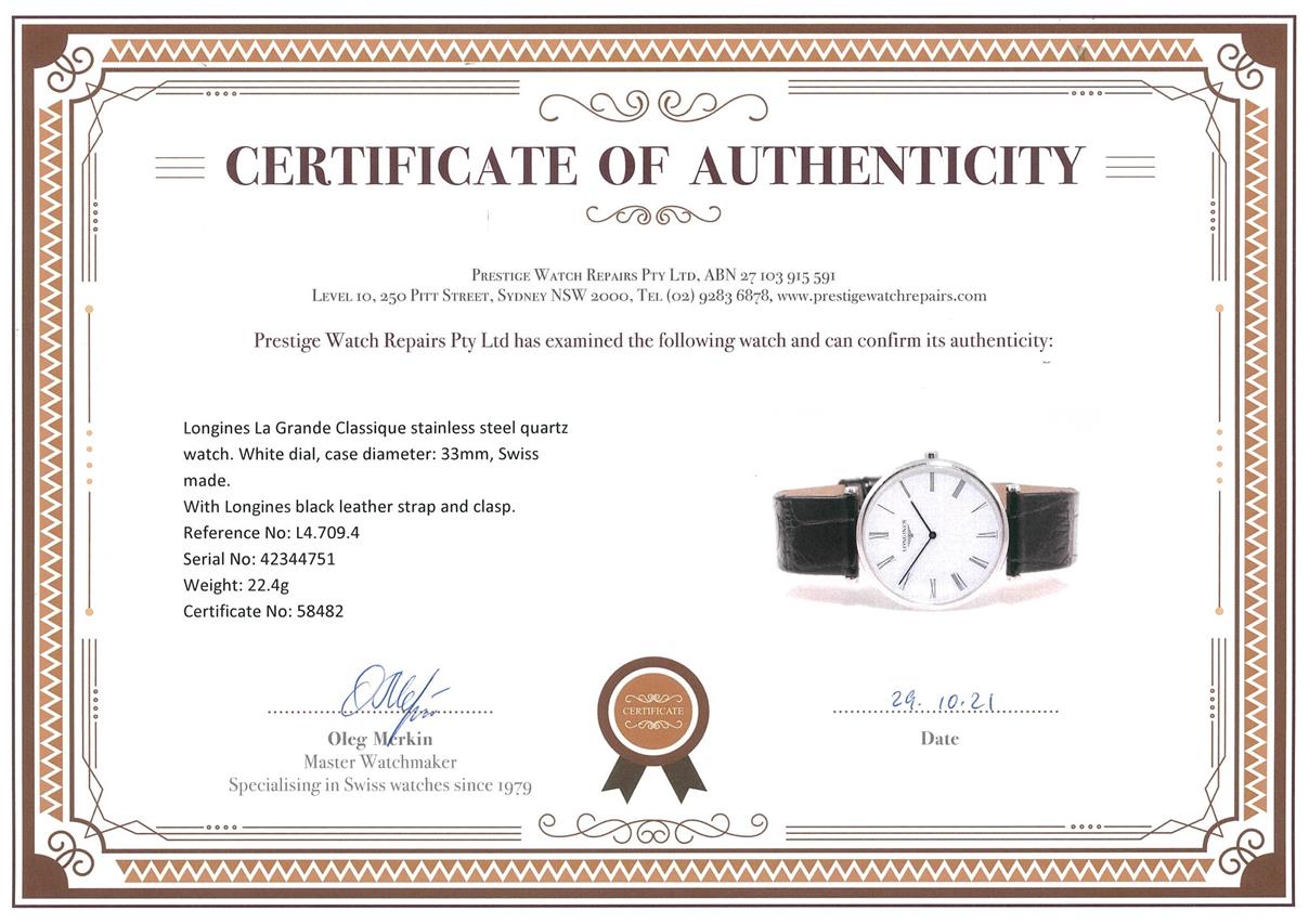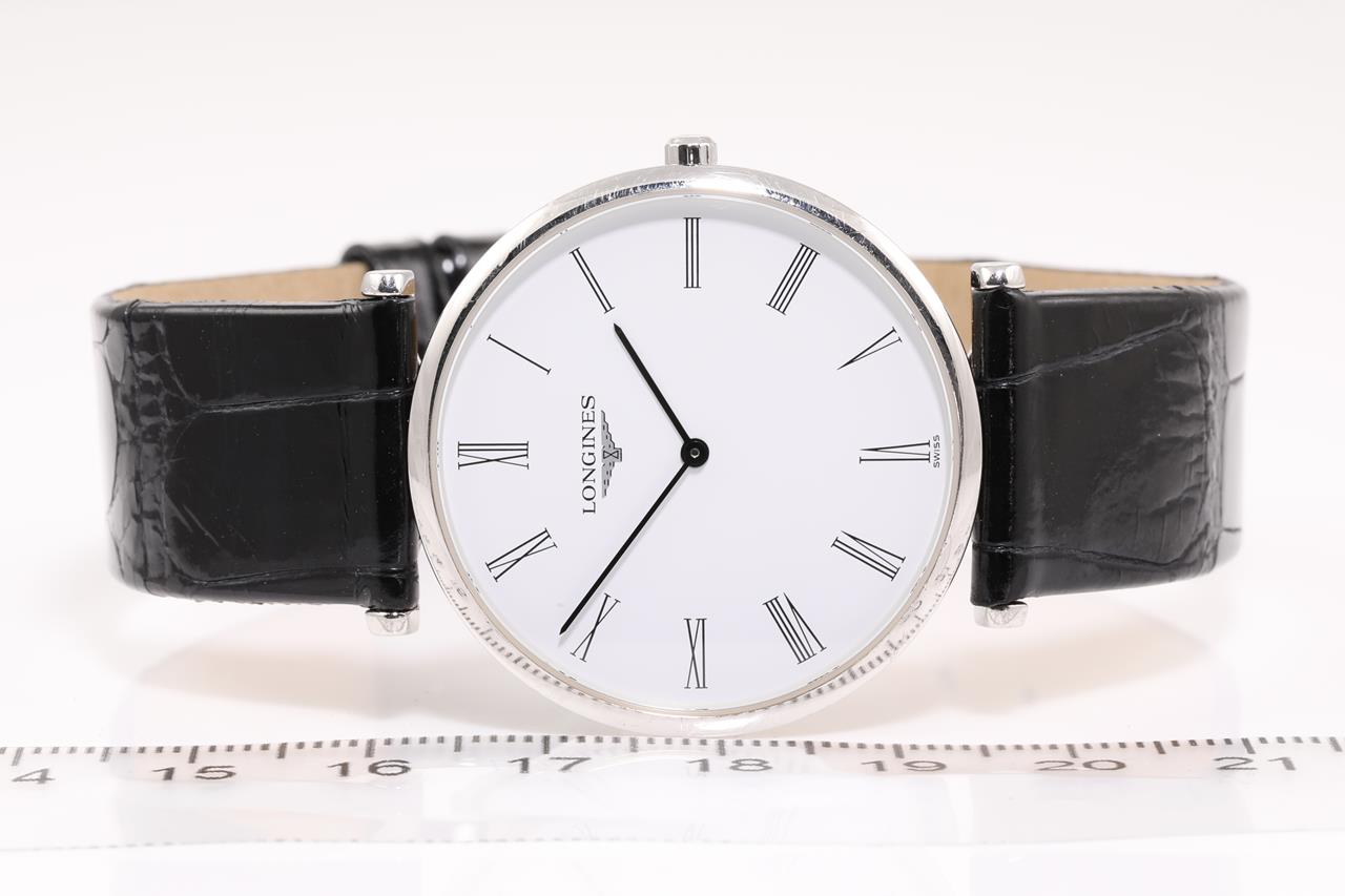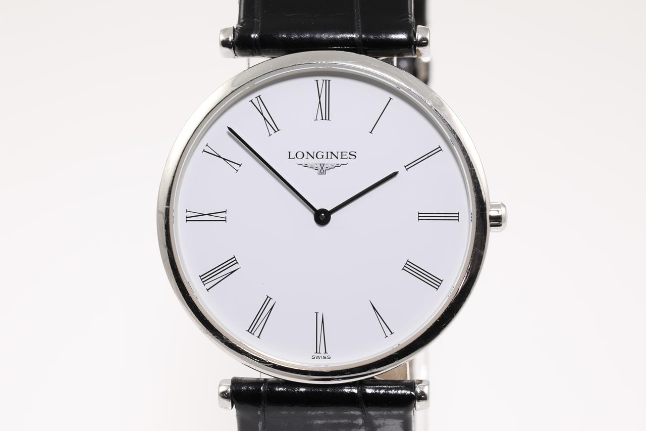 Longines La Grande Classique stainless steel quartz watch. White dial, case diameter: 33mm, length: 22cm, Swiss made. Ref# L4.709.4. With Longines black leather strap and clasp. With certificate of authenticity, Longines serviced card dated 23/09/21 and Longines case. 3 month FSA warranty. (Pre-owned)