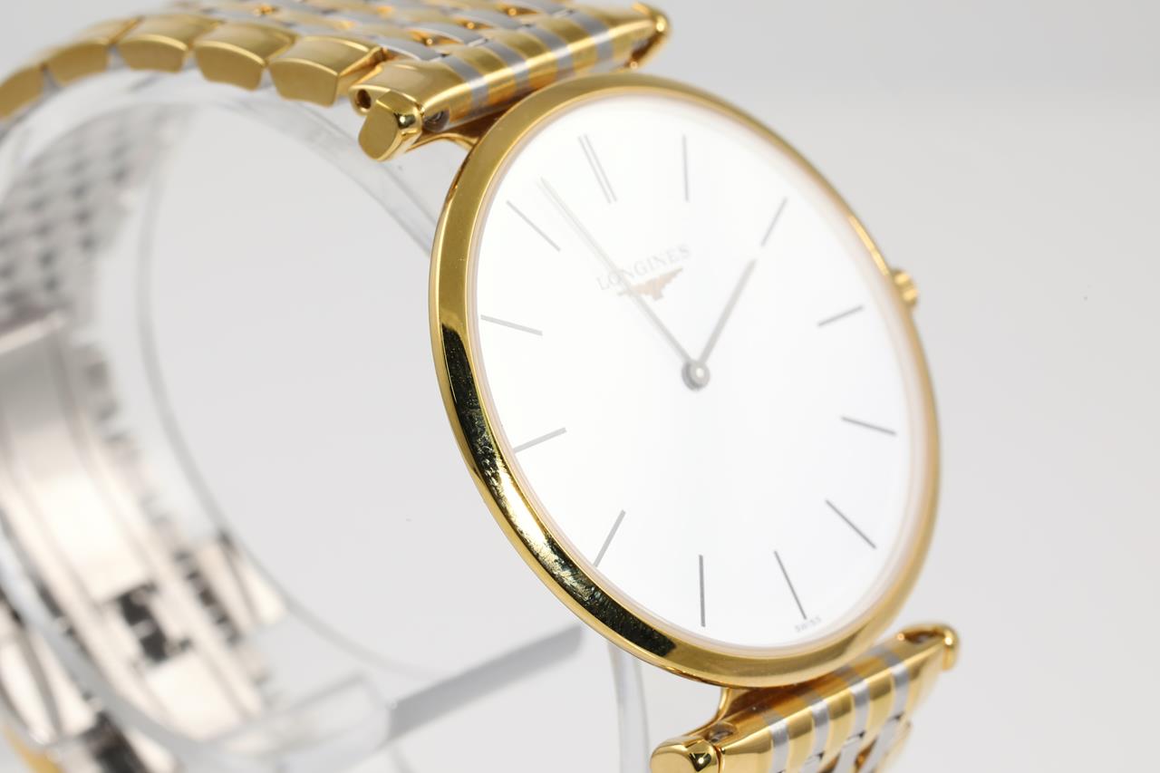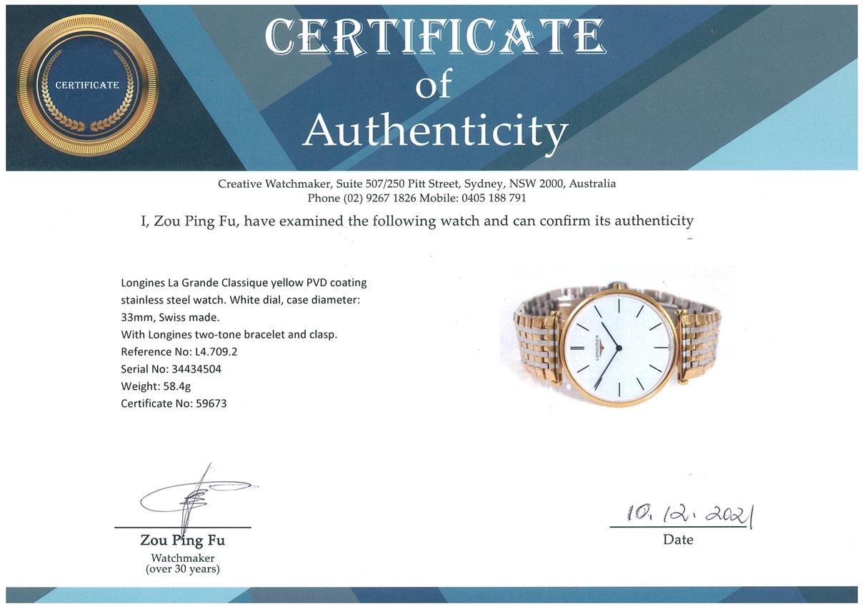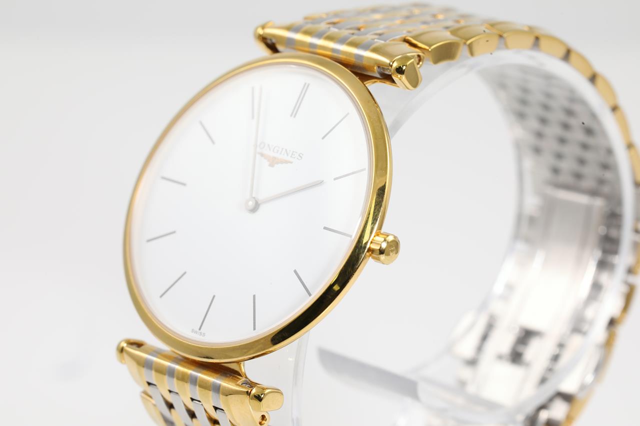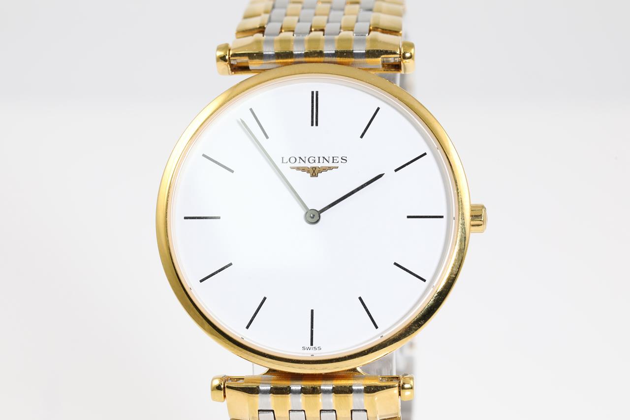 Longines La Grande Classique yellow PVD coating stainless steel quartz watch. White dial, case diameter: 33mm, wrist size: 16cm, Swiss made. Ref# L4.709.2. With Longines two-tone bracelet and clasp. With Certificate of Authenticity. 3 month FSA warranty. (Pre-owned)