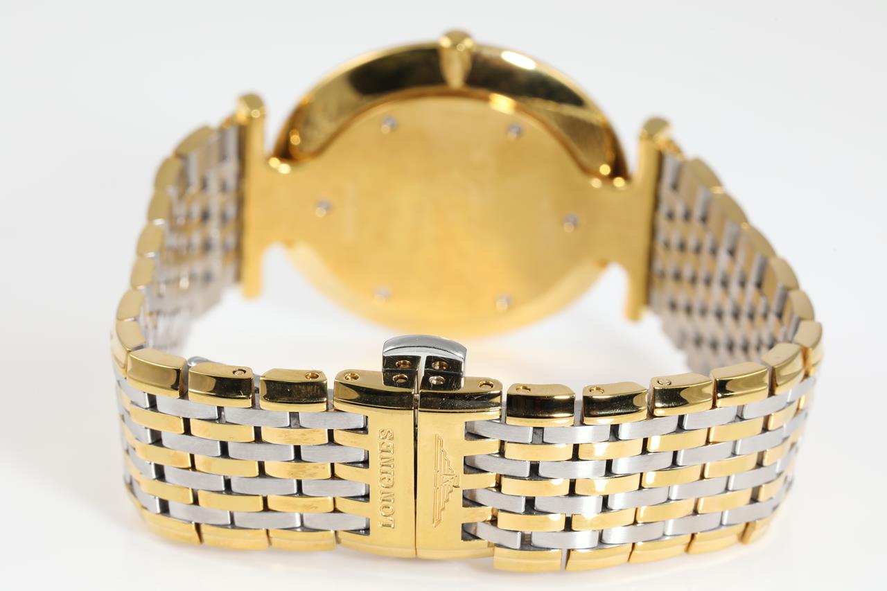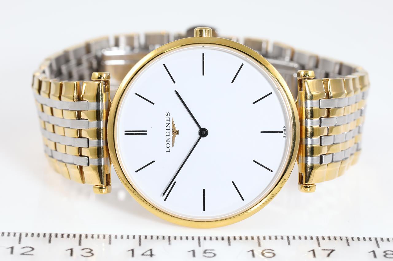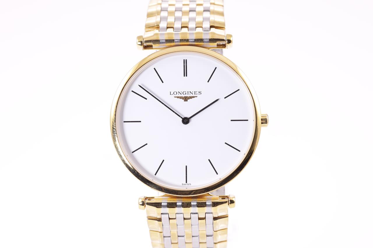 Longines La Grande Classique yellow PVD coating stainless steel quartz watch. White dial, case diameter: 33mm, wrist size: 16cm, Swiss made. Ref# L4.709.2. With Longines two-tone bracelet and clasp. With Certificate of Authenticity. 3 month FSA warranty. (Pre-owned)