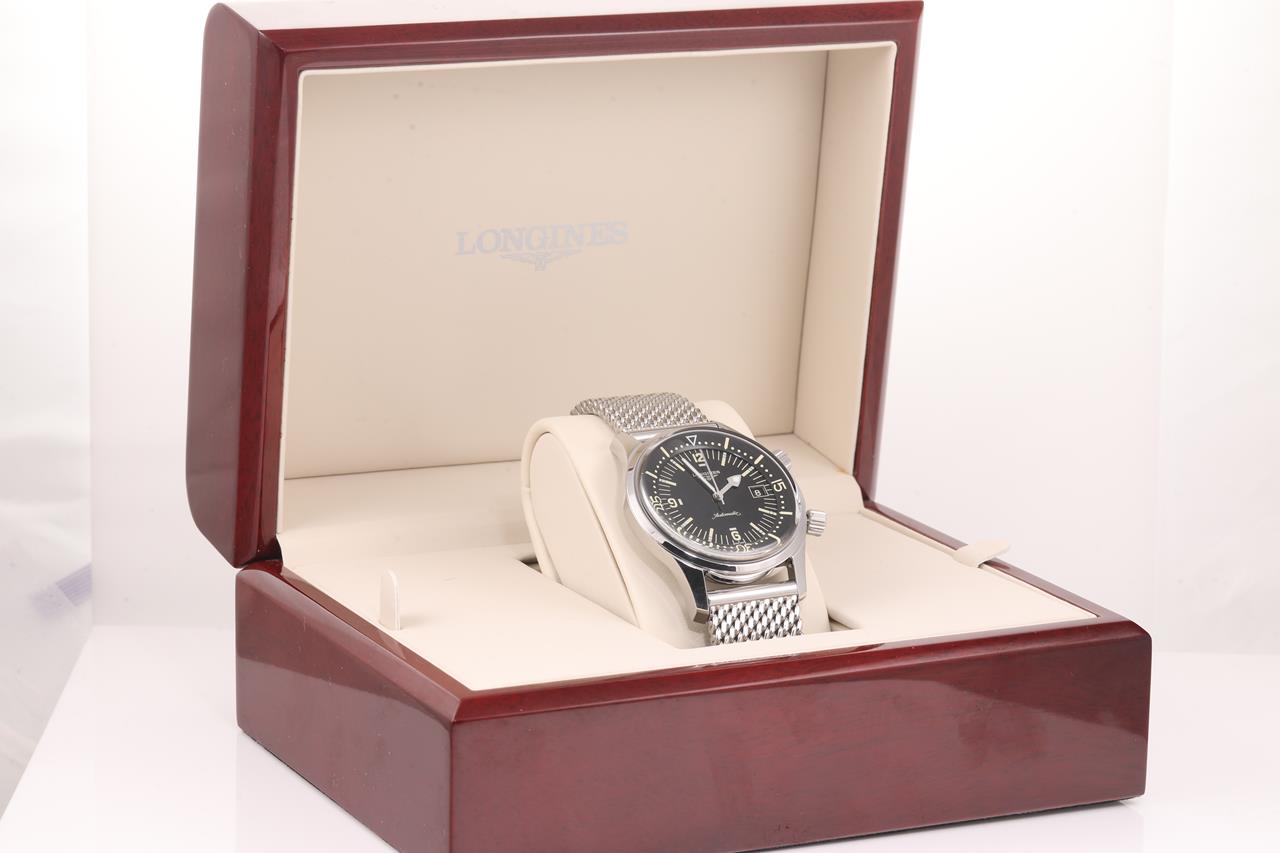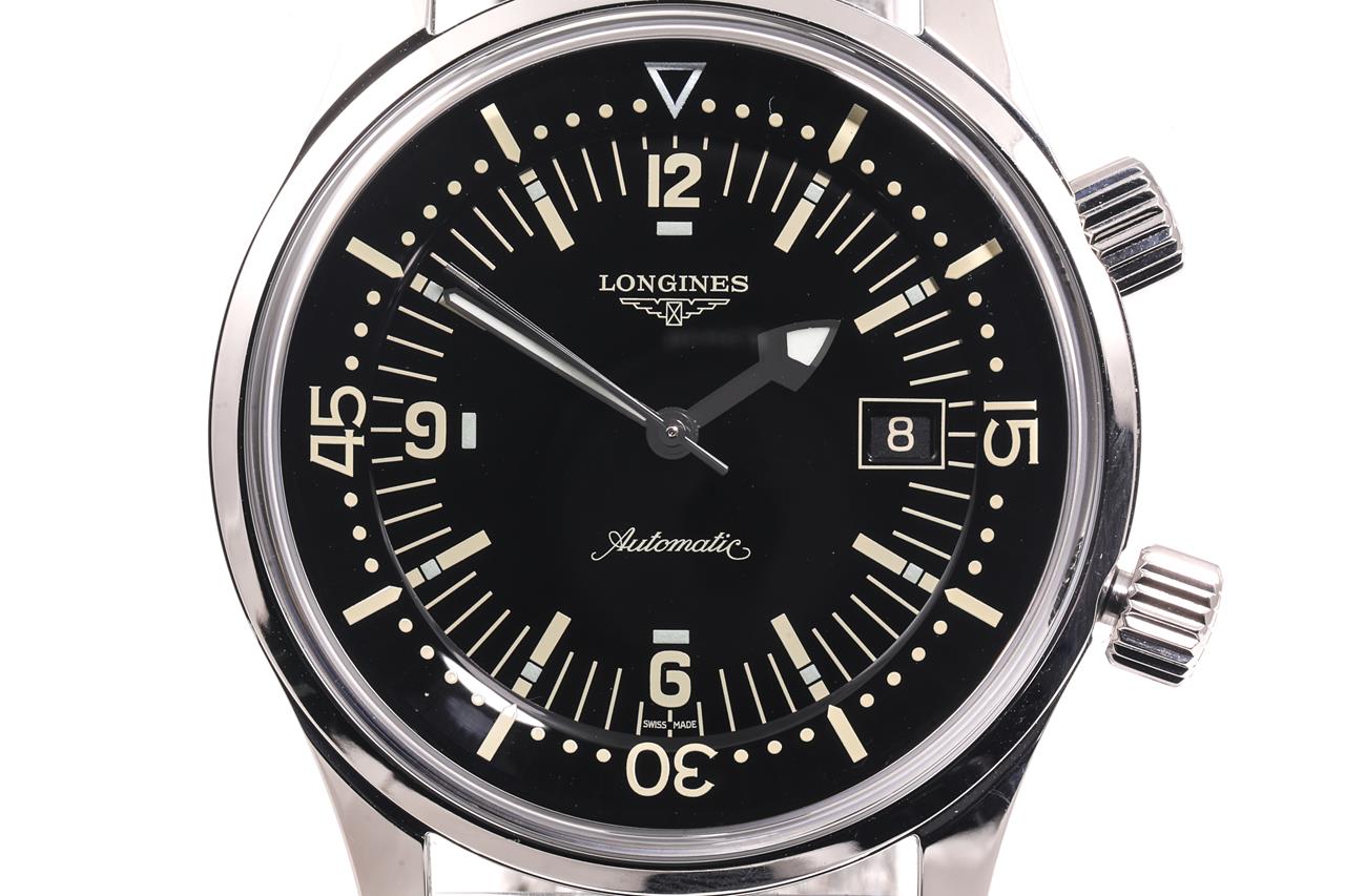 Longines Legend Diver stainless steel automatic mens watch. Black dial, date, case diameter: 42mm, wrist size: 21cm, Swiss made. Ref# L3.674.4.50.6. With Longines stainless steel bracelet and clasp. With Certificate of Authenticity, Longines International Warranty Card dated 15/12/2020 and Longines box. 3 month FSA warranty. (Pre-owned)