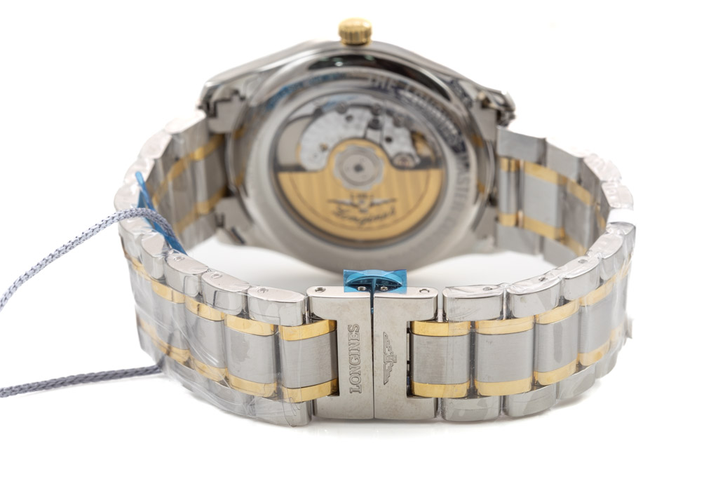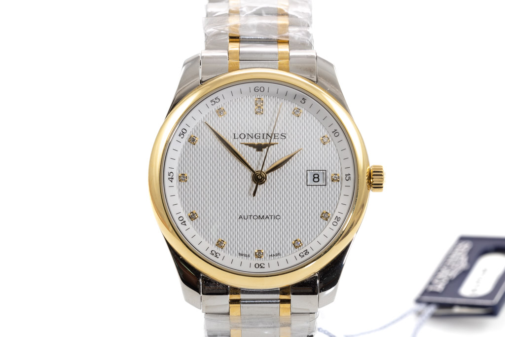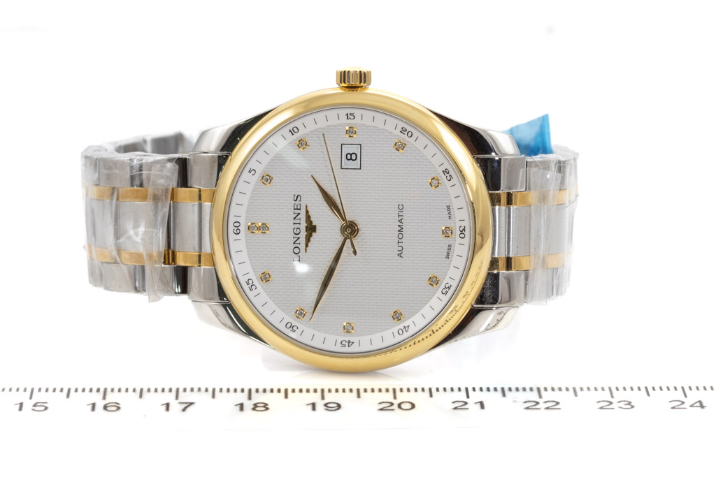 Longines Master Collection 18ct yellow gold and stainless steel automatic mens watch. Silver dial, date, Diamond indicators, case diameter: 40mm, wrist size: 19.5cm, Swiss made. Ref# L27935977. With Longines two tone bracelet and clasp. With Longines International Warranty card - to be registered online and details will be provided. With Longines Diamond Certificate card and Longines box. (As New, Note: minor scratches on case due to being display stock)