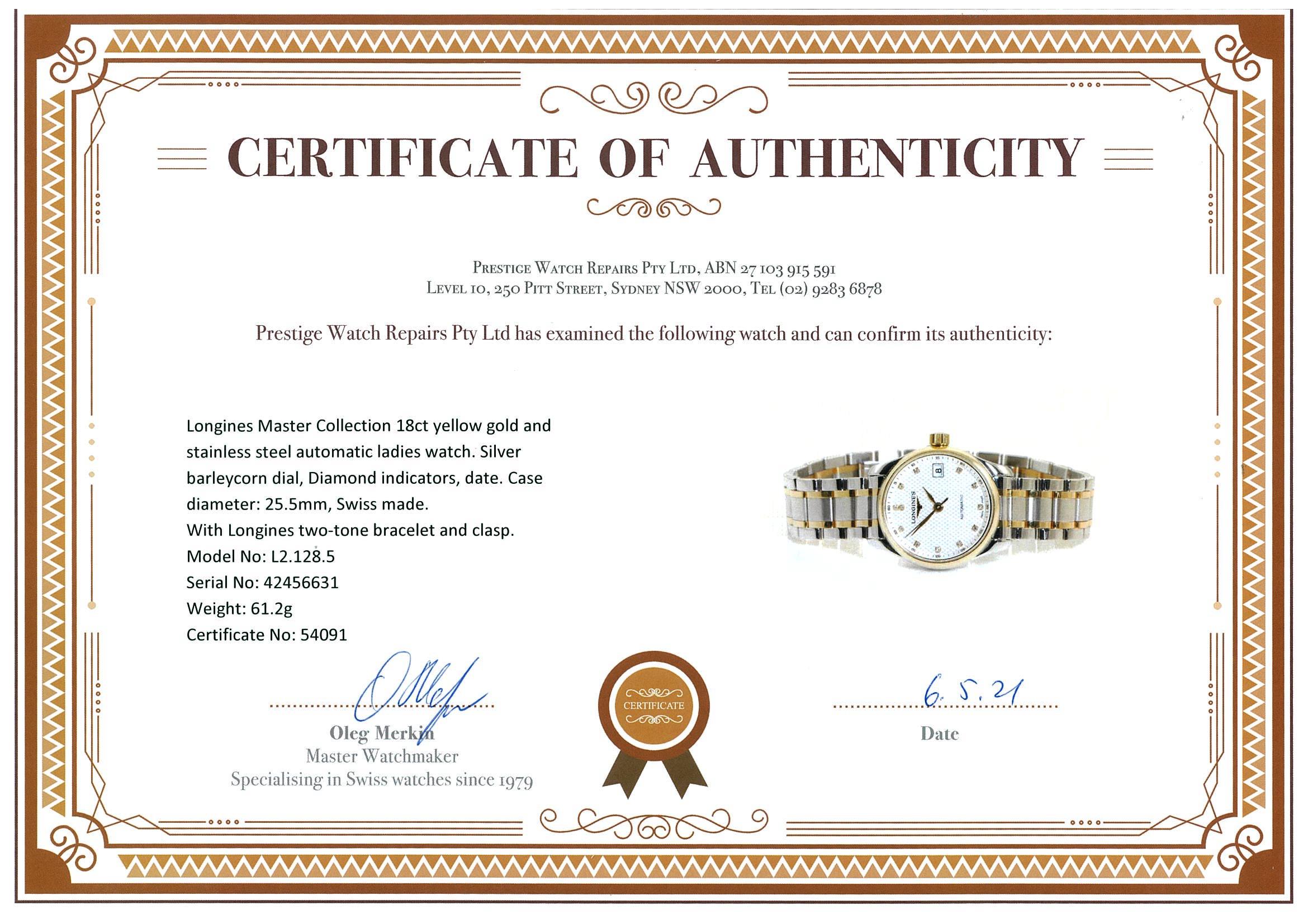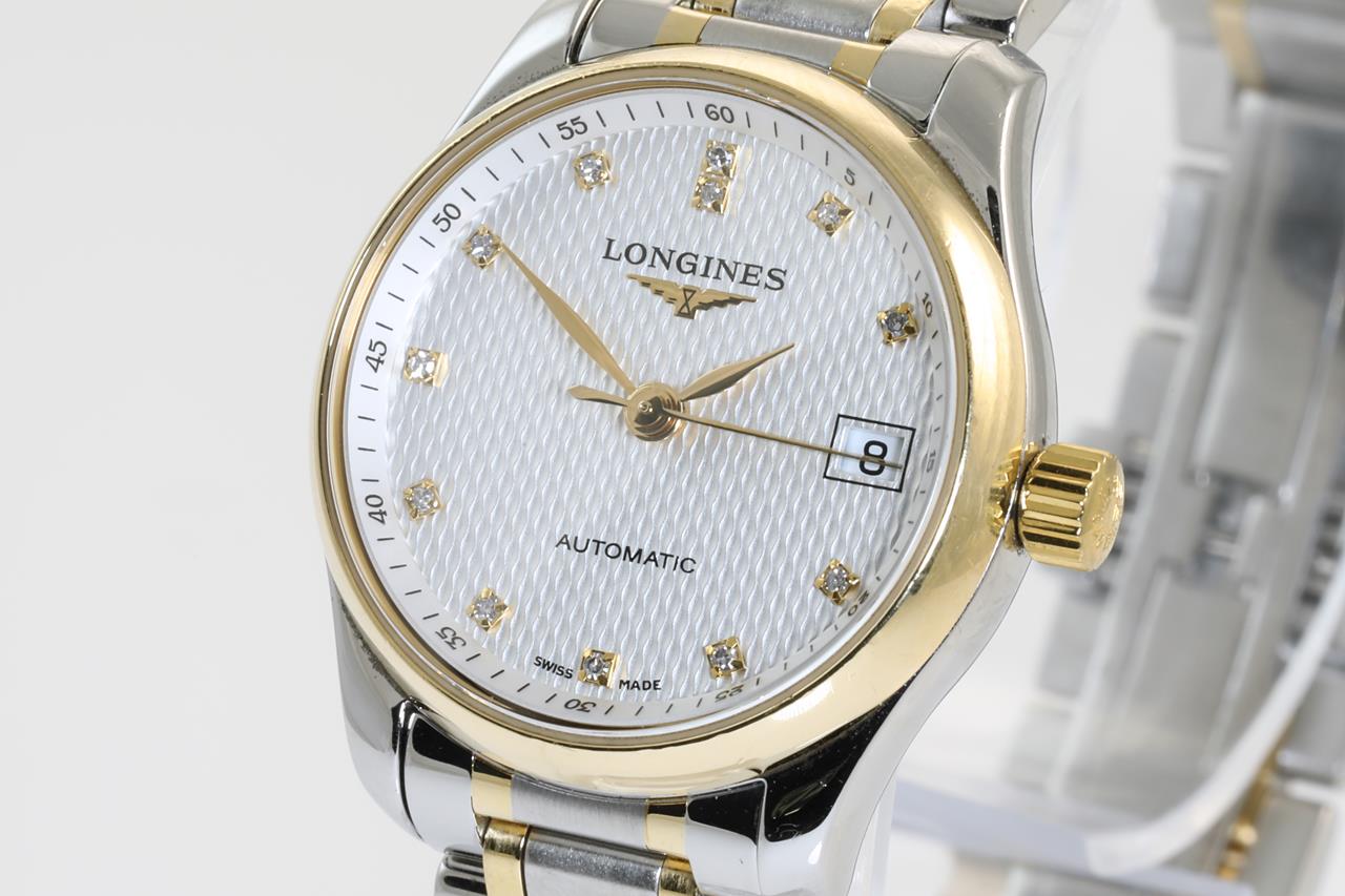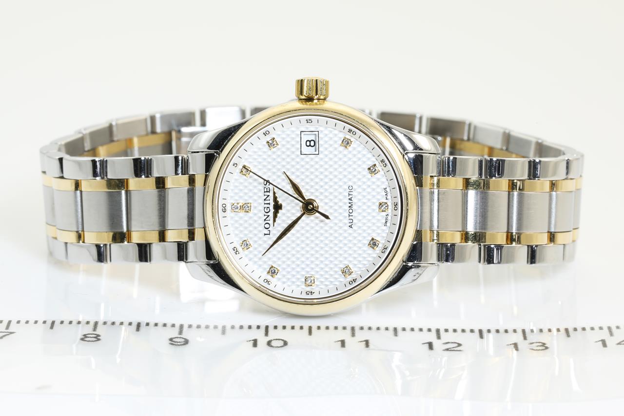 Longines Master Collection 18ct yellow gold and stainless steel automatic ladies watch. Silver barleycorn dial, Diamond indicators, date. Case diameter: 25.5mm, wrist size: 16.5cm, Swiss made. Ref# L2.128.5. With Longines two-tone bracelet and clasp. With certificate of authenticity. 3 month FSA warranty. (Pre-owned)