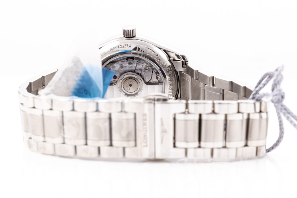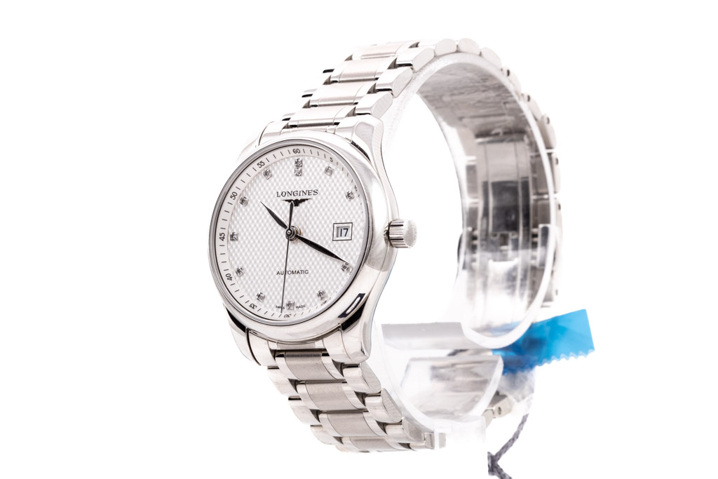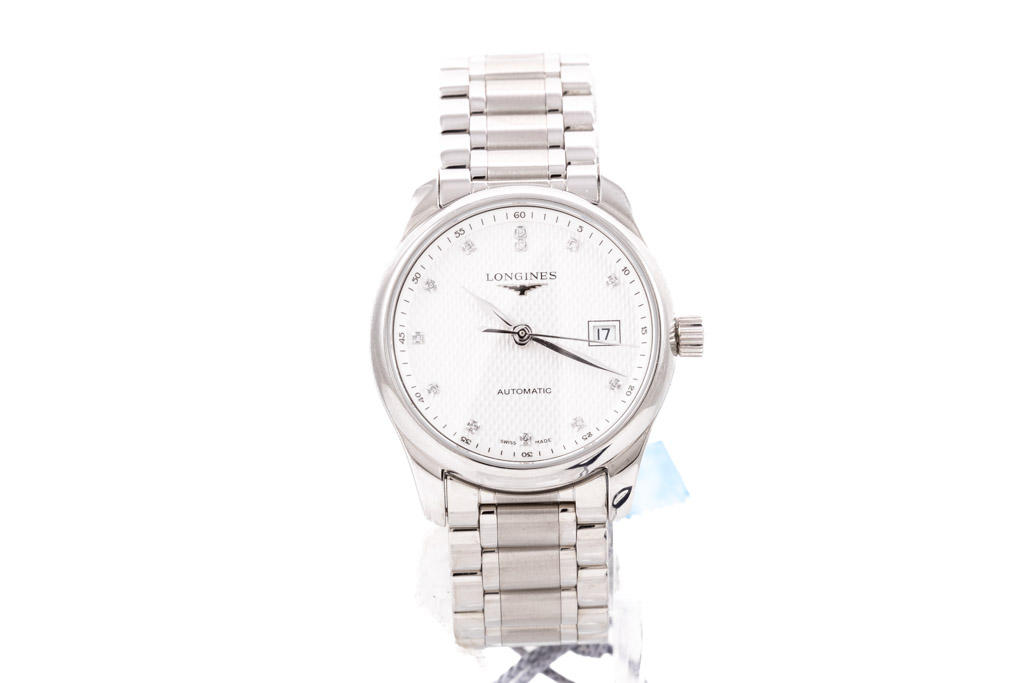 Longines Master Collection stainless steel automatic ladies watch. Silver dial, date, Diamond indicators, case diameter: 29mnm, wrist size: 17cm, Swiss made. Ref# L22574776. With Longines stainless steel bracelet and clasp. With Longines International Warranty Card - to be registered online and details will be provided. With Longines Diamond Certificate Card and Longines box. (As New, Note: minor scratches on case and bracelet due to display stock)
