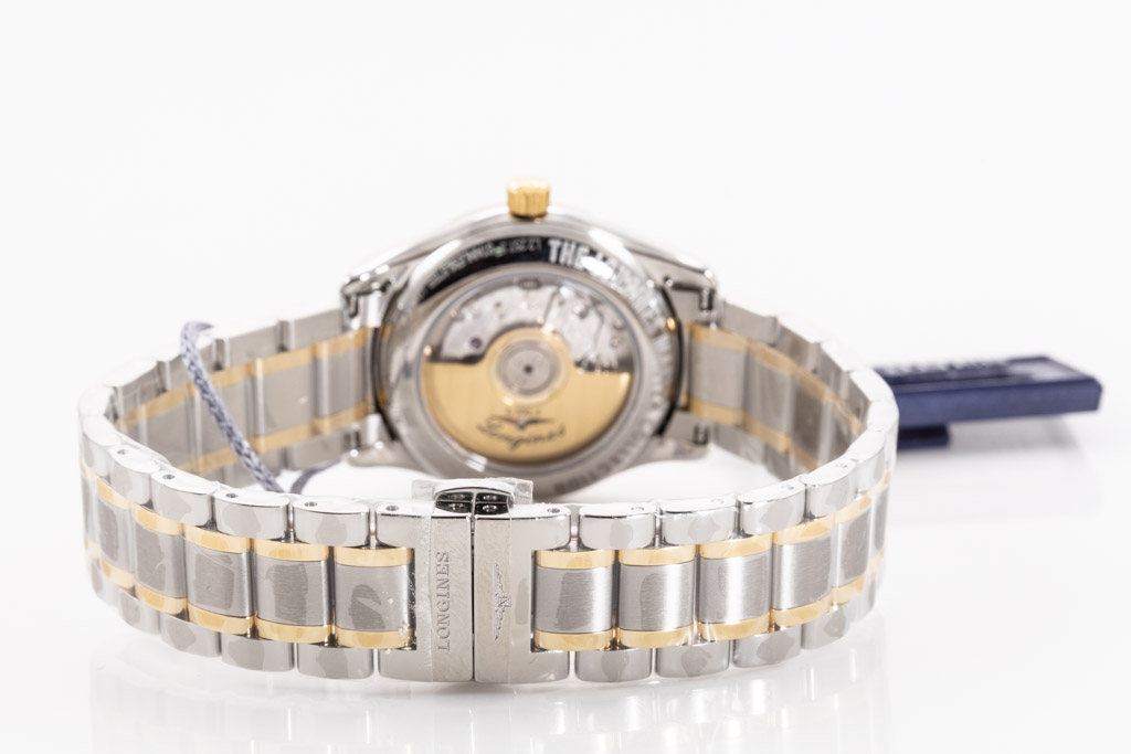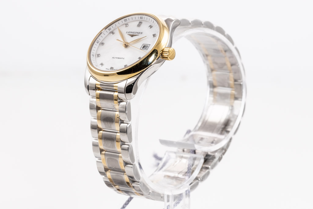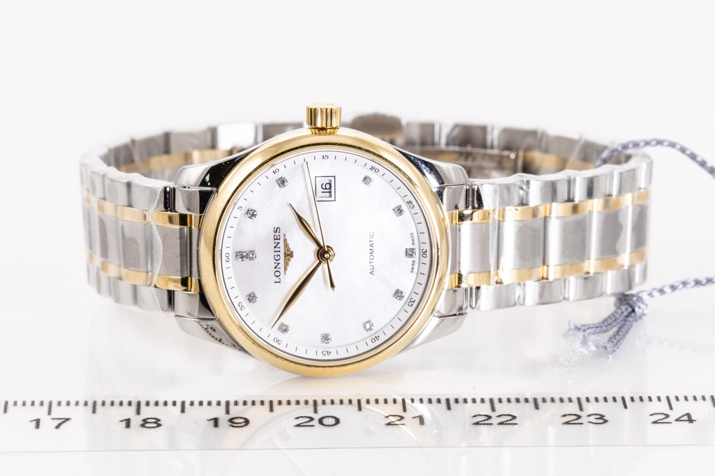 Longines Master Collection 18ct yellow gold and stainless steel ladies watch. Mother of Pearl dial, date, Diamond indicators, case diameter: 29mm, wrist size: 17cm, Swiss made. Ref# L22575877. With Longines two tone bracelet and clasp. With Longines International Warranty Card - to be registered online and details will be provided. With Longines Diamond Certificate Card and Longines box. (As New, Note: minor scratches on case due to display stock)