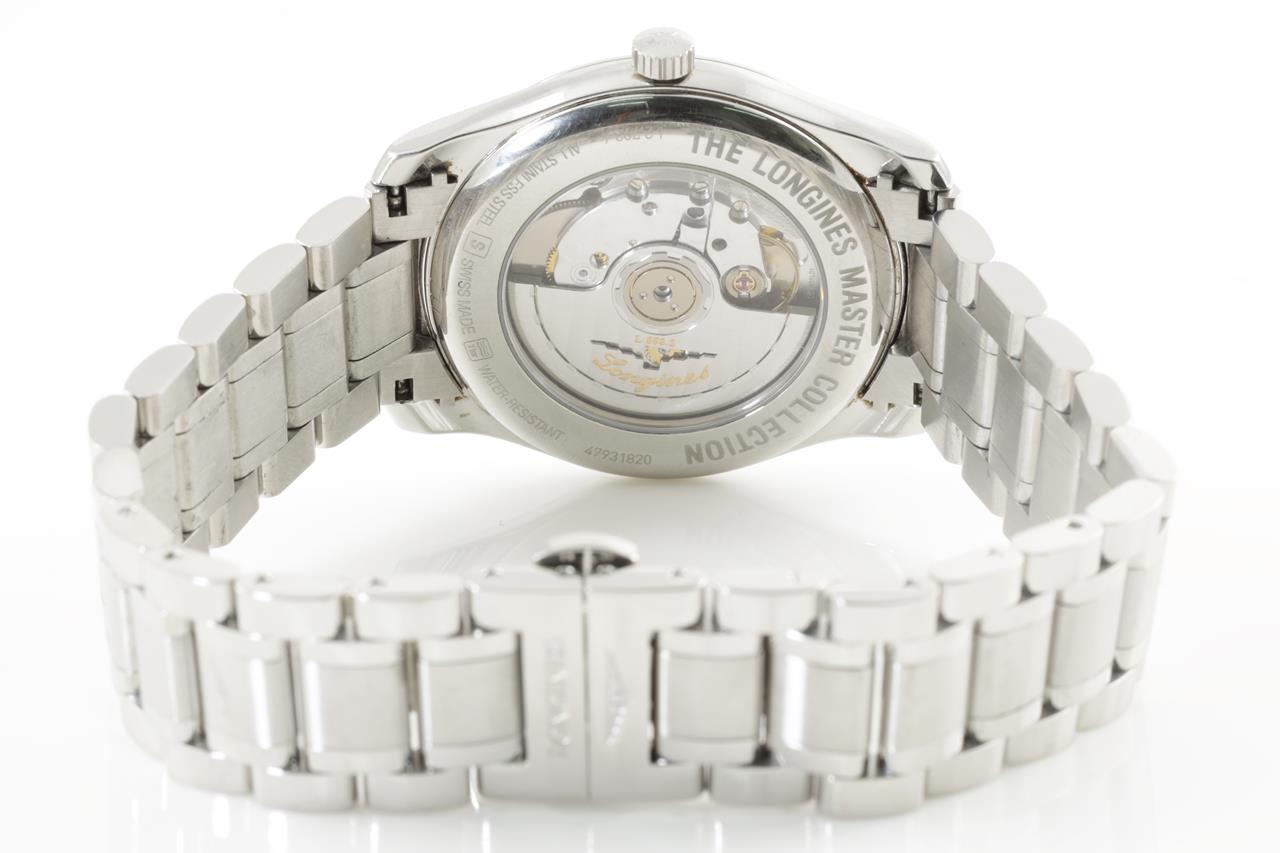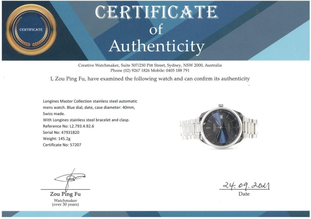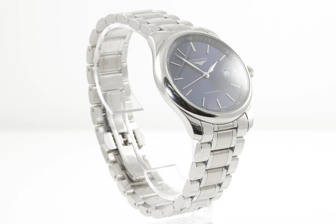 Longines Master Collection stainless steel automatic mens watch. Blue dial, date, case diameter: 40mm, wrist size: 21cm, Swiss made. Ref# L2.793.4.92.6. With Longines stainless steel bracelet and clasp. With certificate of authenticity, Longines international warranty card dated 11/6/2018 and Longines box. 3 month FSA warranty. (Pre-owned)
