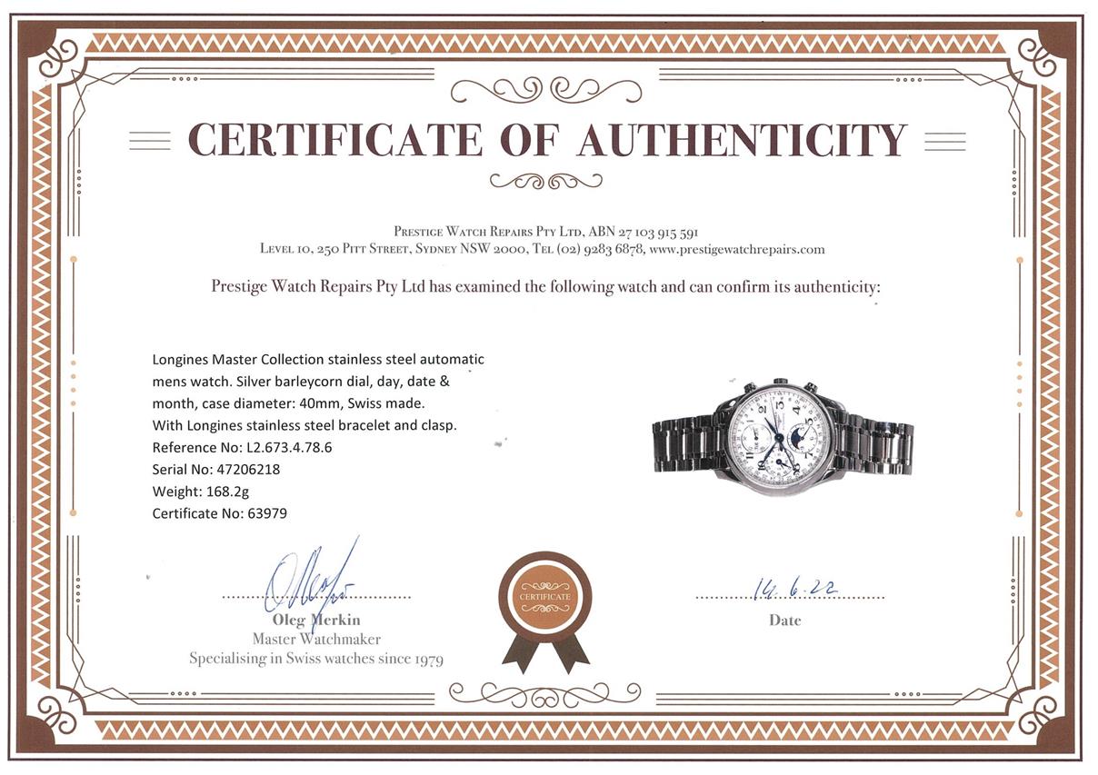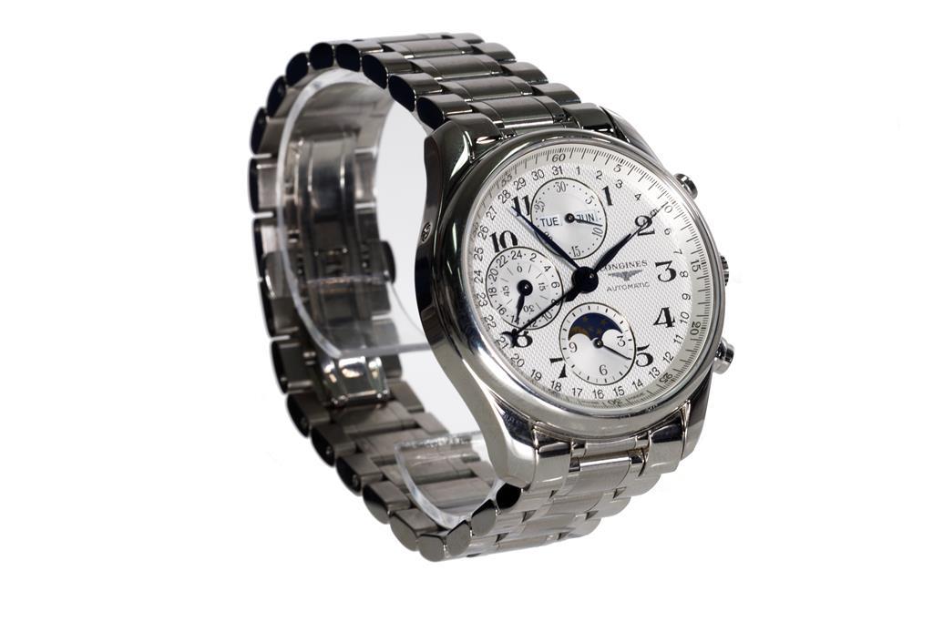 Longines Master Collection stainless steel automatic mens watch. Silver barleycorn dial, day, date & month, case diameter: 40mm, wrist size: 20cm, Swiss made. Ref# L2.673.4.78.6. With Longines stainless steel bracelet and clasp. With Certificate of Authenticity, Longines International Warranty Card dated 18/06/2018 and Longines box. 3 month FSA warranty. (Pre-owned)