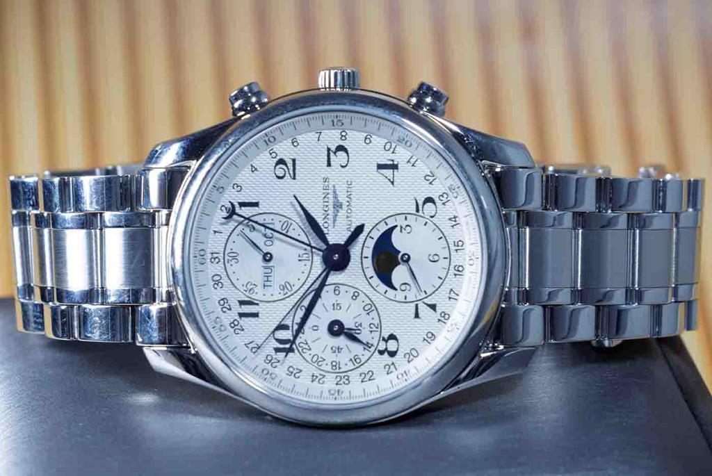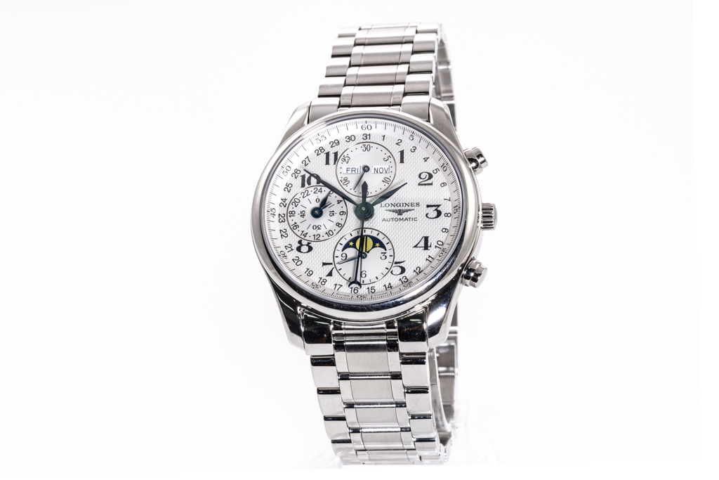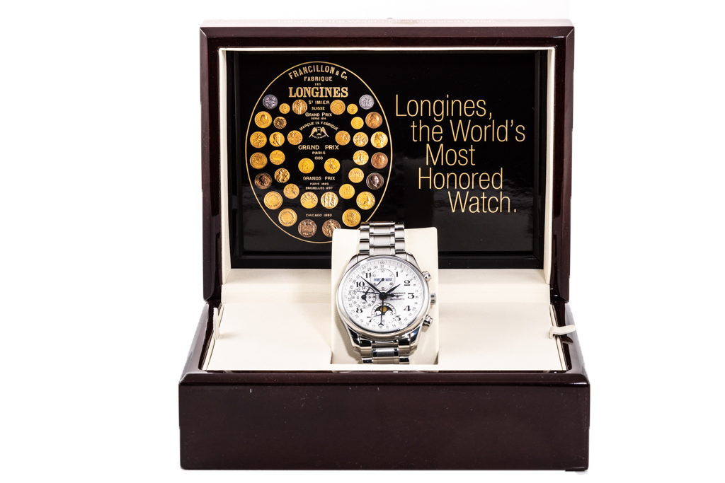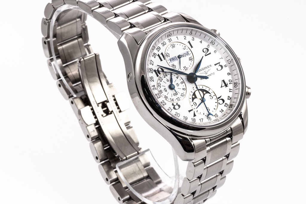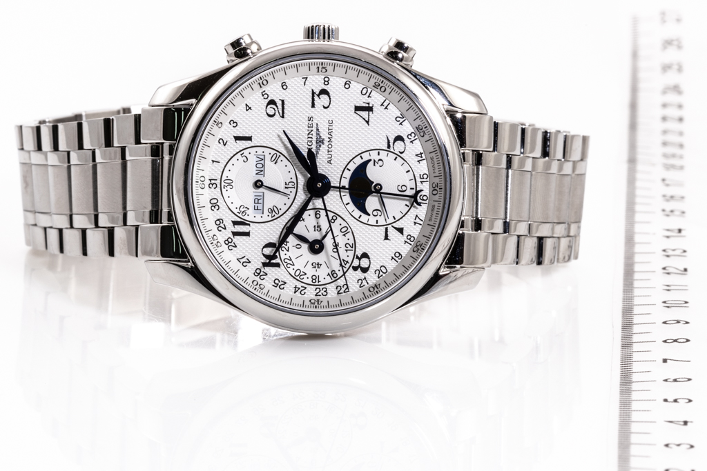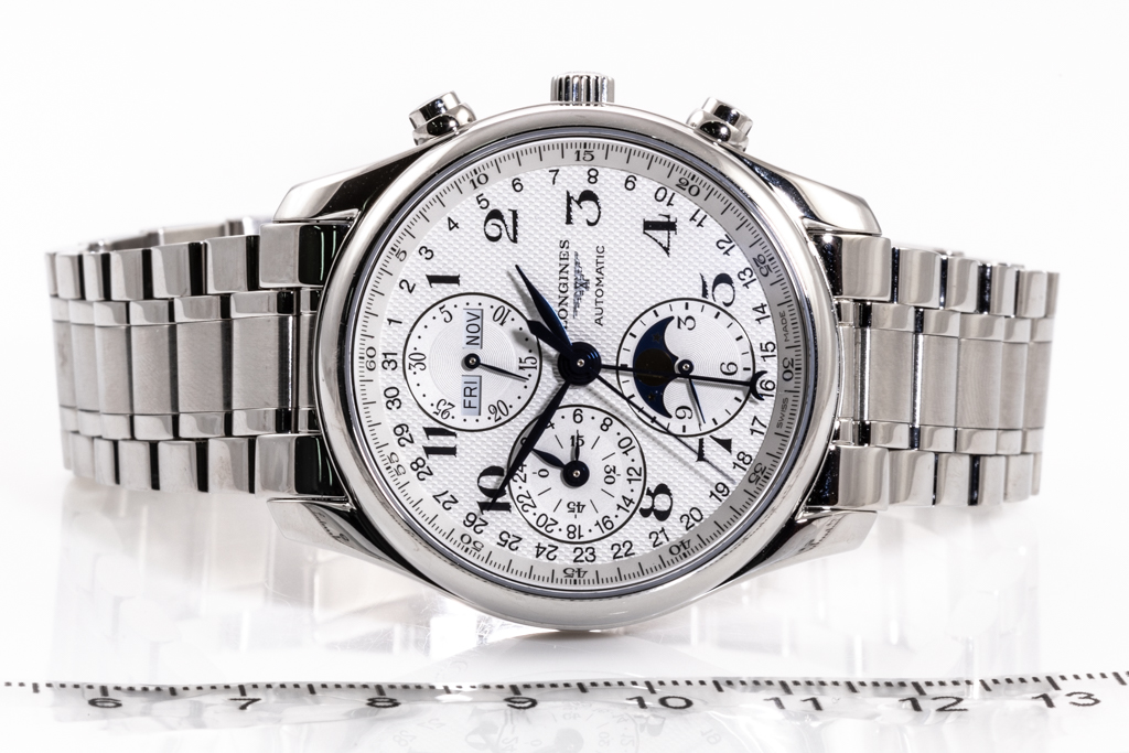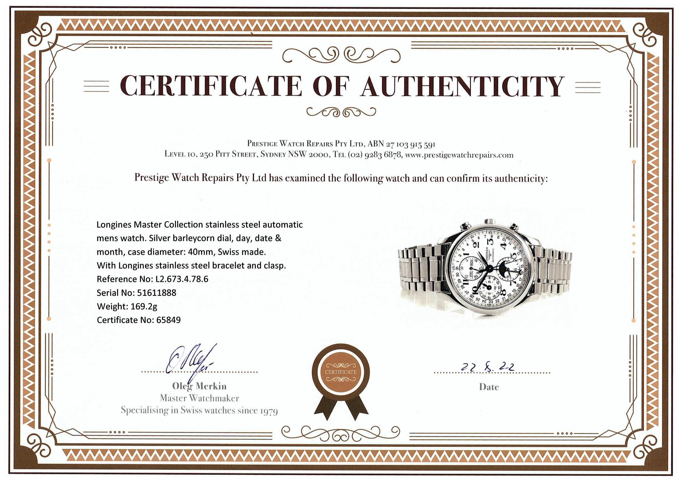 Longines Master Collection stainless steel automatic mens watch. Silver barleycorn dial, day, date & month, case diameter: 40mm, wrist size: 21cm, Swiss made. Ref# L2.673.4.78.6. With Longines stainless steel bracelet and clasp. With Certificate of Authenticity, Longines International Warranty Card dated 22/08/2009 and Longines box. 3 month FSA warranty. (Pre-owned)