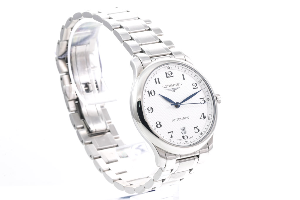 Longines Master Collection stainless steel automatic mens watch. Silver dial, date, case diameter: 38.5mm, wrist size: 21cm, Swiss made. Ref# L26284786. With Longines stainless steel bracelet and clasp. With Longines International Warranty card and With Longines box. Longines 2 year warranty applies. (As New, Note: minor scratches on case and bracelet due to being display stock)