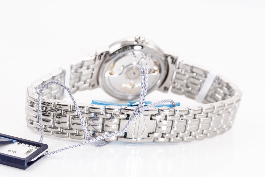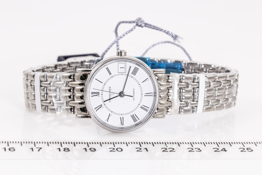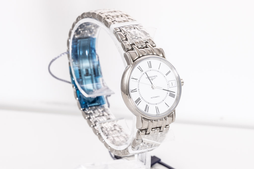 Longines Presence stainless steel automatic ladies watch. White dial, date, case diameter: 30mm, wrist size: 19cm, Swiss made. Ref# L43224116. With Longines stainless steel bracelet and clasp. With Longines International warranty card - to be registered online and instructions will be provided. (As New, Note: minor scratches on case due to display stock and bracelet in original wrapping)