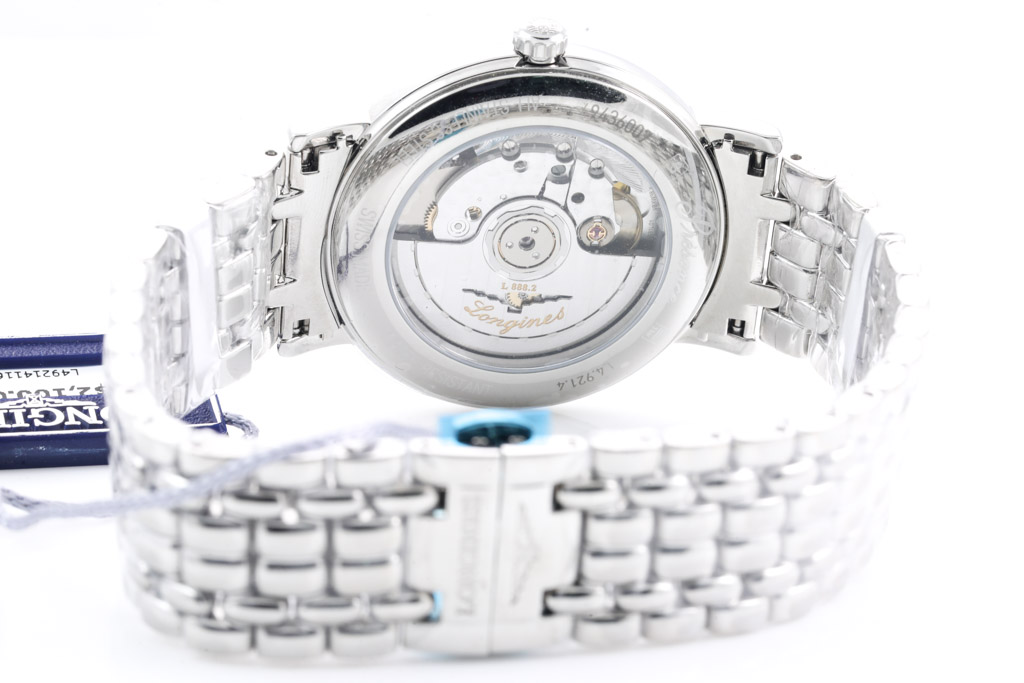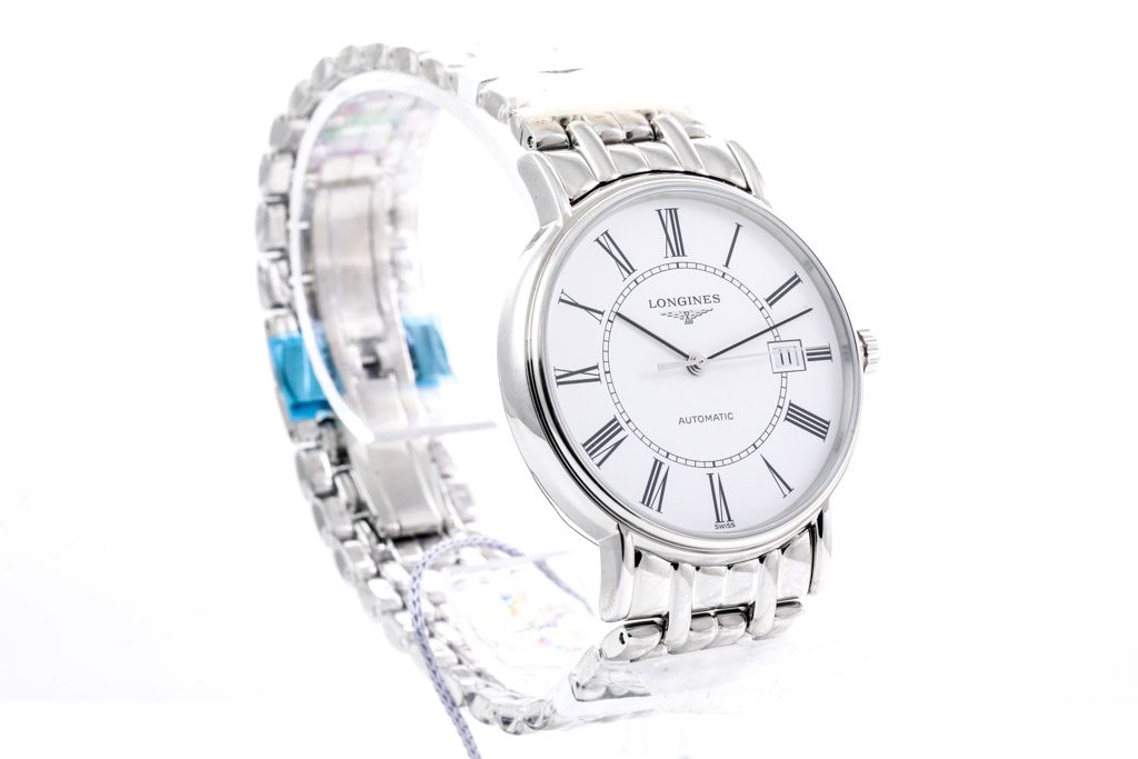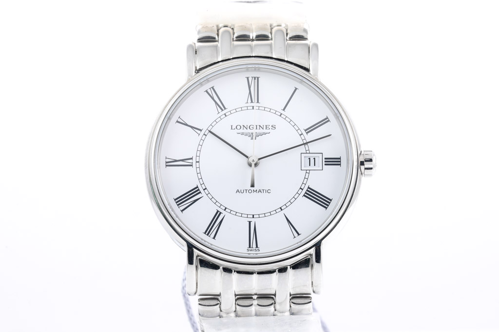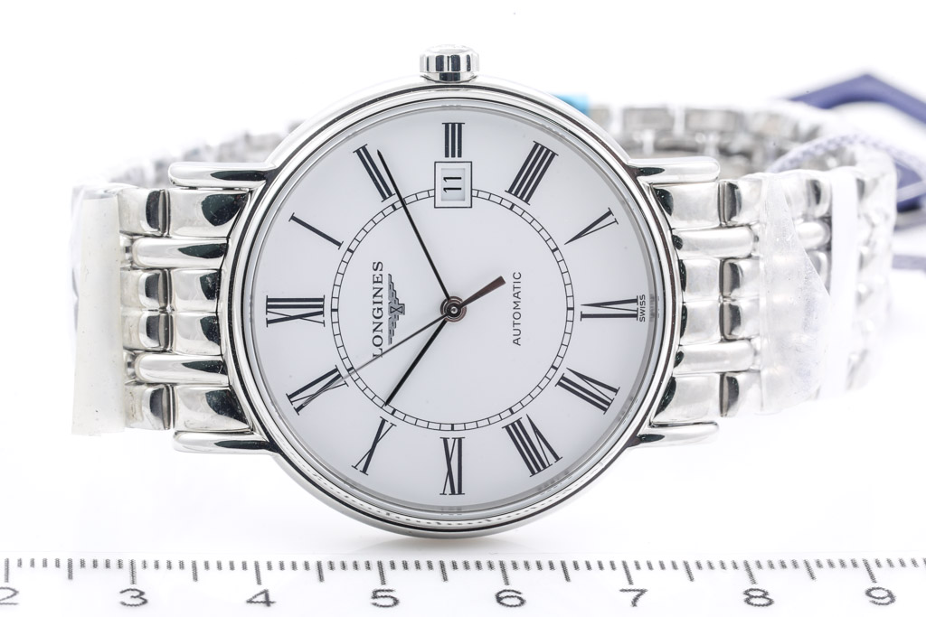 Longines Presence stainless steel automatic mens watch. White dial, date, case diameter: 38.5mm, wrist size: 20cm, Swiss made. Ref# L49214116. With Longines stainless steel bracelet and clasp. With Longines International Warranty card and Longines box. Longines 2 year warranty applies. (As New, Note: minor scratches on case due to being display stock and bracelet in original wrapping)