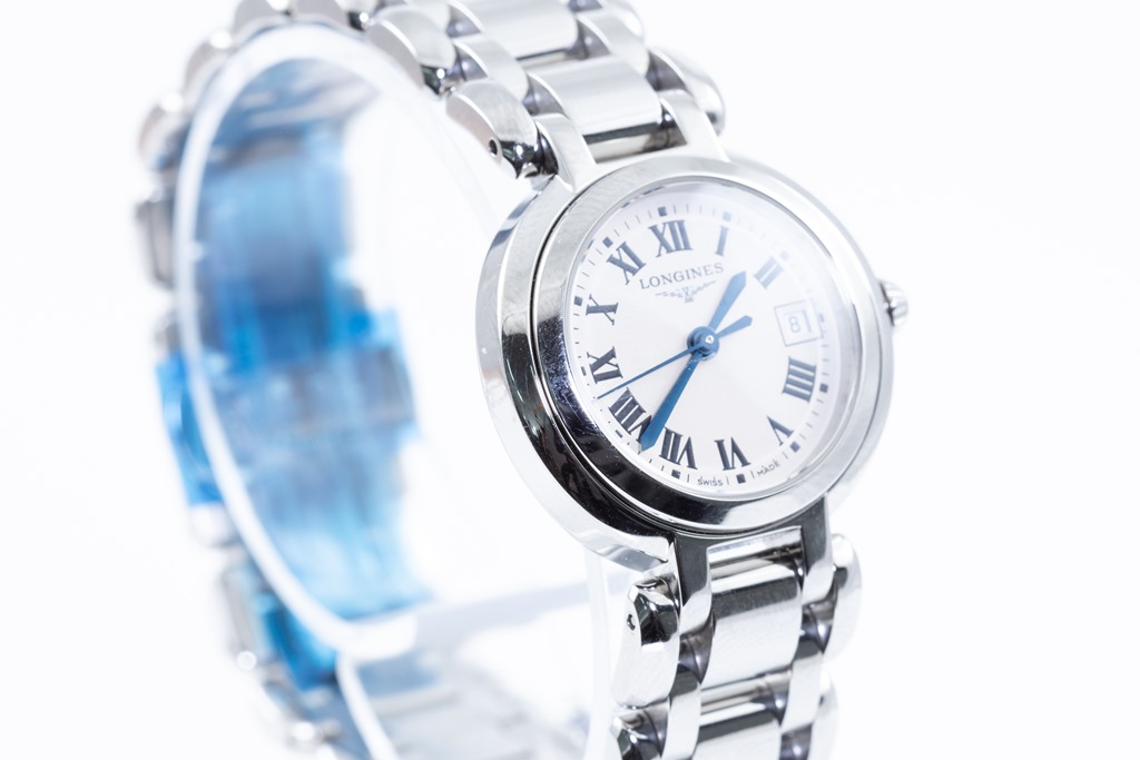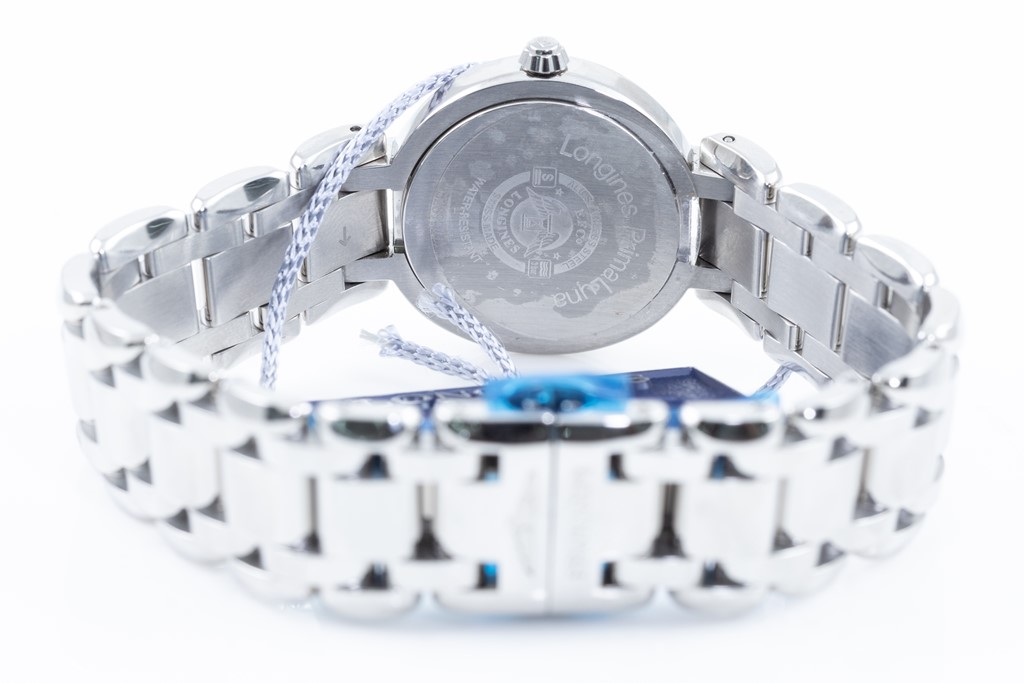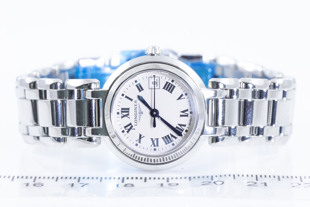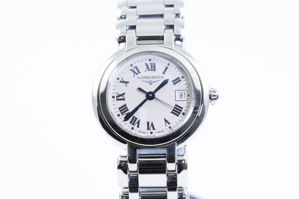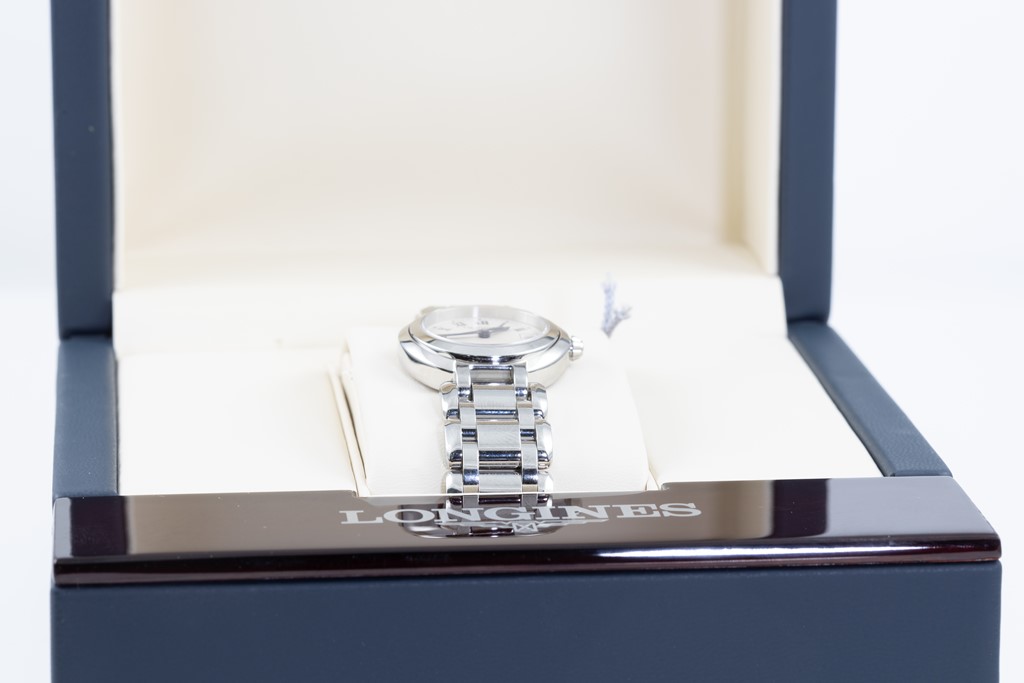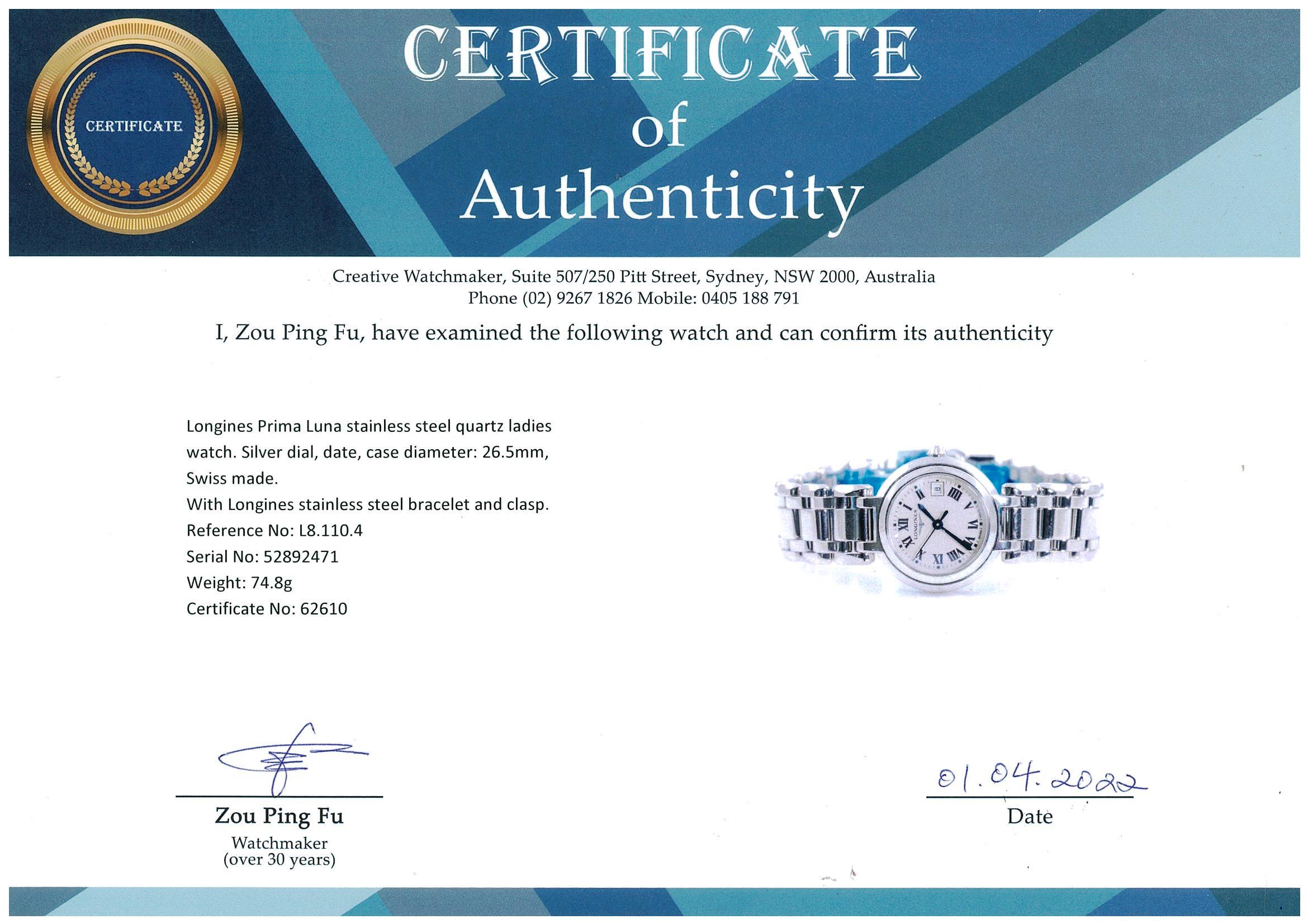 Longines Prima Luna stainless steel quartz ladies watch. Silver dial, date, case diameter: 26.5mm, wrist size: 16cm, Swiss made. Ref# L8.110.4. With Longines stainless steel bracelet and clasp. With Certificate of Authenticity, Longines International Warranty Card and Longines box. 3 month FSA warranty. (Pre-owned)