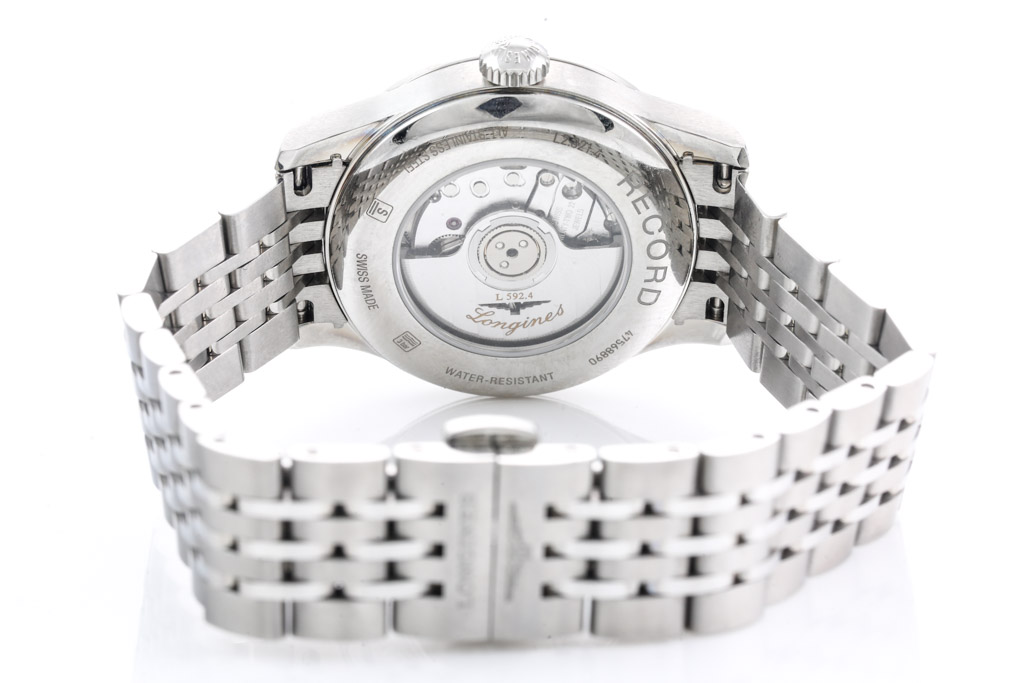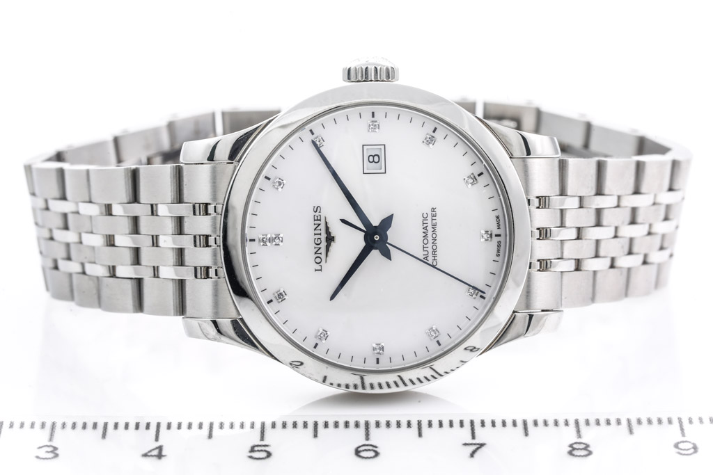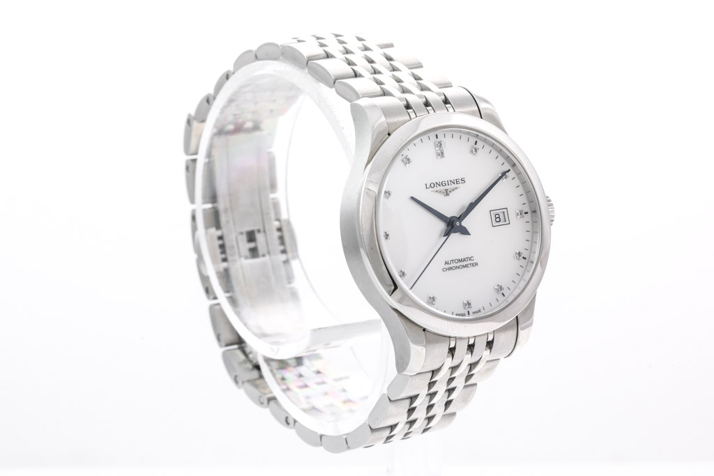 Longines Record stainless steel automatic ladies watch. Mother of Pearl dial, Diamond indicators, date, case diameter: 30mm, writs size: 17cm, Swiss made. Ref# L23214876. With Longines stainless steel bracelet and clasp. With Longines International Warranty card, Longines Diamond Certificate card and Longines box. Longines 2 year warranty applies. (As New, Note: minor scratches on case and bracelet due to being display stock)