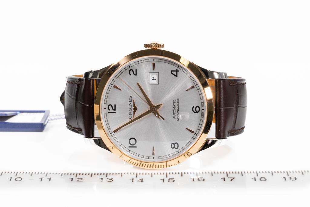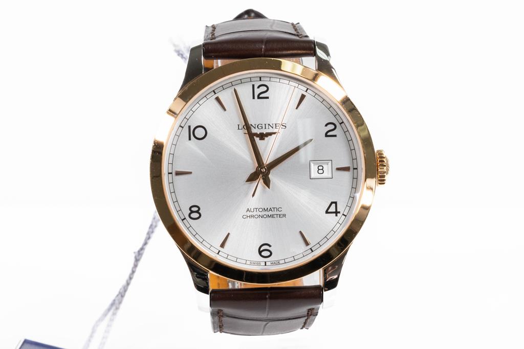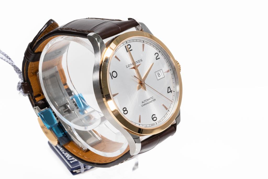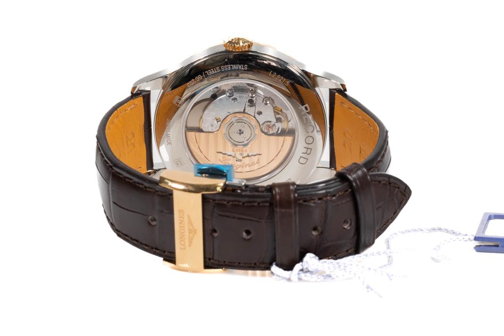Longines Record 18ct rose gold and stainless steel automatic mens watch. Silver dial, date, case diameter: 40mm, adjustable max wrist size: 21cm, Swiss made. Ref# L28215762. With Longines brown leather strap and clasp. With Longines International Warranty card, Longines COSC Certificate card and Longines box. Longines 2 year warranty applies. (As New, Note: light wear on strap and minor scratches on case due to being display stock)