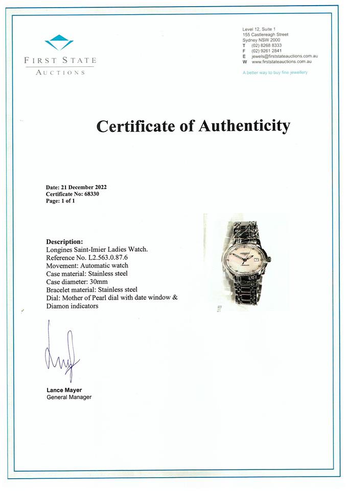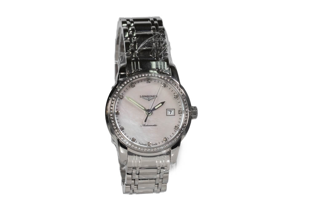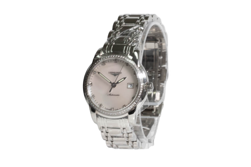Longines Saint-Imier stainless steel automatic ladies watch. Mother of Pearl dial, Diamond indicators, Diamond set bezel, case diameter: 30mm, wrist size: 20cm, Swiss made. Ref# L2.563.0.87.6. With Longines stainless steel bracelet and clasp. With FSA Certificate of Authenticity, Longines Instructions for use booklet and Longines box. 3 month FSA warranty. (As New, Note: minor scratches on case and bracelet due to being display stock)
