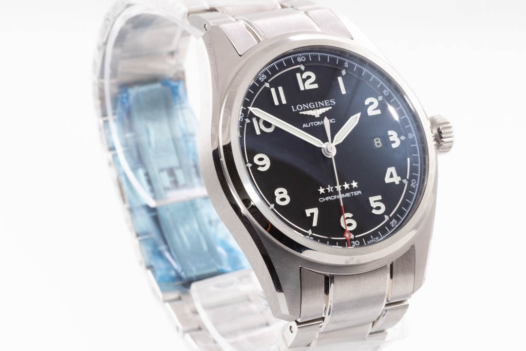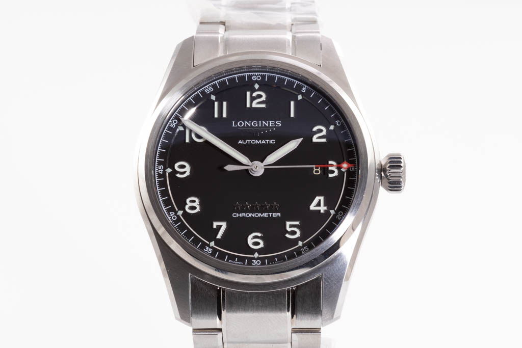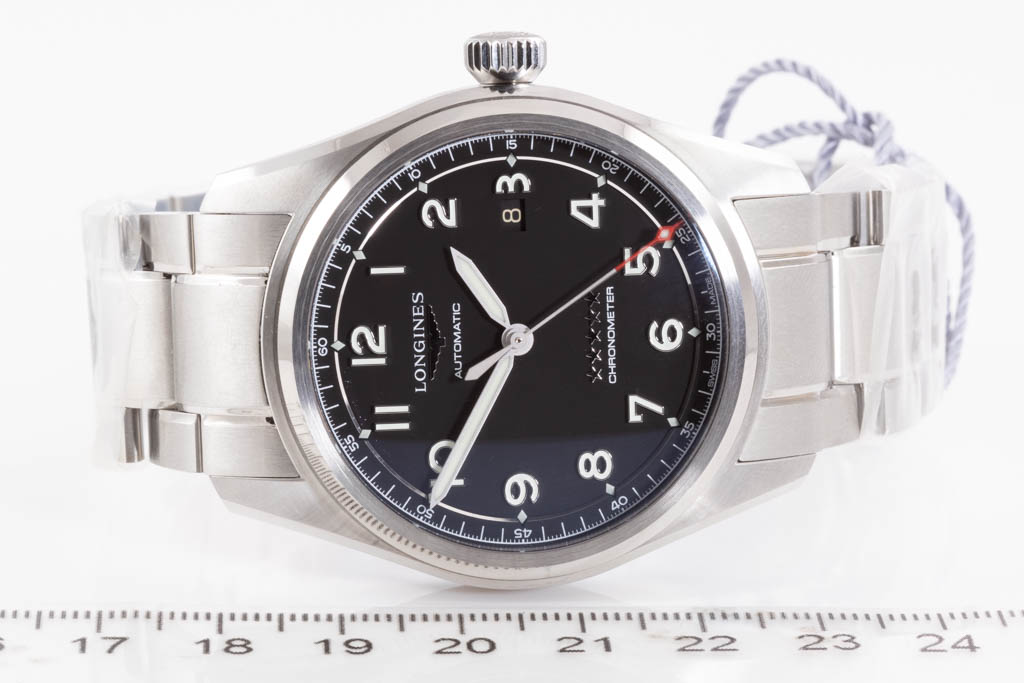 Longines Spirit stainless steel automatic mens watch. Black dial, date, case diameter: 42mm, wrist size: 19.5cm, Swiss made. Ref# L38114536. With Longines stainless steel bracelet and clasp. With International Warranty card, Longines COSC Certificate card and Longines box. Longines 2 year warranty applies. (As New, Note: minor scratches on case due to being display stock and bracelet in original wrapping)