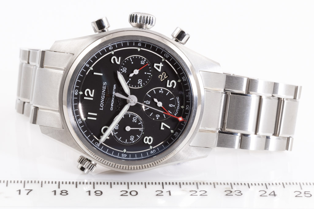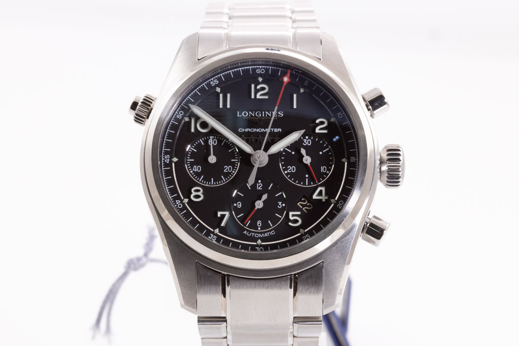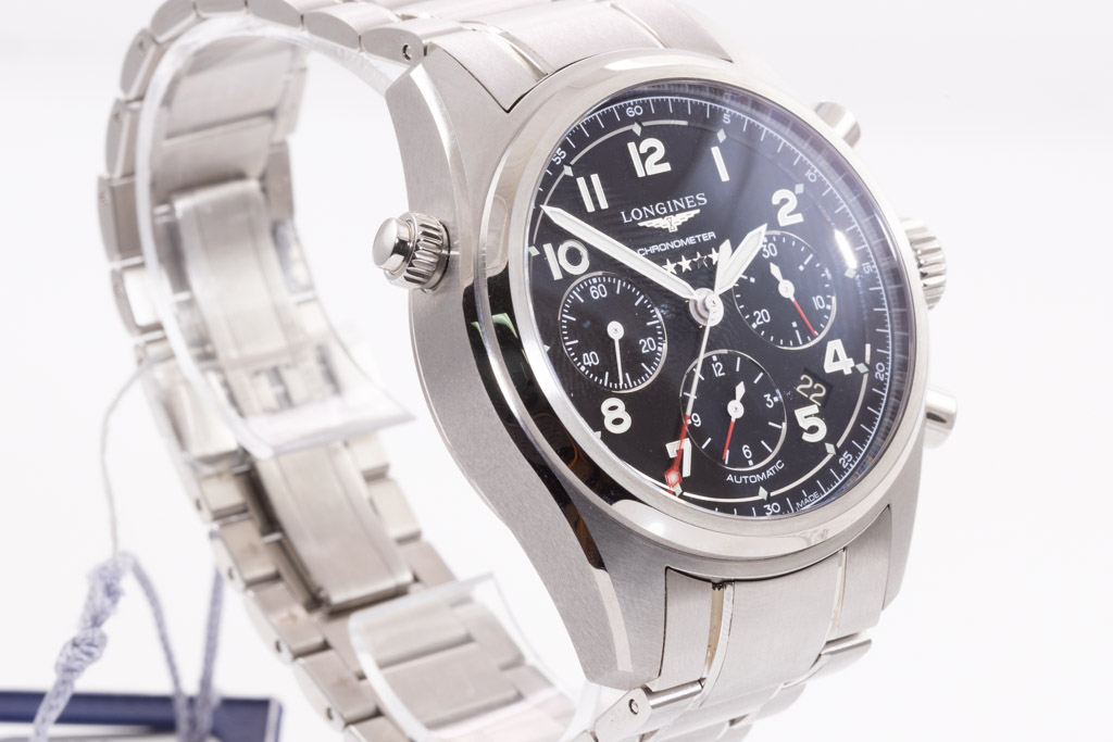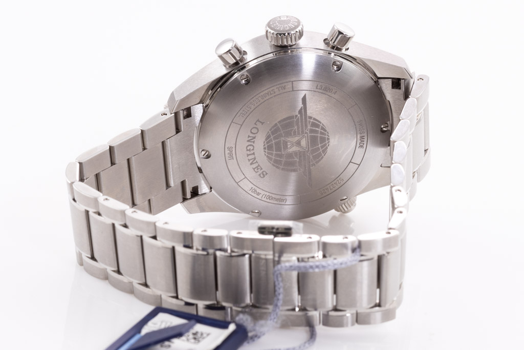 Longines Spirit stainless steel automatic men's watch. Black chronograph dial, date, case diameter: 42mm, wrist size: 20cm, Swiss made. Ref# L38204536. With Longines stainless steel bracelet and clasp. With International Warranty card, Longines COSC Certificate card and Longines box. Longines 2 year warranty applies. (As New, Note: minor scratches on case and bracelet due to being display stock)