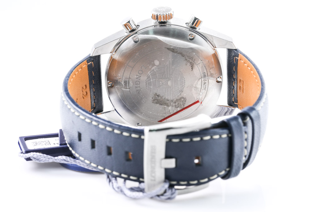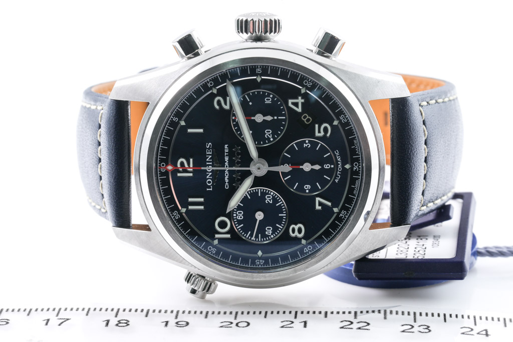 Longines Spirit stainless steel automatic mens watch. Blue chronograph dial, date, case diameter: 42mm, strap length: 21cm, Swiss made. Ref# L38204930. With Longines blue leather strap and buckle. With Longines warranty card - to be registered online, details to be provided. (As New, Note: minor scratches on case and light wear bracelet due to display stock)