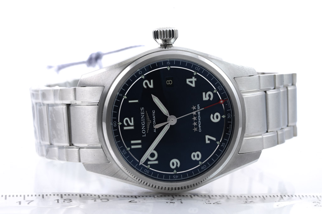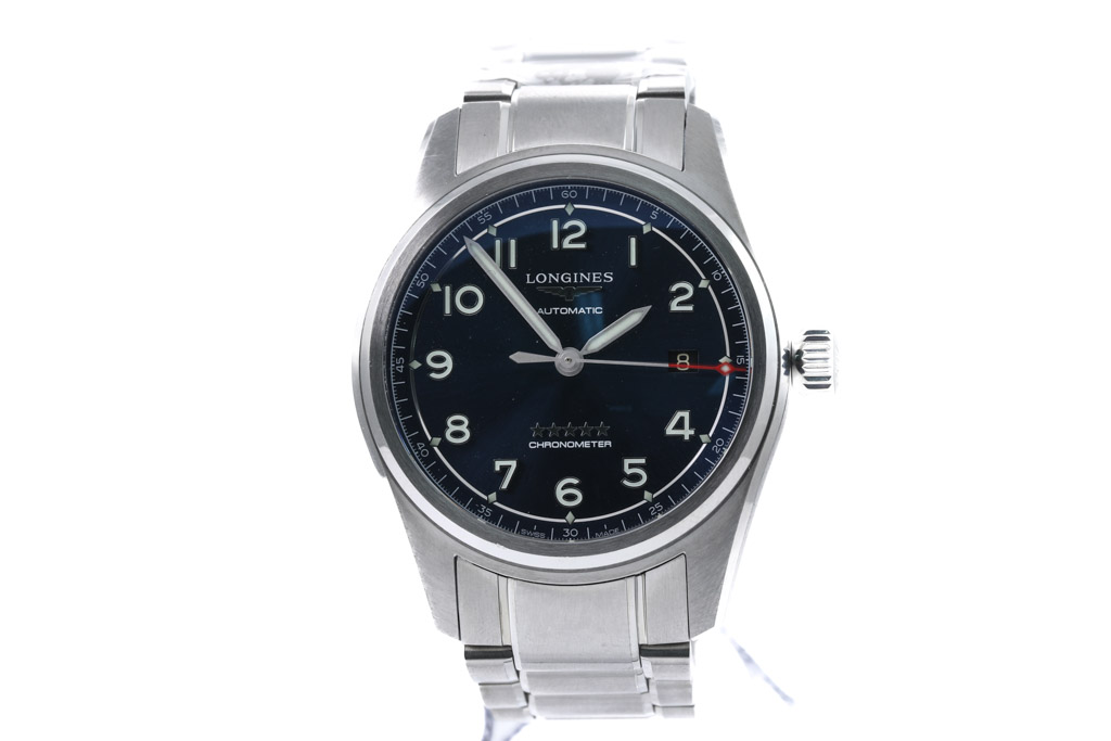Longines Spirit Prestige Edition stainless steel automatic mens watch. Blue dial, date, case diameter: 40mm, wrist size: 20cm, Swiss made. Ref#L38104939. With Longines stainless steel bracelet and clasp. With Longines International Card - to be registered online, details will be provided. With 2 spare Longines leather straps and Longines box. (As New, Note: minor scratches on case and bracelet due to display stock)