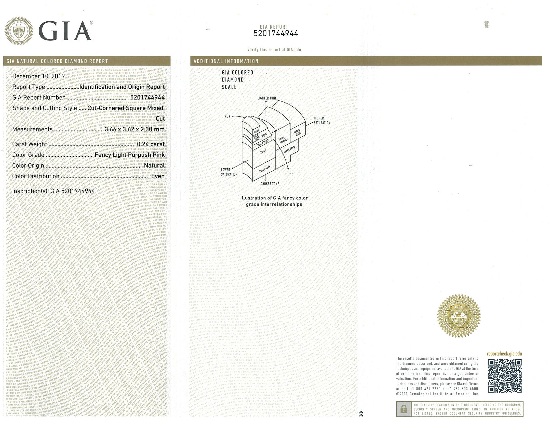 A loose cushion shaped Diamond of 0.24ct (With GIA report graded as Natural Fancy Light Purplish Pink Even #5201744944). (New)