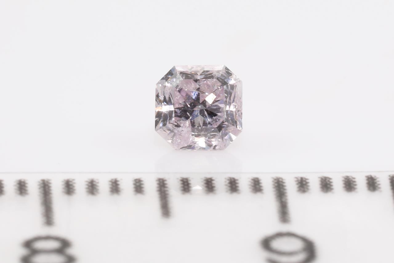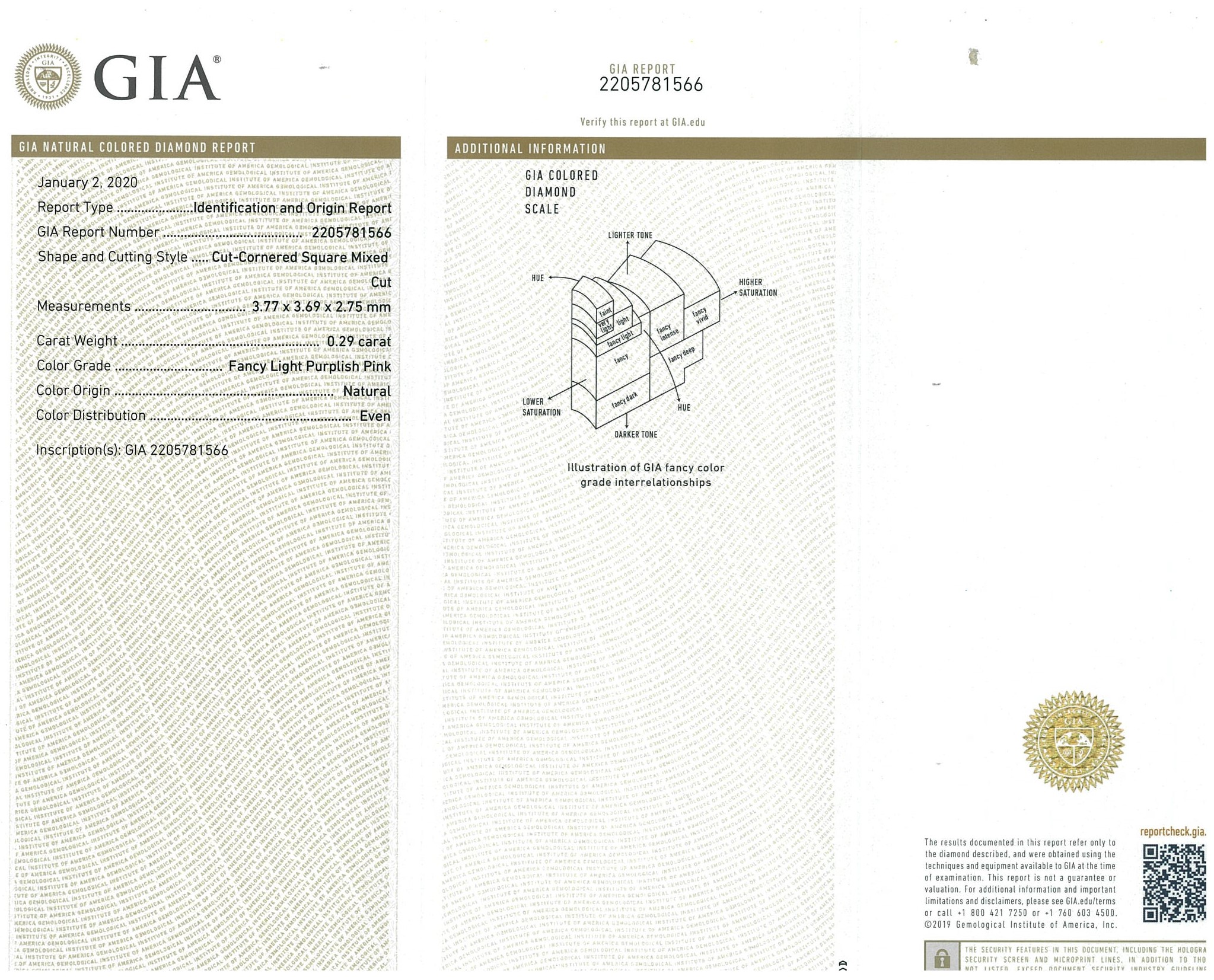 A loose radiant shaped Diamond of 0.29ct (With GIA report graded as Natural Fancy Light Purplish Pink Even #2205781566). (New)