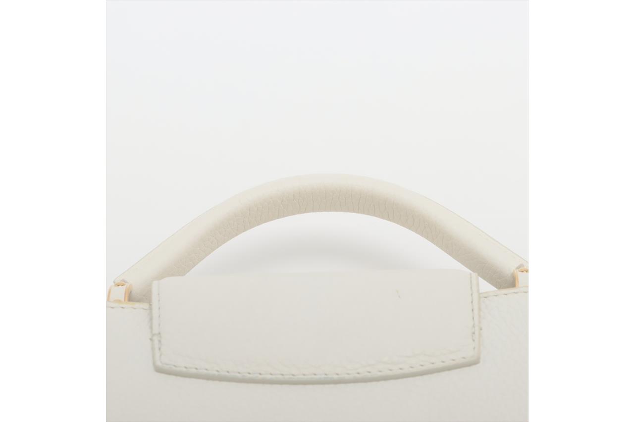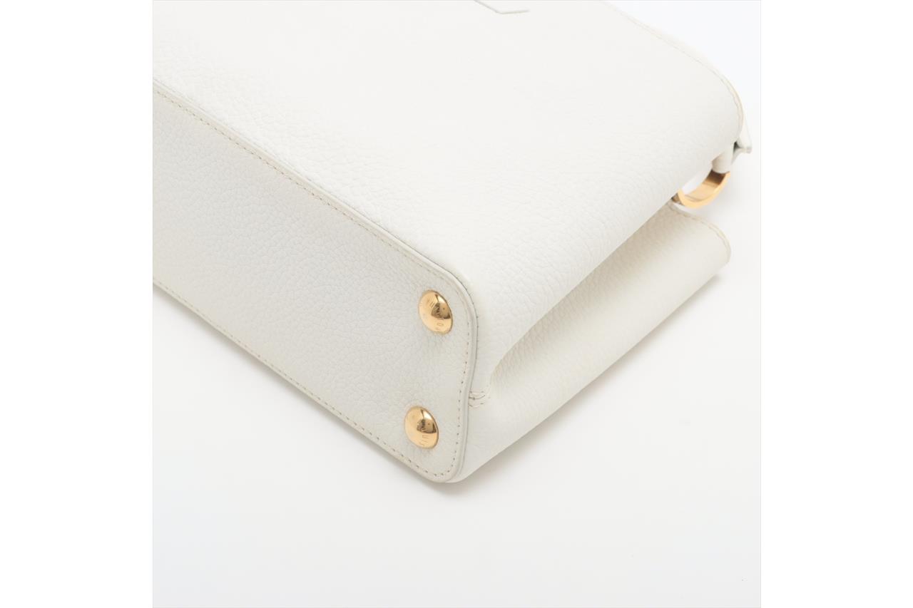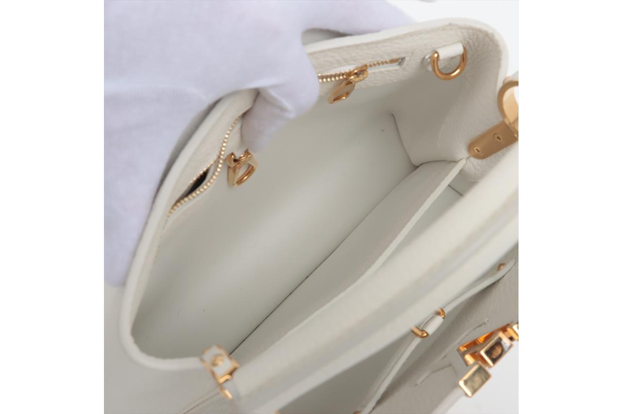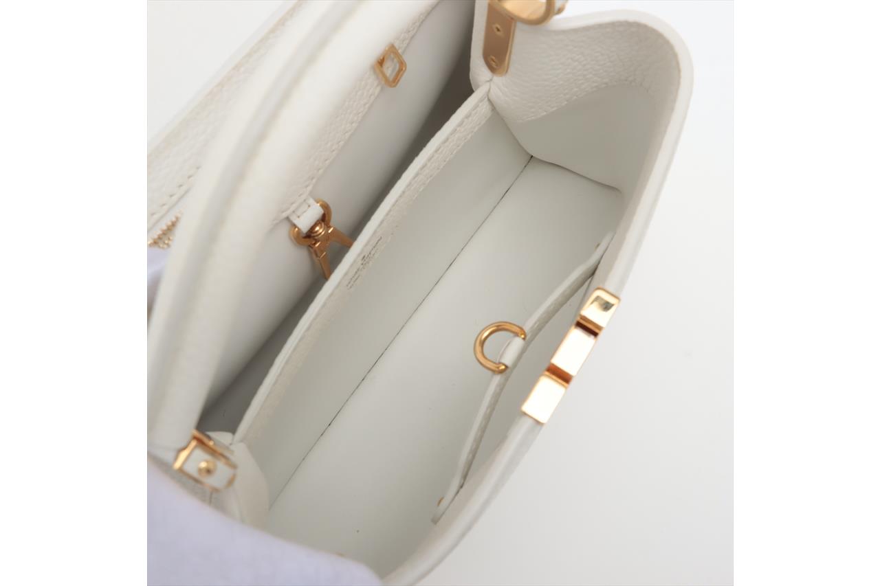 Louis Vuitton Taurillon Capucines BB in Snow Taurillon Leather. Featuring gold-tone hardware, white leather interior, 2 large inside compartments with 1 zipped pocket, and snap hook to secure belongings. Approximate dimensions: 27cm (L) x 20cm (H) x 9cm (D), 9cm handle height, and 52-56cm detachable and adjustable strap. Accompanied by Louis Vuitton booklet and dust bag. With Entrupy Certificate of Authenticity. (Pre-owned)
