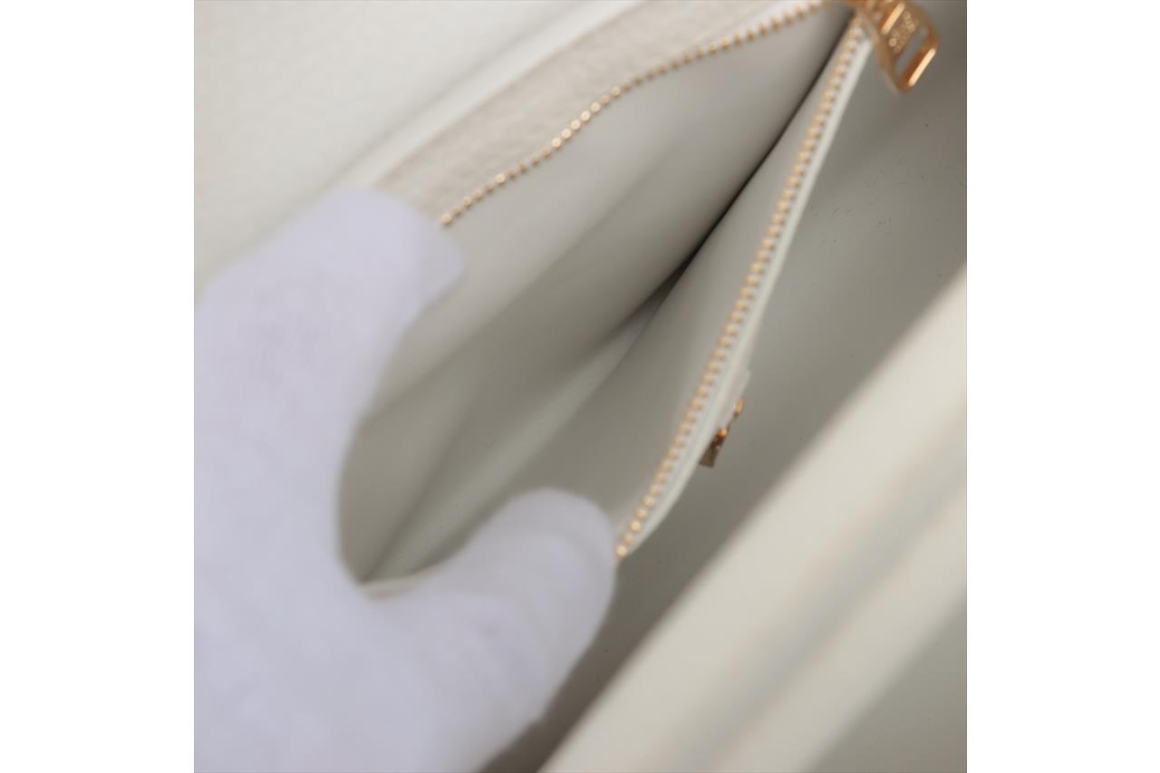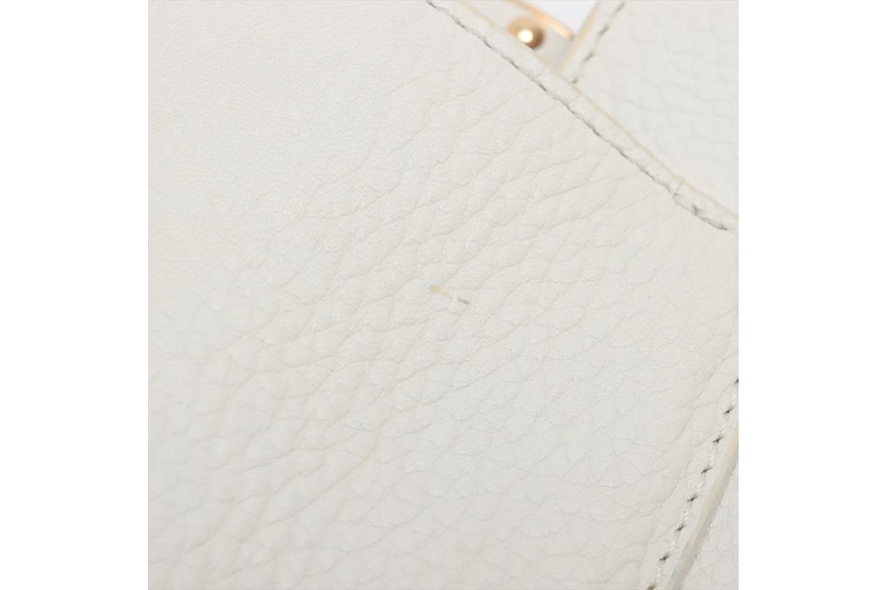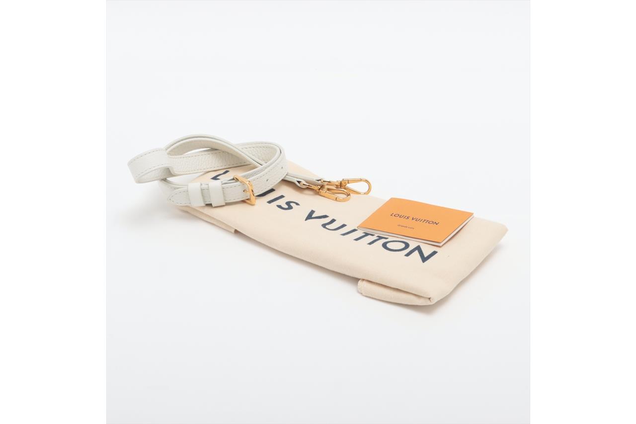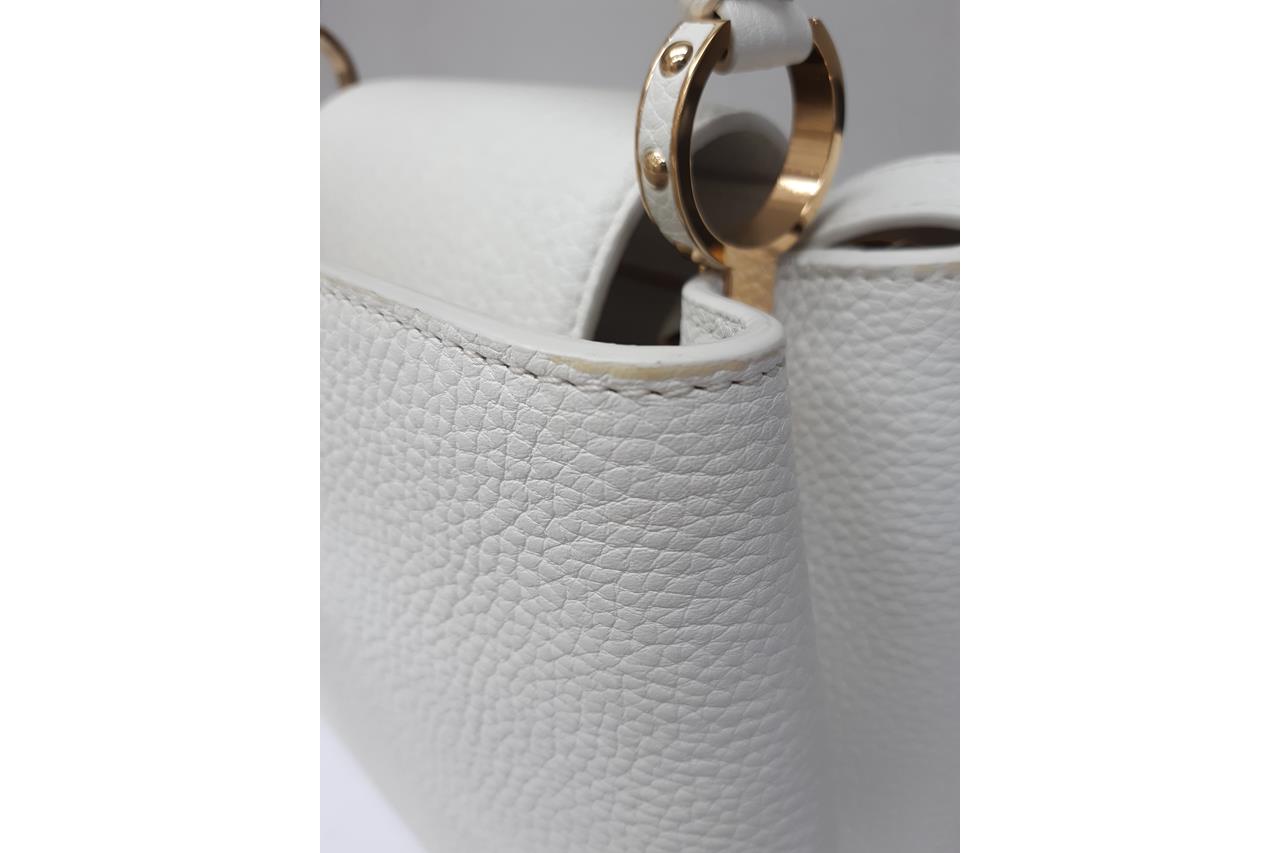 Louis Vuitton Taurillon Capucines BB in Snow Taurillon Leather. Featuring gold-tone hardware, white leather interior, 2 large inside compartments with 1 zipped pocket, and snap hook to secure belongings. Approximate dimensions: 27cm (L) x 20cm (H) x 9cm (D), 9cm handle height, and 52-56cm detachable and adjustable strap. Accompanied by Louis Vuitton booklet and dust bag. With Entrupy Certificate of Authenticity. (Pre-owned)
