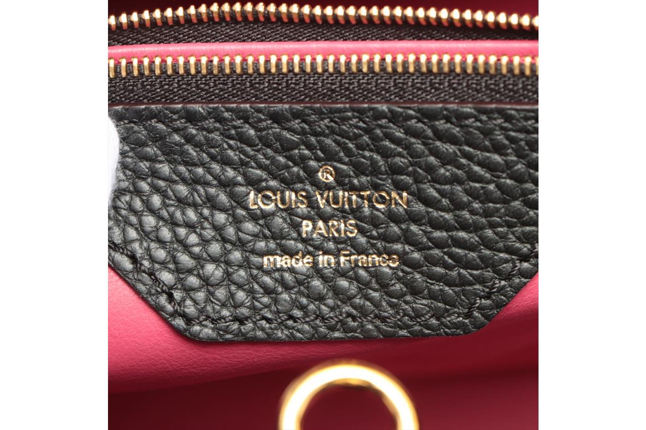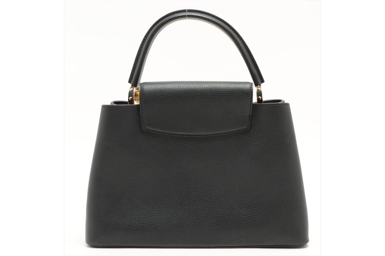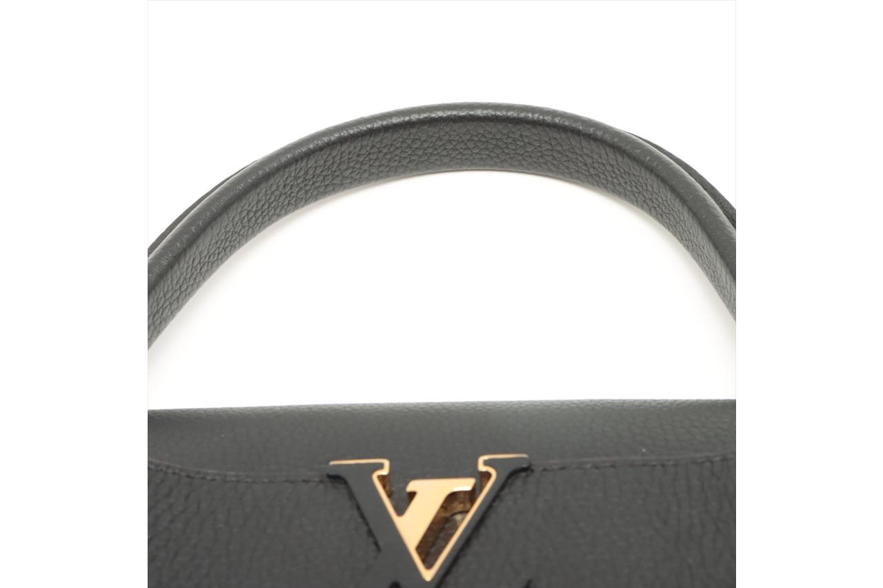 Louis Vuitton Capucines MM in Black Taurillon Leather. Featuring gold-tone hardware, cowhide-leather lining, snap hook to secure belongings, and compartmented interior with zipped pocket. Approximate dimensions: 35cm (L) x 22cm (H) x 12cm (D), and 11.5cm handle height. Shoulder strap not included. Accompanied by Louis Vuitton dust bag. With Entrupy Certificate of Authenticity. (Pre-owned)