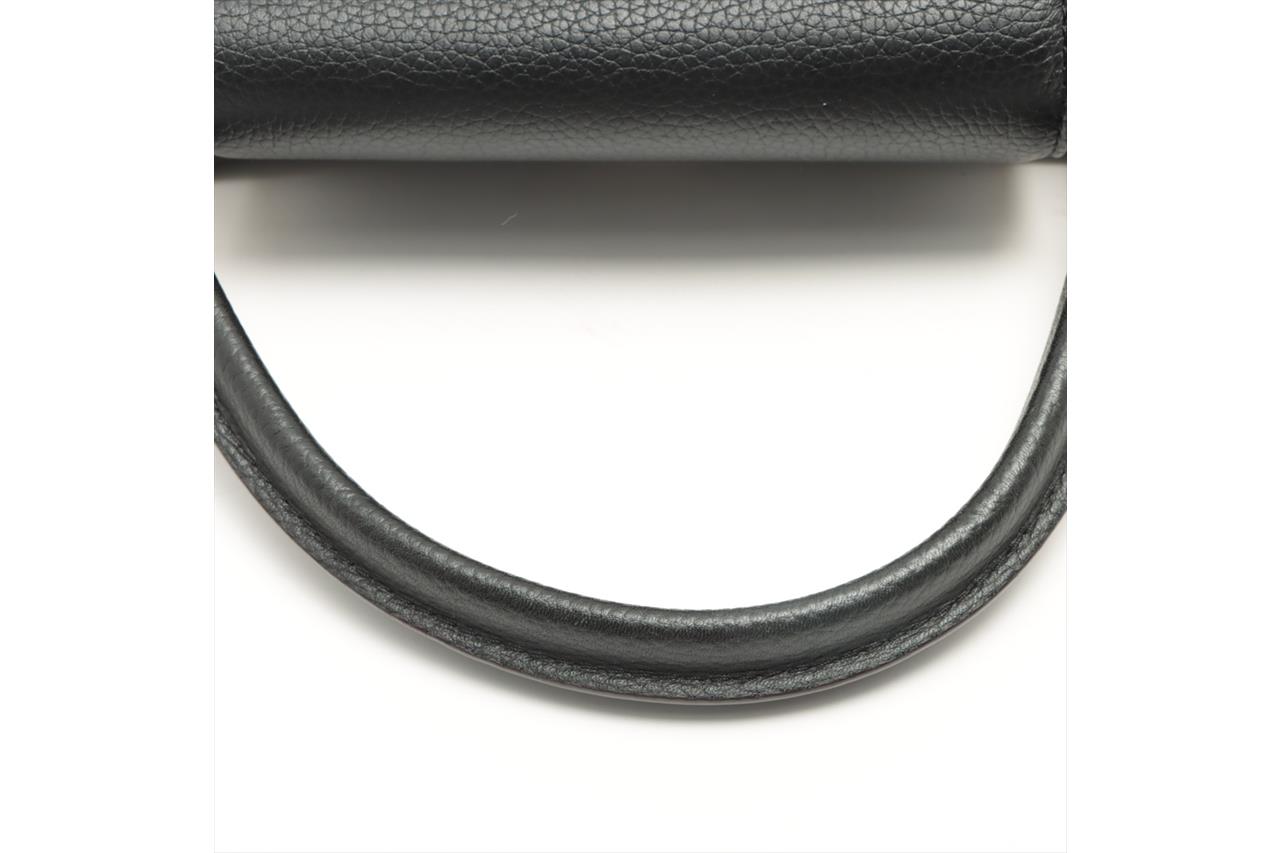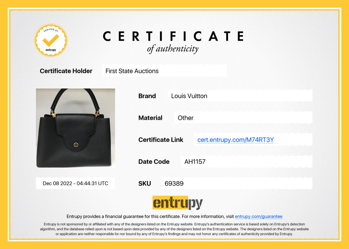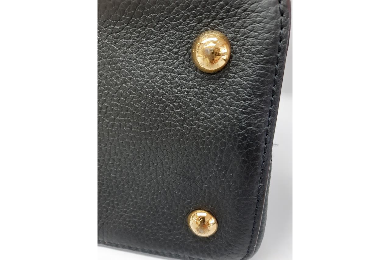 Louis Vuitton Capucines MM in Black Taurillon Leather. Featuring gold-tone hardware, cowhide-leather lining, snap hook to secure belongings, and compartmented interior with zipped pocket. Approximate dimensions: 35cm (L) x 22cm (H) x 12cm (D), and 11.5cm handle height. Shoulder strap not included. Accompanied by Louis Vuitton dust bag. With Entrupy Certificate of Authenticity. (Pre-owned)