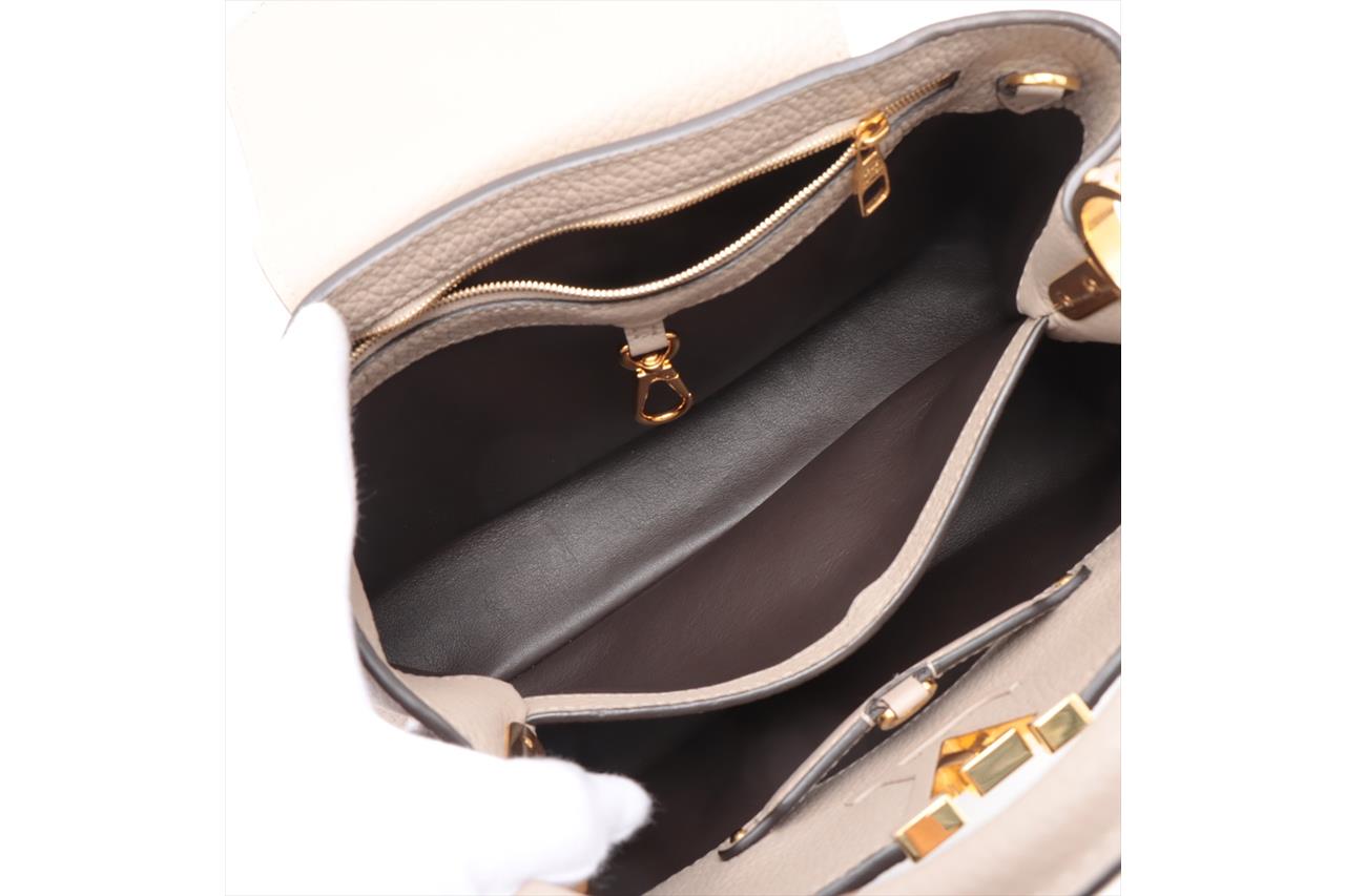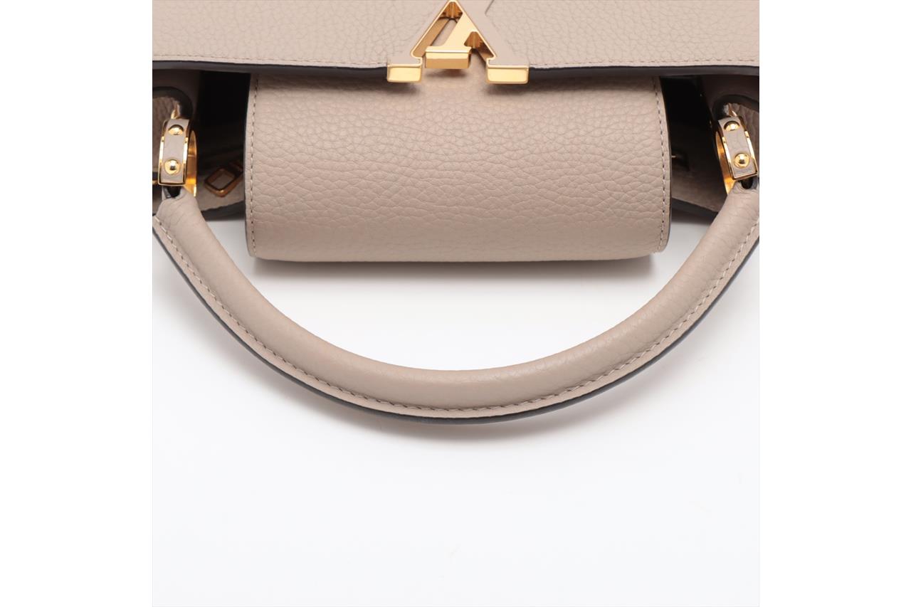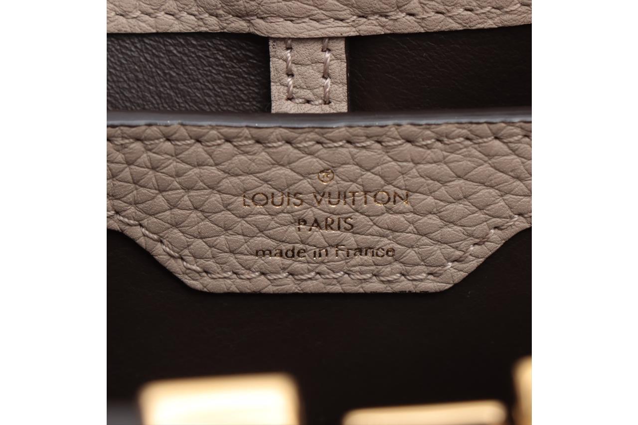 Louis Vuitton Capucines MM in Galet Taurillion Leather. Featuring cowhide leather lining, gold-tone hardware, snap and hook closure on the top, and flap with a Monogram flower motif. Approximate dimensions: 31.5cm (L) x 20cm (H) x 11cm (D), 7cm handle drop, and 48-53cm detachable and adjustable shoulder strap. Accompanied by LV gift receipt, booklets, dust bag and box. With Entrupy Certificate of Authenticity. (Pre-owned)