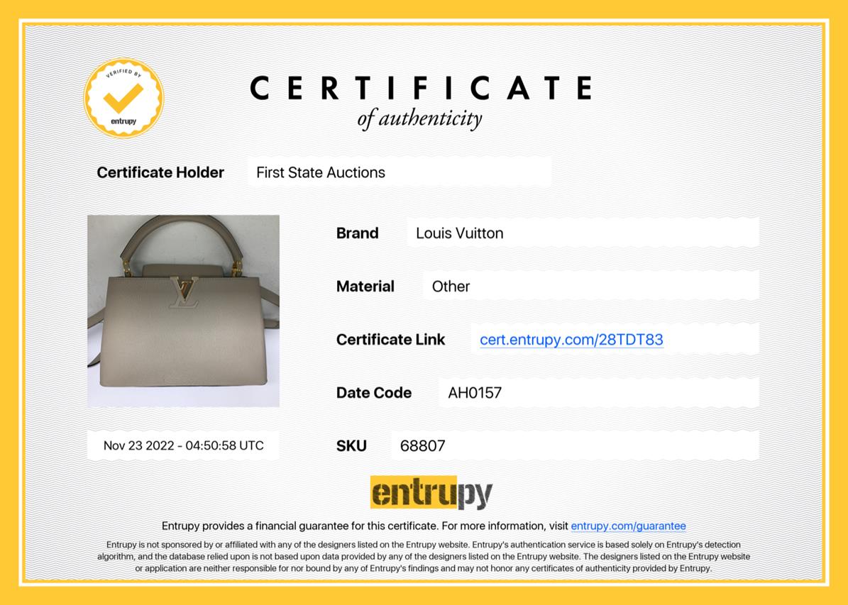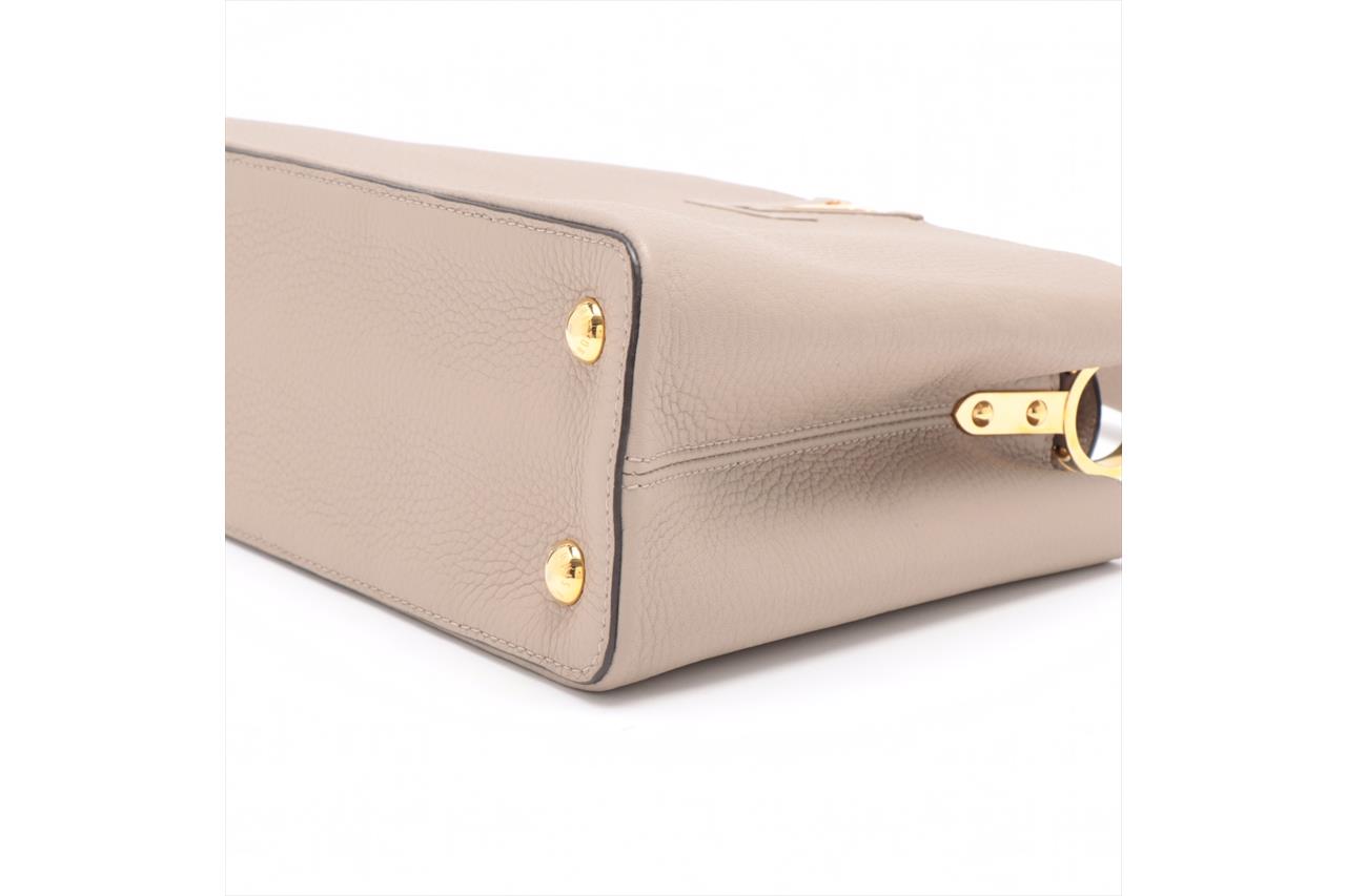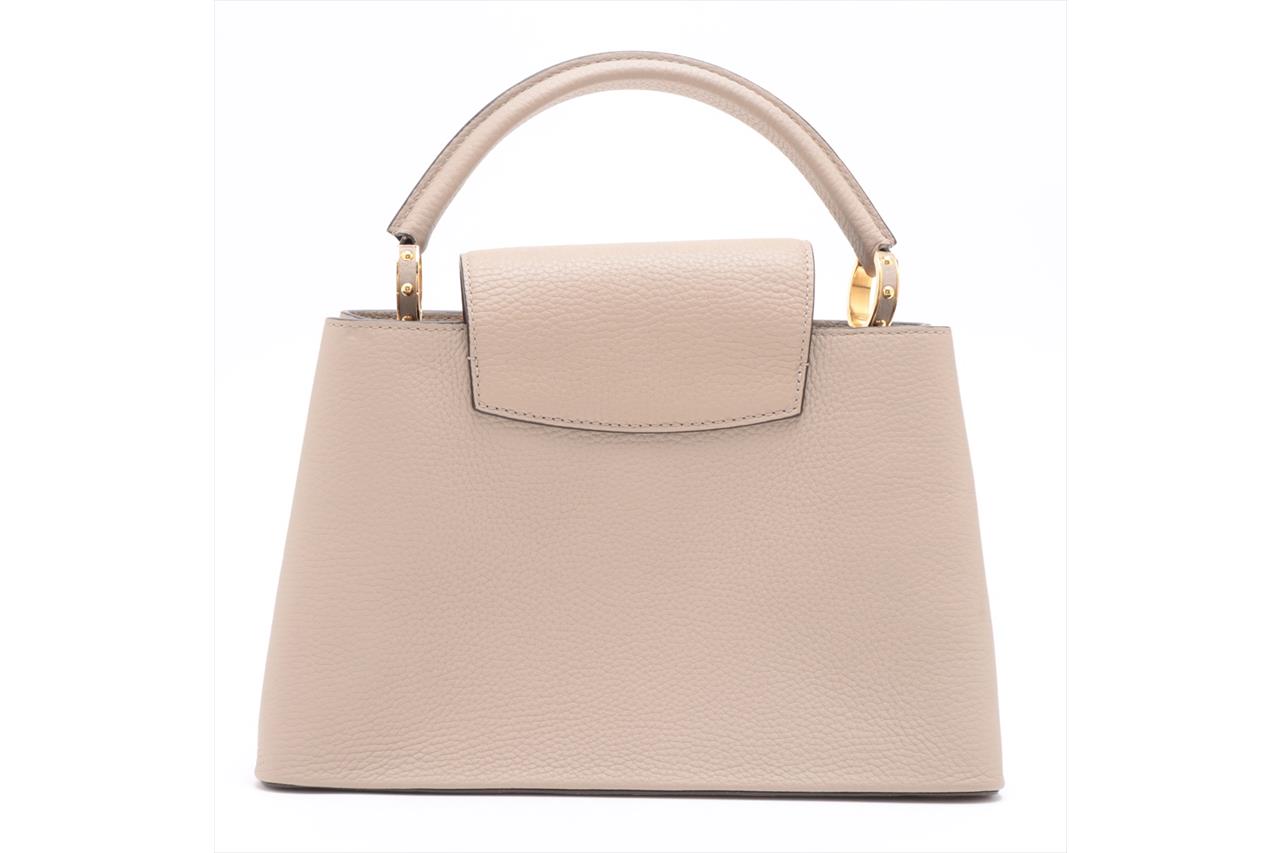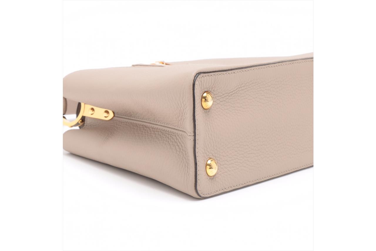 Louis Vuitton Capucines MM in Galet Taurillion Leather. Featuring cowhide leather lining, gold-tone hardware, snap and hook closure on the top, and flap with a Monogram flower motif. Approximate dimensions: 31.5cm (L) x 20cm (H) x 11cm (D), 7cm handle drop, and 48-53cm detachable and adjustable shoulder strap. Accompanied by LV gift receipt, booklets, dust bag and box. With Entrupy Certificate of Authenticity. (Pre-owned)