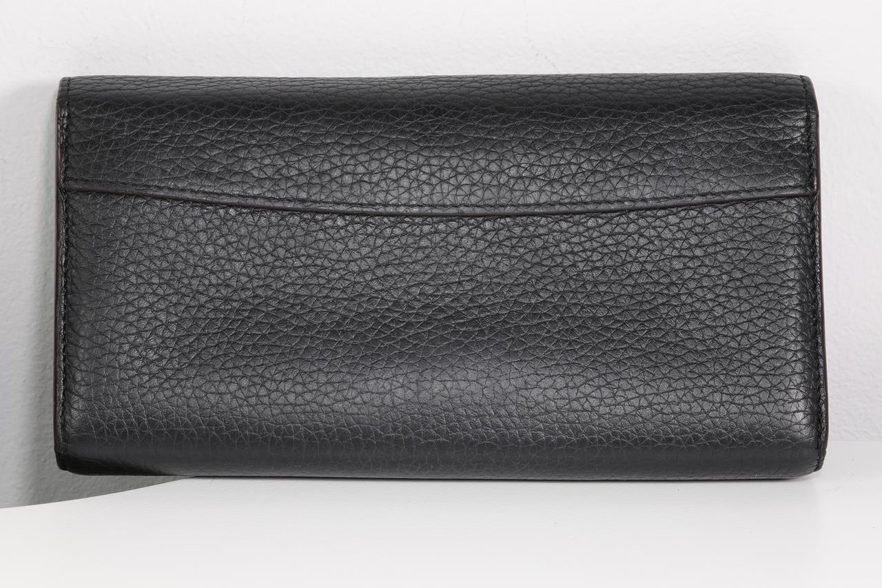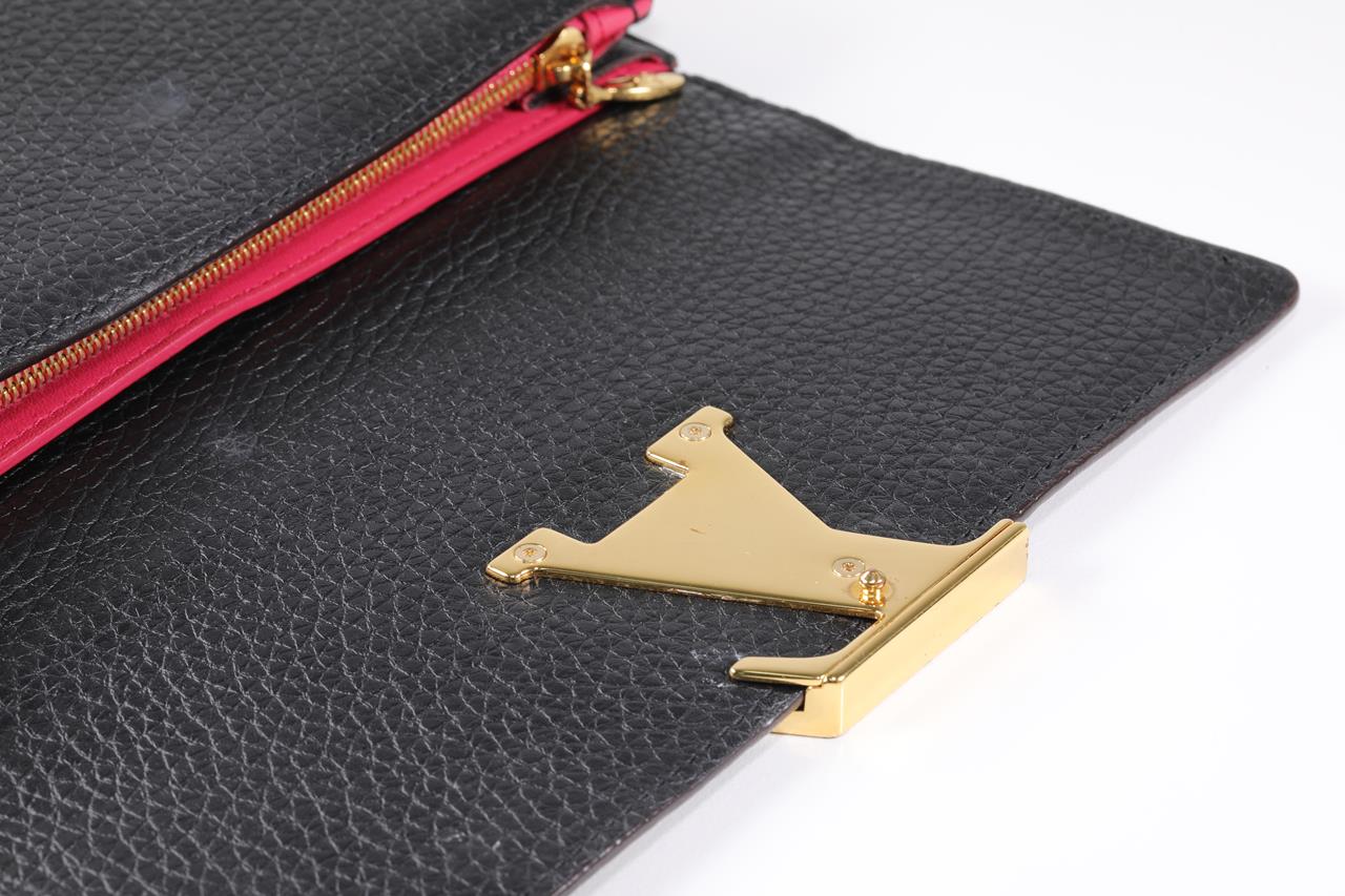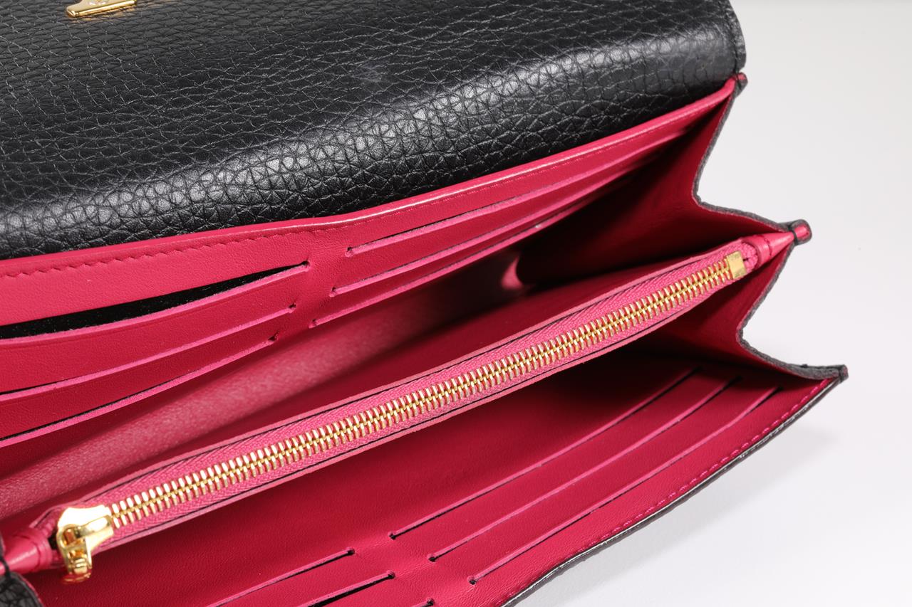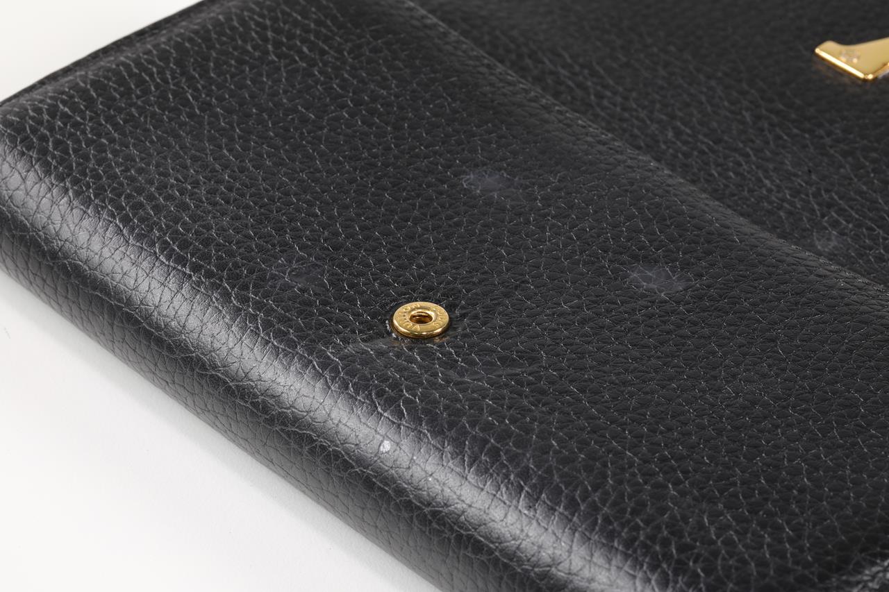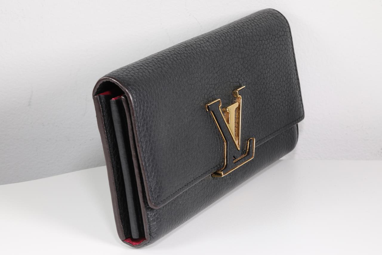 Louis Vuitton Portefeuille Capucine black Taurillon cowhide leather wallet. Design ref# M61248 MI3118. Flap opening with LV closure. Dimensions: 20 x 11 x 2.5 cm. Gold tone hardware. Made in France. With Louis Vuitton fabric care booklet, dust bag & box. (Pre-owned)