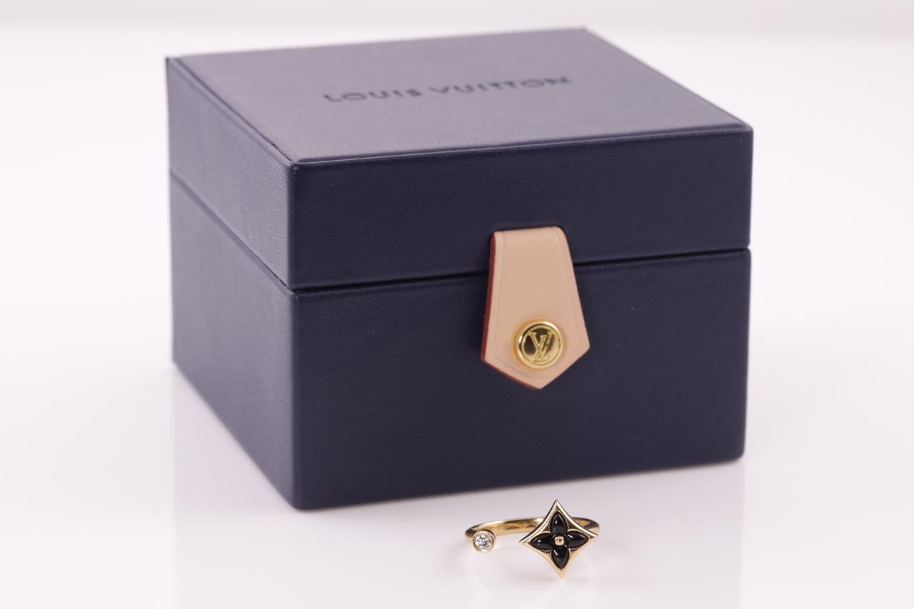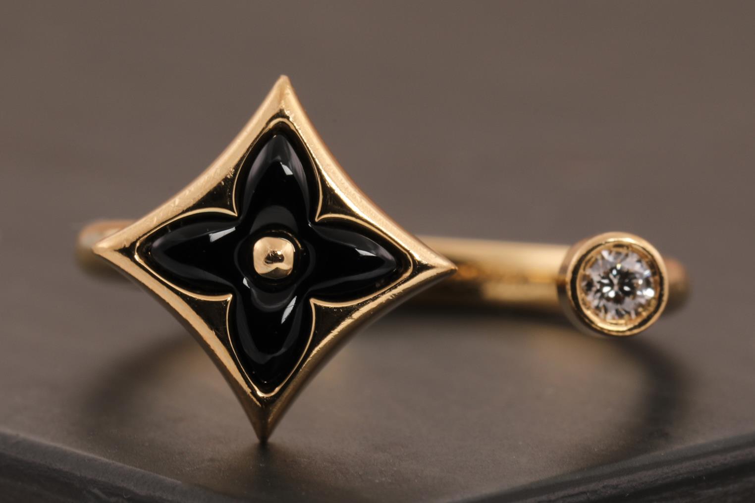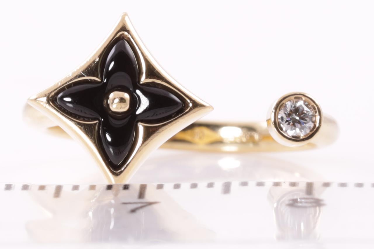 Louis Vuitton Colour Blossom Mini Star ring with Onyx and a round Diamond of 0.04ct. Motif 9.5mm. 18ct yellow gold. Made in France. Louis Vuitton stamped size 50, L - ring resizing is not recommended. Weight: 3.3g. With Louis Vuitton box. (Pre-owned)